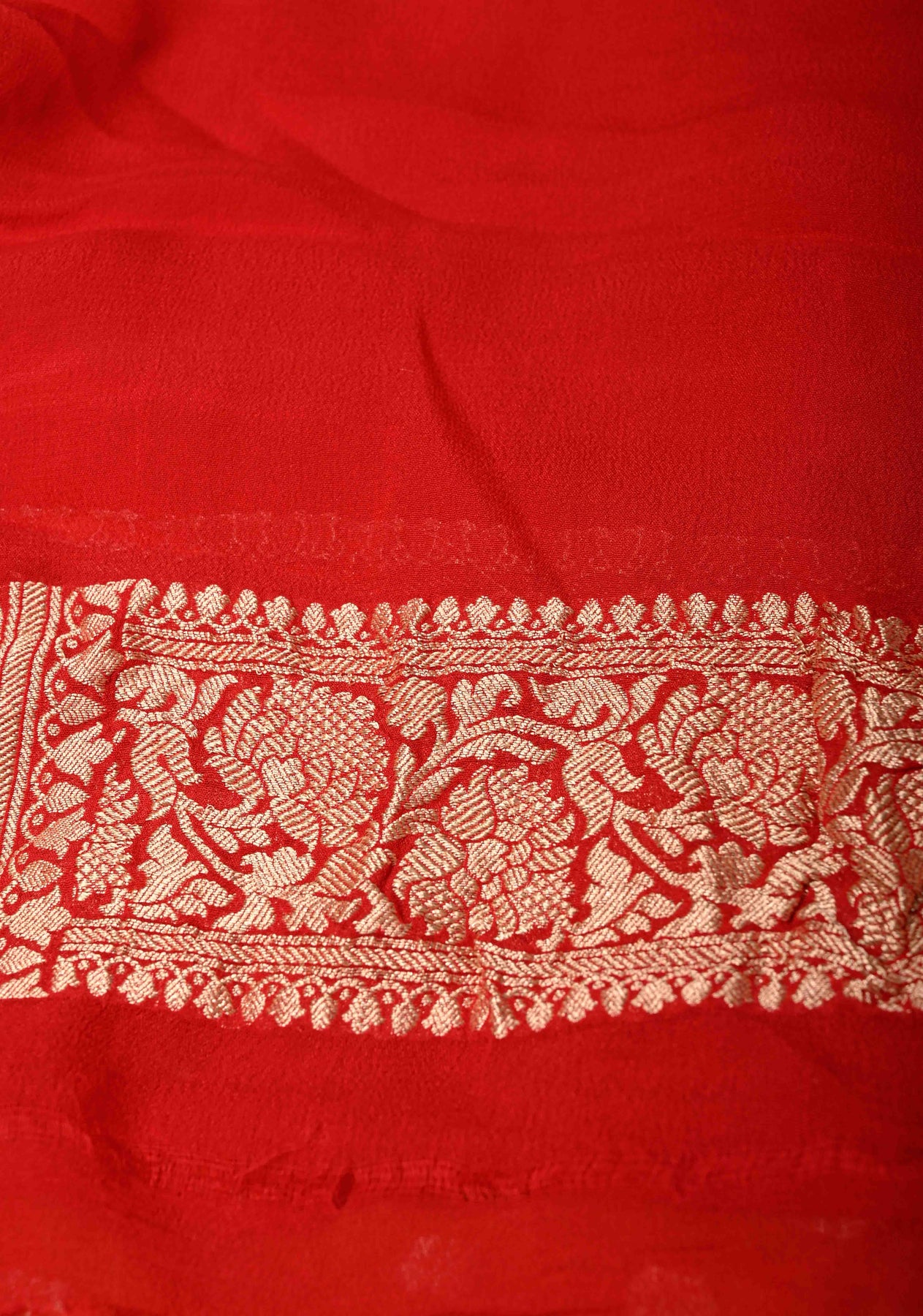 Make a bold and beautiful statement with this Orange Banarasi Georgette Silk Saree, featuring exquisite floral brocade that brings intricate artistry to life. Crafted from lightweight georgette silk, this saree drapes gracefully, offering comfort and style in every fold.
