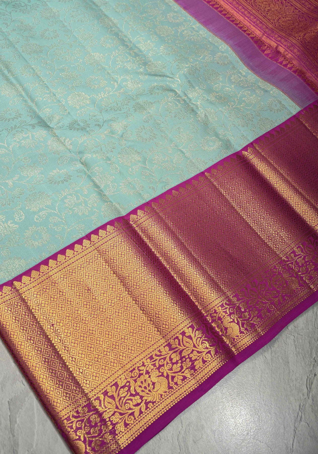 Radiate sophisticated charm in this Pastel Sky Blue Kanjivaram Pure Silk Saree. The serene blue body is exquisitely adorned with an all-over silver Zari floral jaal brocade, creating a delicate, shimmering texture. A striking contrast Rani Pink wide border provides a regal touch, meticulously woven with traditional gold Zari floral patterns. Complete with an opulent magenta pallu, this heritage masterpiece perfectly balances soft pastel tones with vibrant, festive elegance