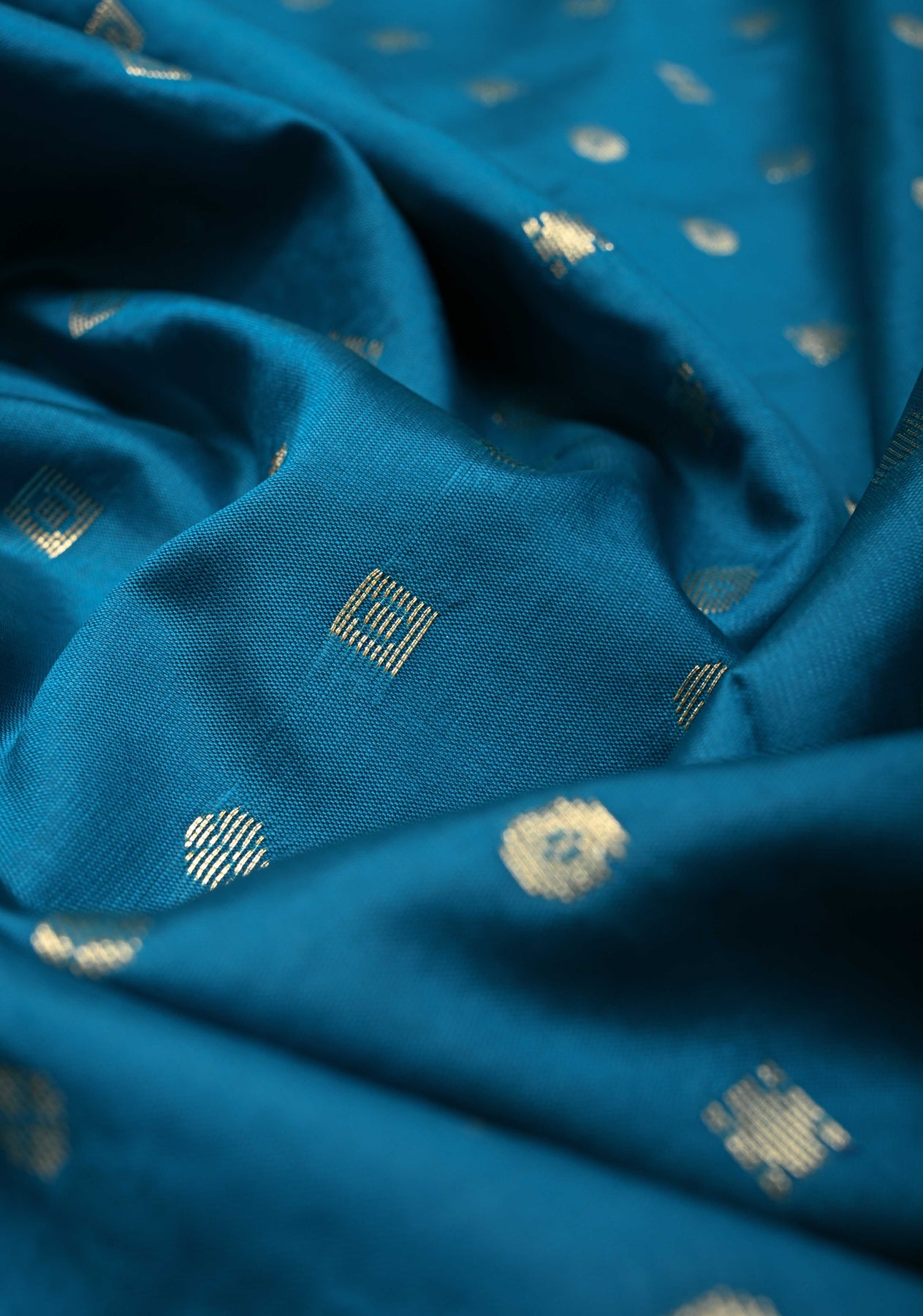 This Peacock Blue Semi Silk Saree exudes timeless elegance and graceful charm. Crafted from semi silk, it features delicate Zari buttis artfully scattered across the body, adding a subtle shimmer and sophistication. The saree is enhanced with a finely detailed Meenakari border, showcasing exquisite craftsmanship and traditional artistry. Lightweight and draping effortlessly, it is perfect for weddings, festive occasions, and special celebrations, making it a versatile and elegant addition to any ethnic wardrobe.