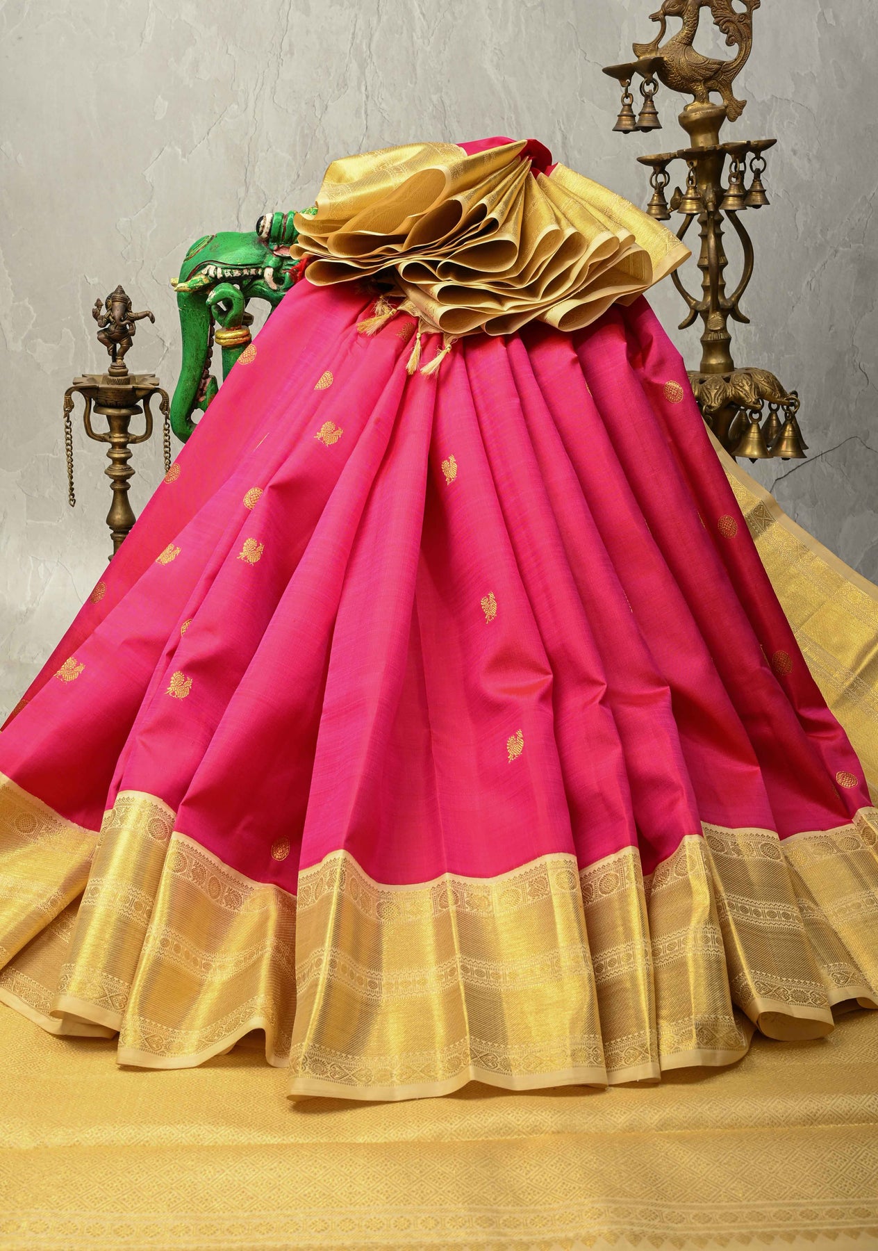 Experience the quintessential charm of our Rani Pink Kanjivaram Pure Silk Saree, a masterpiece of bridal elegance. The vibrant fuchsia body is exquisitely detailed with shimmering gold zari buttas, radiating a royal glow. It features a spectacular Korvai border in a striking contrast shade, meticulously hand-joined to the body with traditional temple motifs. Handwoven from 100% pure silk, this heritage drape offers a heavy, majestic fall, perfect for grand weddings and heirloom collections.