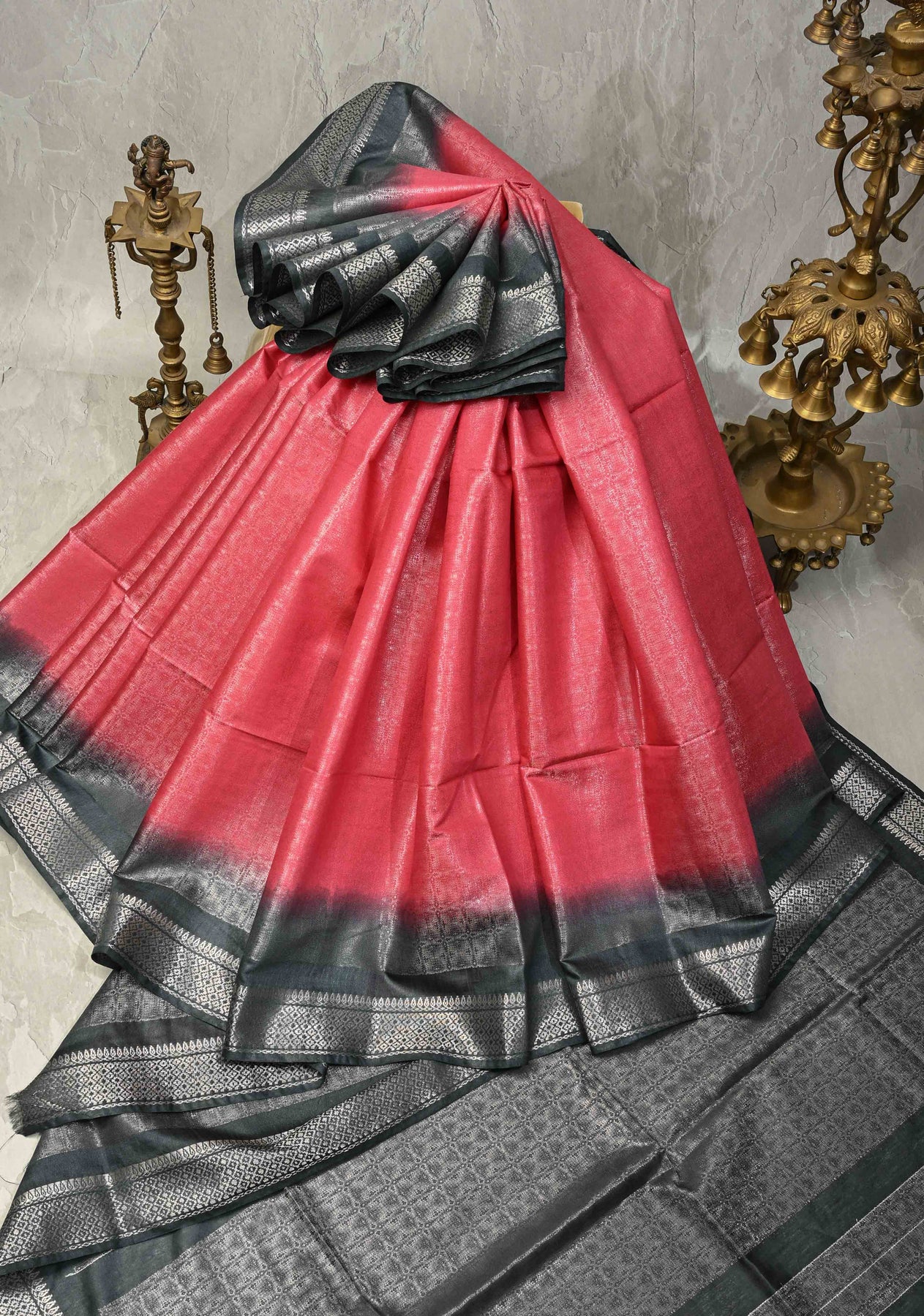 This Pink Semi Tussar Tissue Saree is a beautiful blend of softness and festive elegance. Crafted from semi tussar tissue fabric, it features a delicate sheen that enhances its graceful drape. The saree is accentuated with a striking contrast zari border, adding a touch of traditional richness to the contemporary base. Lightweight and refined, it is perfect for day functions, festive gatherings, and elegant celebrations.