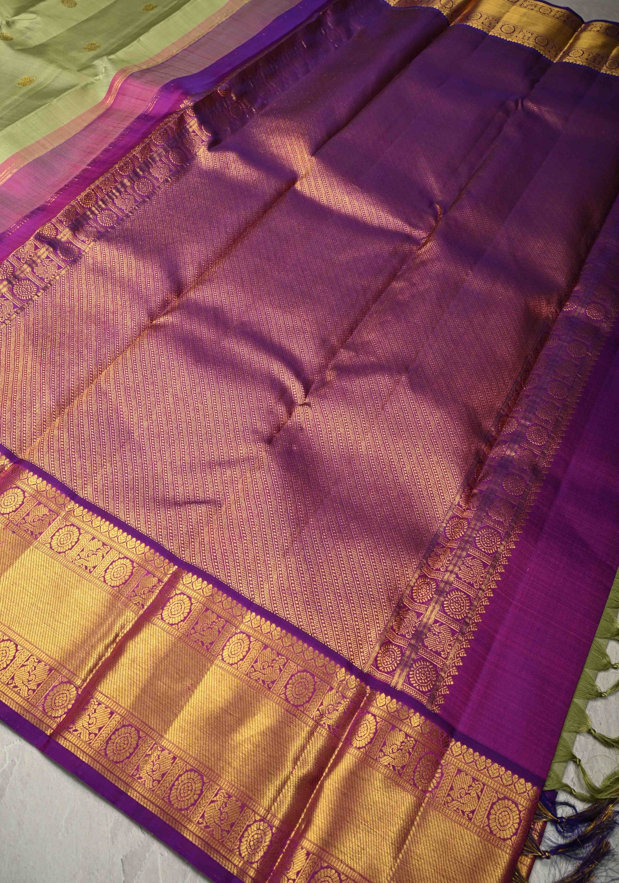The Pista Green Pure Kanjivaram Silk Saree is a timeless blend of elegance and traditional South Indian craftsmanship. Woven from pure Kanjivaram silk, this saree features a soothing pista green base adorned with delicate zari buttas, adding subtle shimmer and refined detail. The contrast zari border enhances the saree’s regal charm, highlighting the exquisite artistry of its weave. Perfect for weddings, festive occasions, and cultural celebrations, this saree is a and graceful addition to any ethnic wardrobe.