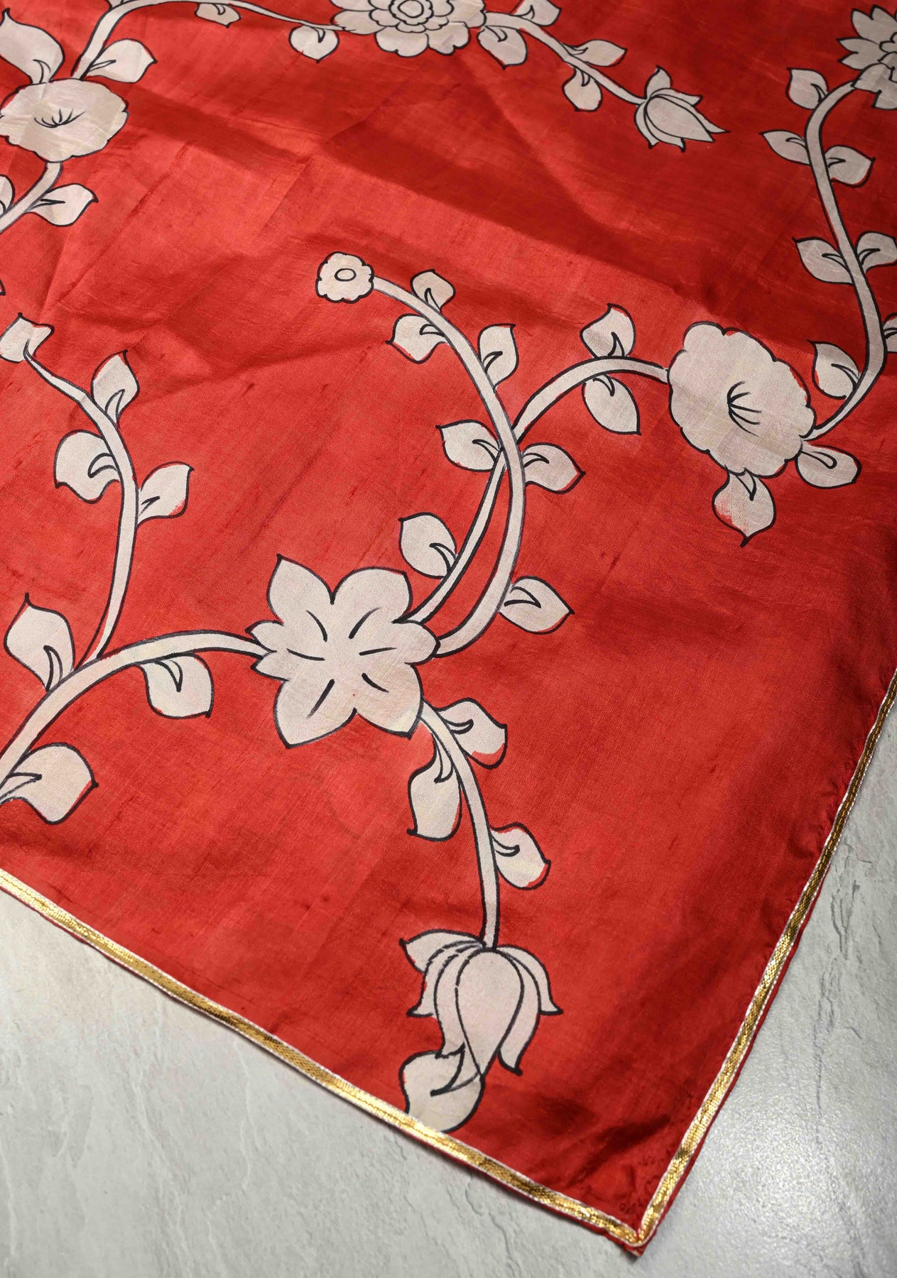 This Dark red pure handloom silk saree is a timeless expression of elegance and craftsmanship, beautifully enhanced with intricate Kalamkari handpainted floral designs that add depth and artistic charm. The silk fabric offers a natural sheen and graceful drape, making it perfect for festive occasions and special celebrations. Delicately finished with a refined lace border, the saree strikes a perfect balance between traditional artistry and contemporary sophistication, reflecting the heritage of skilled artisans while exuding a luxurious and regal appeal.