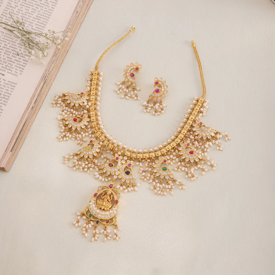 Vrishti Gutta Pasalu Set showcases intricate Floral and Peacock motifs all along with Beautiful Lakshmi Centre motif expertly crafted with sparkling Kundan stones and lustrous Pearls. This elegant design combines traditional artistry with refined sophistication, making it an ideal accessory to elevate formal and festive attire. Carefully detailed, the necklace and earrings offers a timeless appeal that complements a variety of styles.