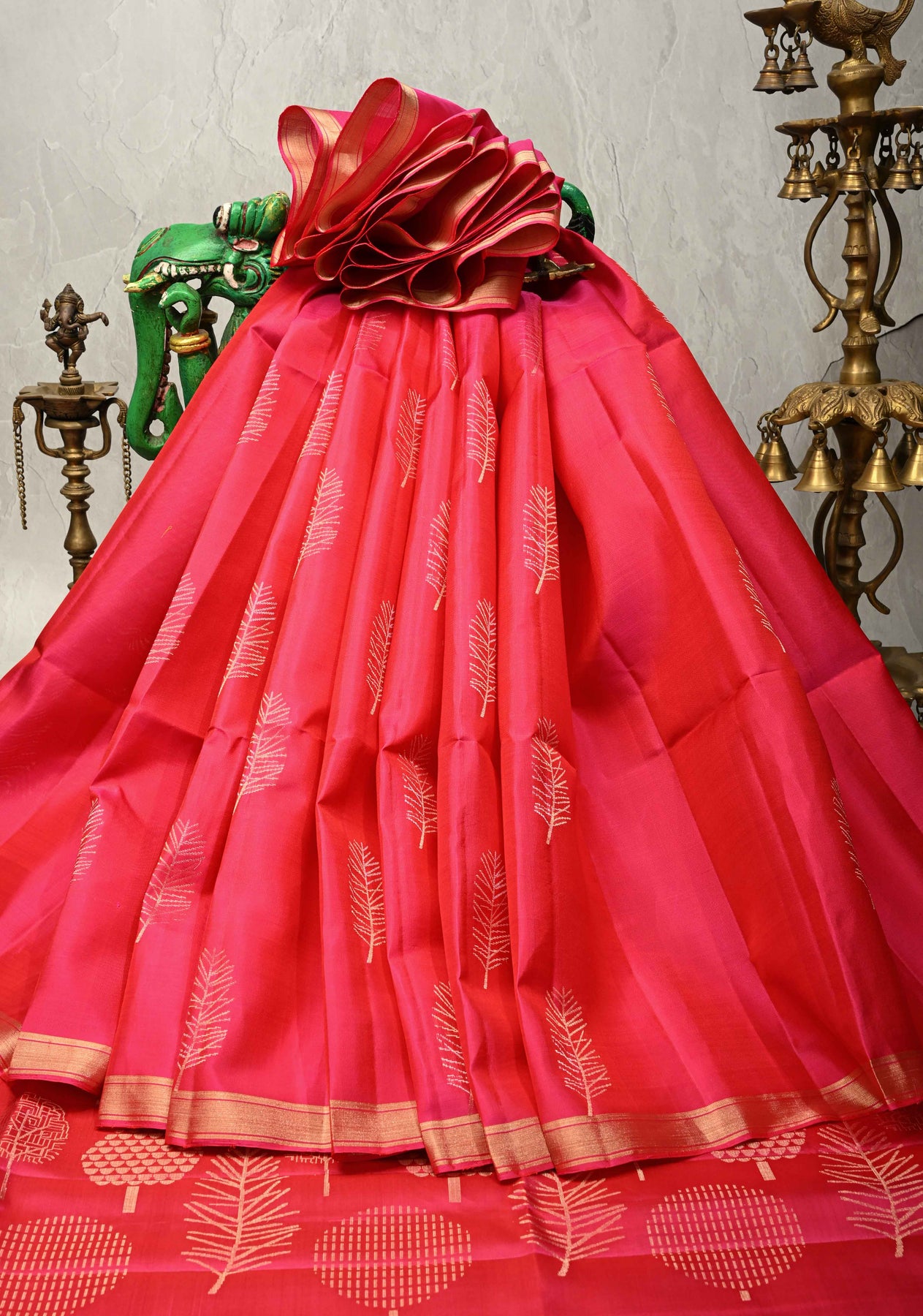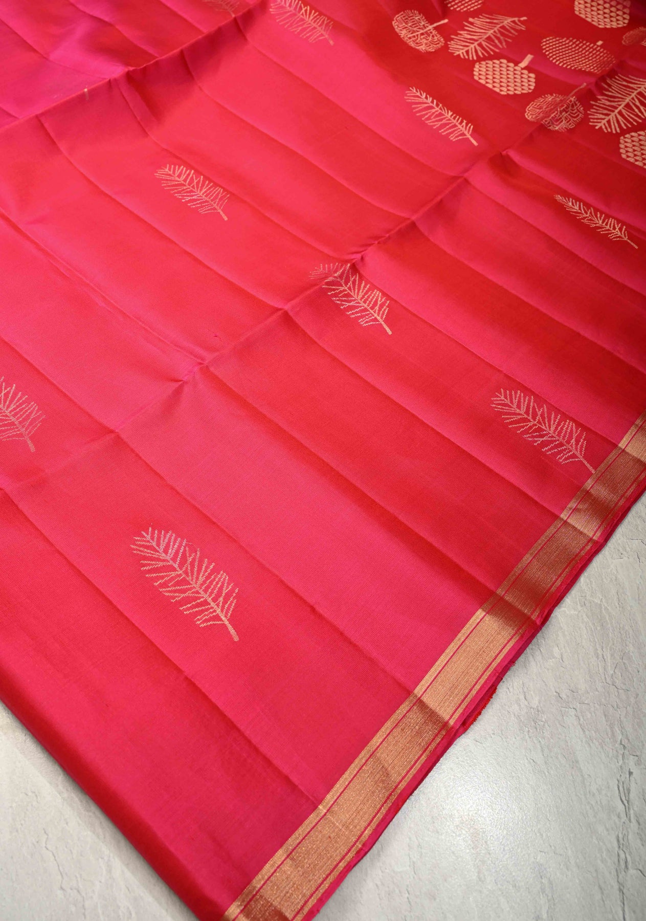 The dual-tone rani pink body is enhanced with delicate tree motifs, symbolizing growth and prosperity, intricately woven to add artistic charm. Completing the look is a minimal zari border, lending understated sophistication while keeping the focus on the elegant motifs. Ideal for weddings, festive gatherings, and traditional ceremonies, this saree is perfect for those who appreciate subtle grandeur.