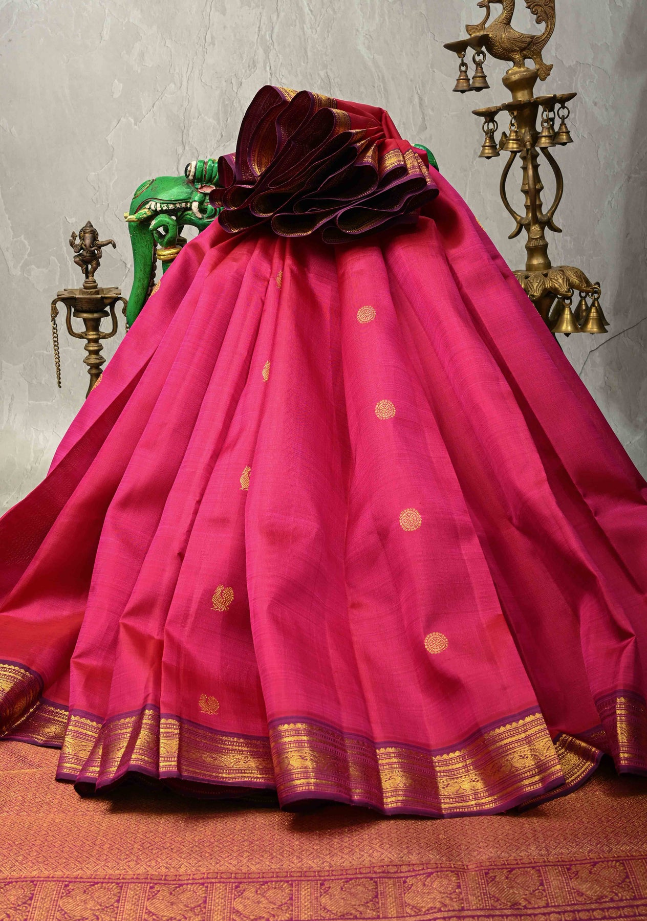 Make a graceful statement with this Rani Pink Dual Tone Pure Kanjivaram Silk Saree, a beautiful blend of vibrant color and timeless tradition. Woven from pure Kanjivaram silk, the saree is adorned with delicate zari buttas that add a subtle shimmer across the body. The contrast zari border lends a clean, elegant finish, enhancing the saree’s dual-tone hues without overpowering its classic charm. Perfect for weddings, festive celebrations, and refined traditional occasions, this saree offers a sophisticated drape and enduring elegance.