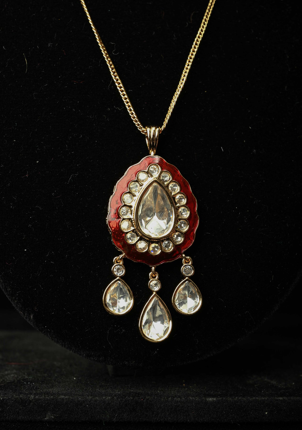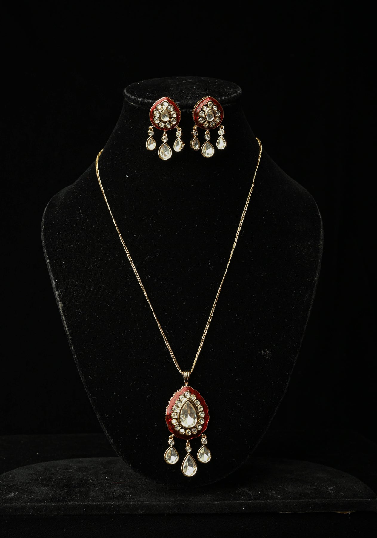 The Red Stone Pendant Necklace with Earrings is a captivating jewelry set that combines elegance with vibrant charm. The necklace features a beautifully crafted pendant adorned with striking red stones, exuding a bold yet graceful appeal. The matching earrings complement the pendant perfectly, creating a cohesive and stylish look. Ideal for weddings, festive celebrations, or special occasions, this set enhances any outfit with a touch of sophistication and color. With its exquisite detailing and polished finish, the Red Stone Pendant Necklace with Earrings is a must-have accessory for adding timeless beauty and elegance to your jewelry collection.