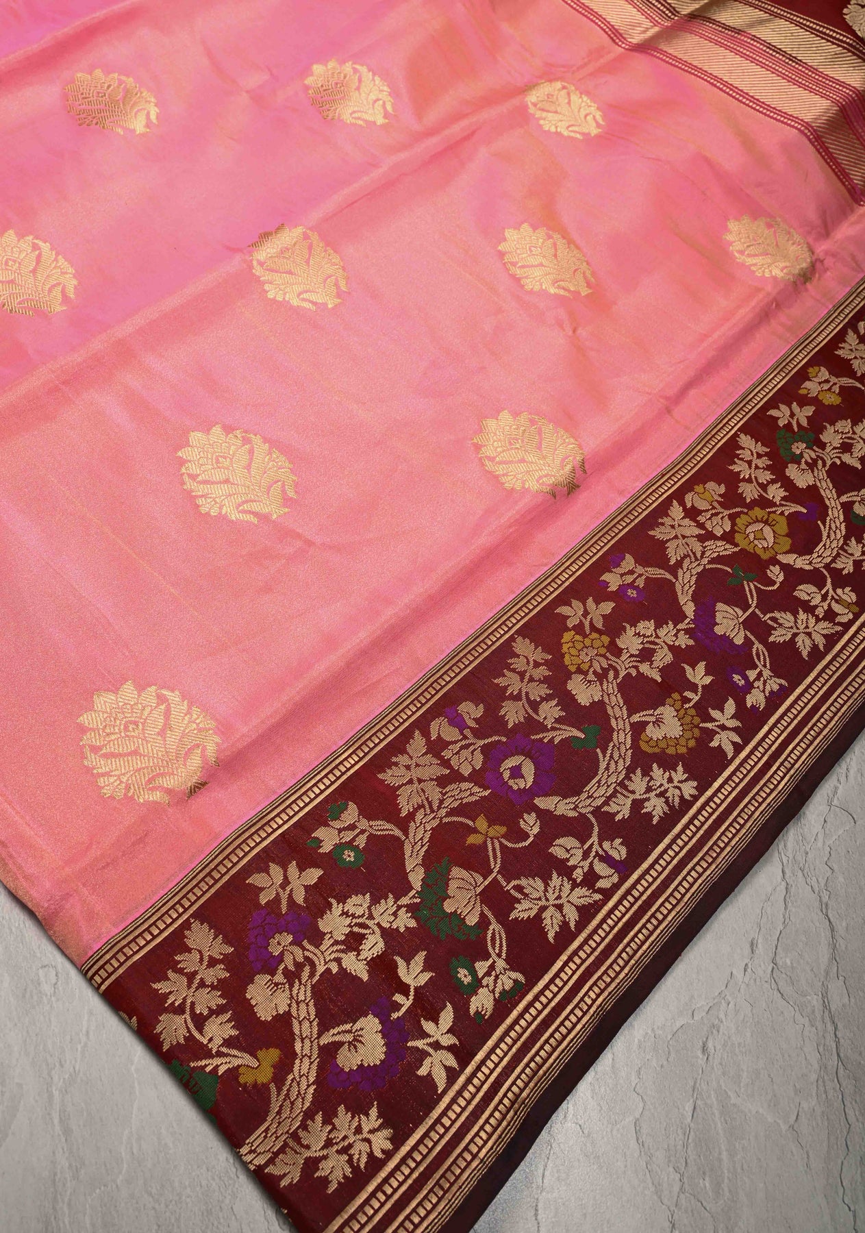The body is adorned with delicately woven floral zari buttas, adding a touch of intricate charm and timeless Banarasi artistry. What truly sets this saree apart is the Meenakari contrast border, featuring vibrant hues and traditional motifs brought to life with fine resham and zari work—creating a stunning frame that adds depth and character to the overall design.