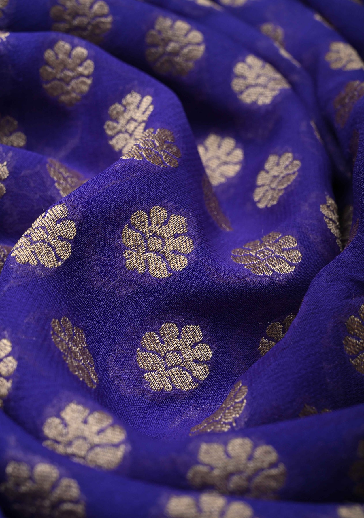 Drape yourself in regal elegance with this stunning royal blue Banarasi georgette silk saree. The lightweight and fluid georgette silk fabric ensures a graceful fall, making it a comfortable yet luxurious choice. The saree's body is adorned with delicate floral buttas meticulously woven throughout, adding a touch of classic femininity. A shimmering zari border frames the saree, providing a rich contrast and a touch of traditional Banarasi opulence. This piece is a perfect fusion of timeless design and contemporary comfort, ideal for evening events and special occasions.