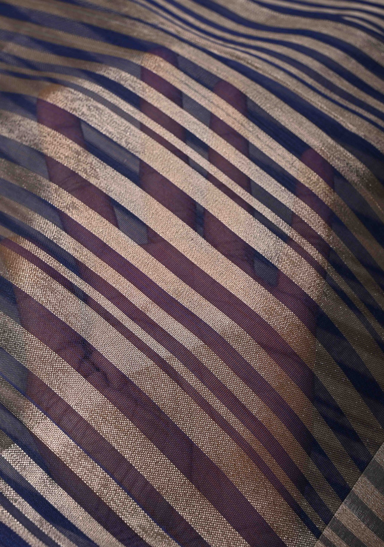 The body of the saree features delicate tissue stripes, adding a gentle metallic sheen that enhances the bold royal blue base with a touch of modern sophistication. These subtle stripes reflect light beautifully, creating a soft shimmer that elevates the overall look.
