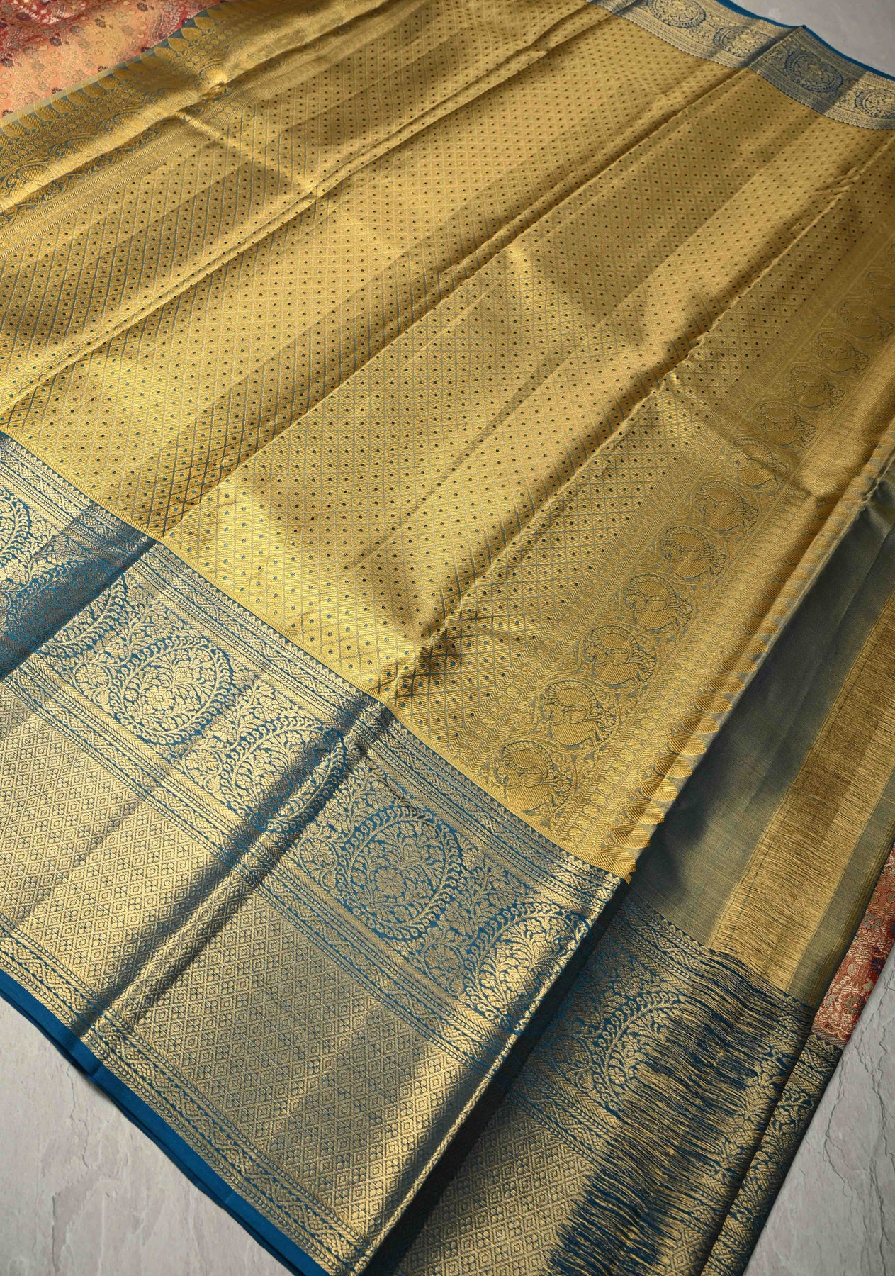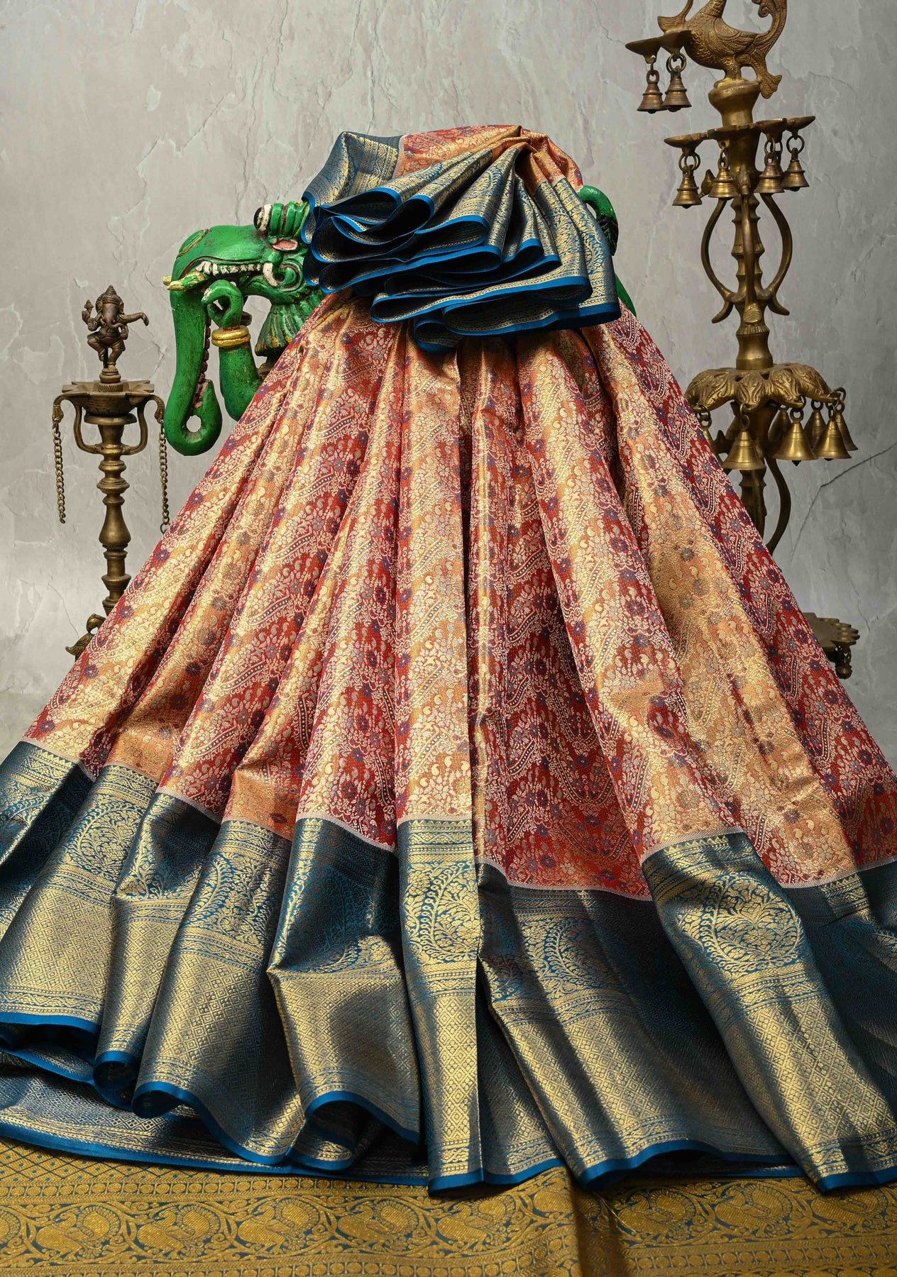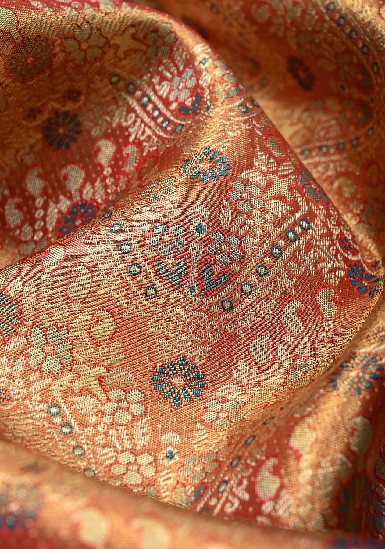 Make a grand entrance in our Rust Red Pure Kanjivaram Tissue Silk Saree, a radiant masterpiece of bridal opulence. The luminous tissue base exudes a metallic glow, beautifully enriched by an intricate Meenakari Floral Brocade Jaal that weaves vibrant blossoms across the fabric. A striking contrast zari border adds a regal frame, showcasing timeless heritage motifs. Handcrafted for the modern connoisseur, this saree seamlessly blends fiery warmth with artisanal delicacy—an unforgettable choice for weddings and grand celebrations.
