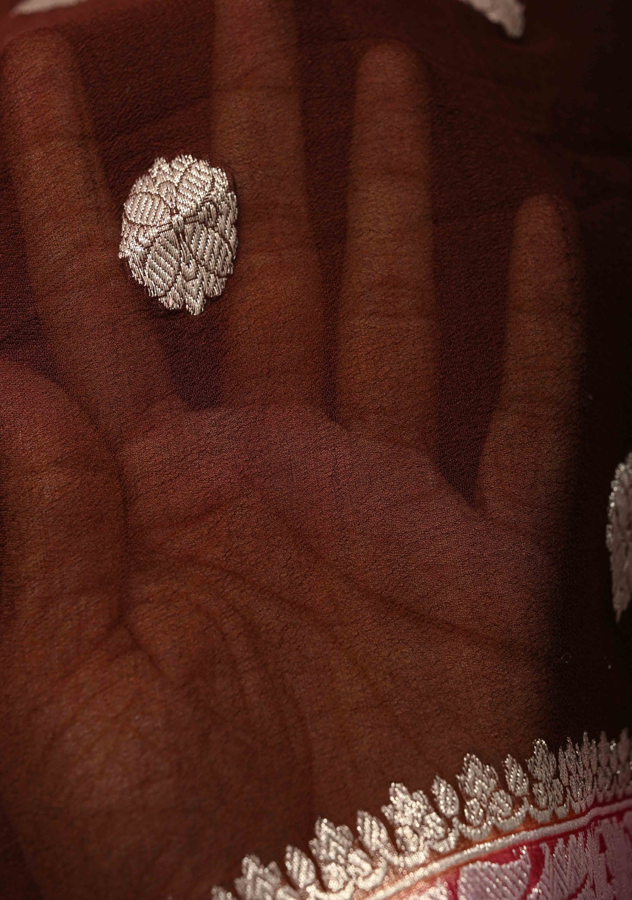 This Coco Brown Banarasi Chiffon Silk Saree with Silver Tone Zari Buttas and Zari Border is a graceful blend of subtle sophistication and Banarasi opulence. Crafted from lightweight chiffon silk, it drapes effortlessly with a soft, flowing texture that exudes timeless elegance. The rich coco brown base is adorned with delicate silver-tone zari buttas scattered across the body, adding a gentle shimmer. A finely woven silver zari border and pallu complete the look, enhancing its refined appeal. Perfect for festive occasions, evening gatherings, or elegant celebrations, this saree is a true symbol of understated luxury and classic charm.