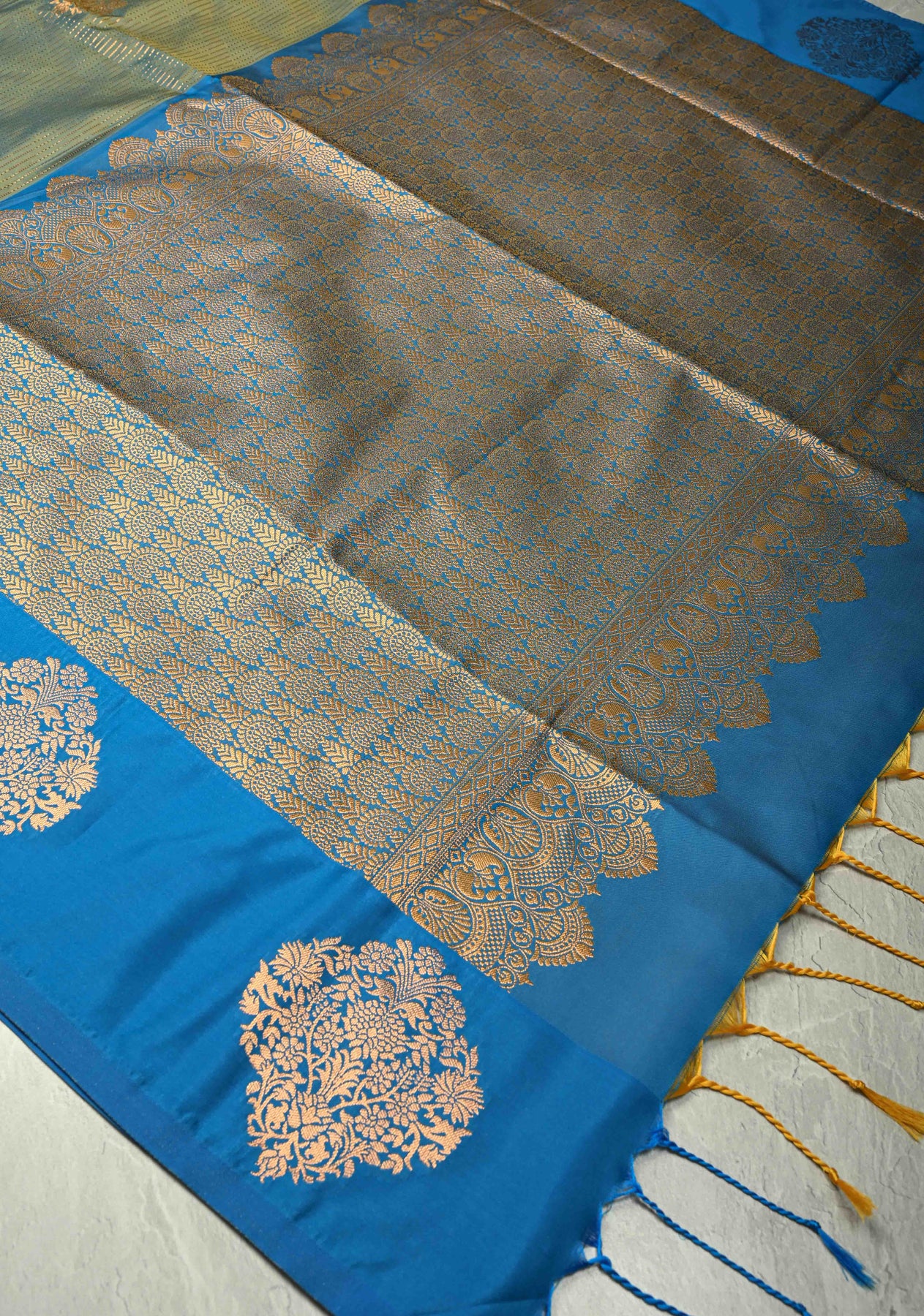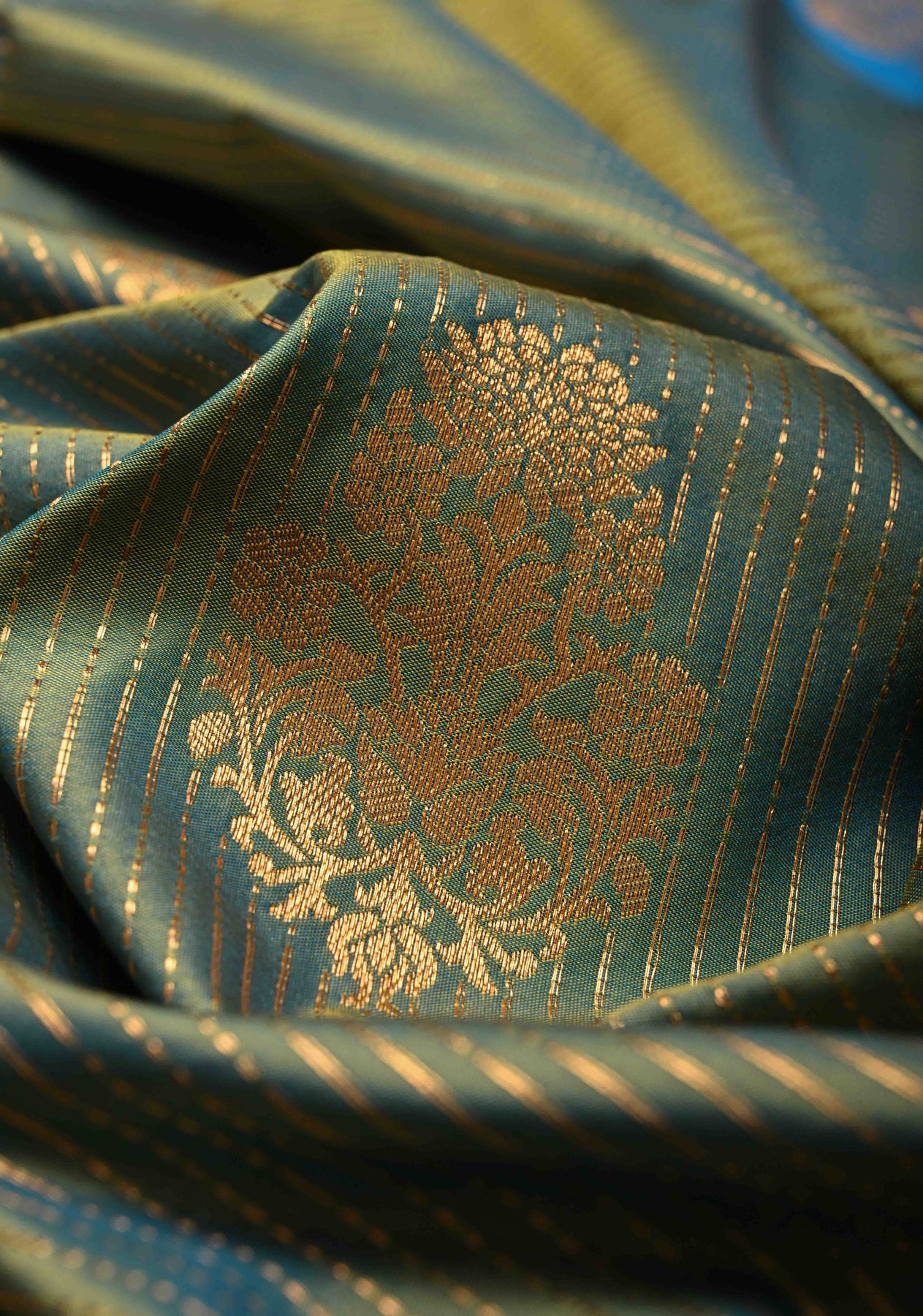 This elegant Sage Green-Blue dual-tone Kanchi semi-silk saree captivates with its soothing yet vibrant color combination and luxurious sheen. The body features vertical zari stripes interspersed with delicate floral buttas, creating a harmonious blend of tradition and elegance. A contrast border with distinct motifs beautifully frames the saree, highlighting the finesse of classic Kanchi craftsmanship. Perfect for weddings, festive occasions, and special celebrations, this saree exudes grace, charm, and timeless sophistication.