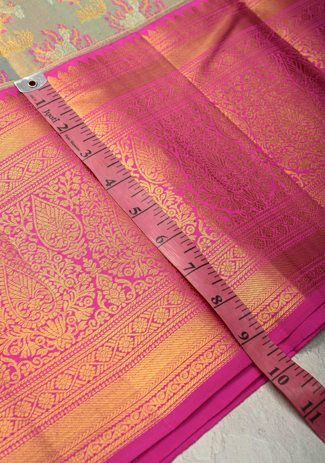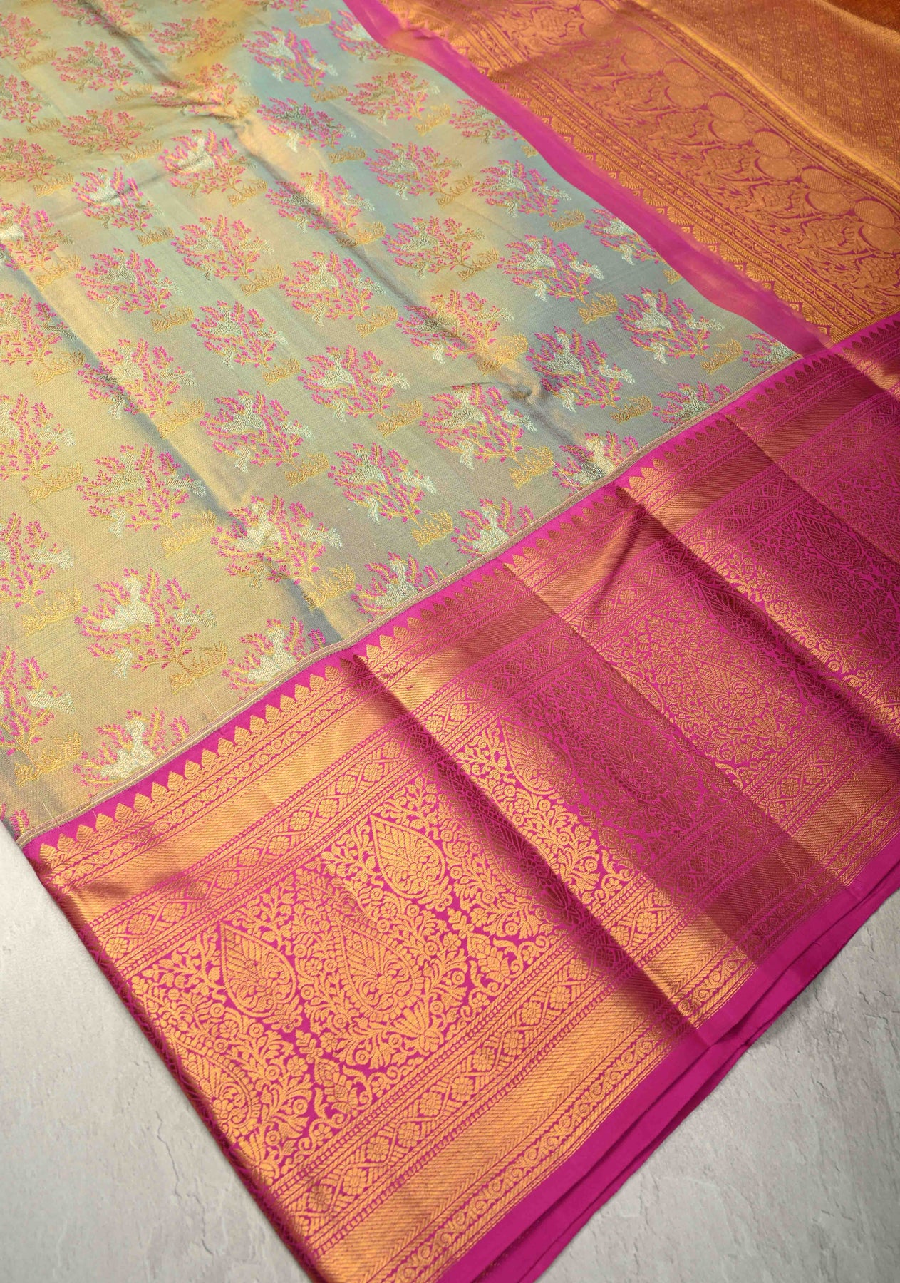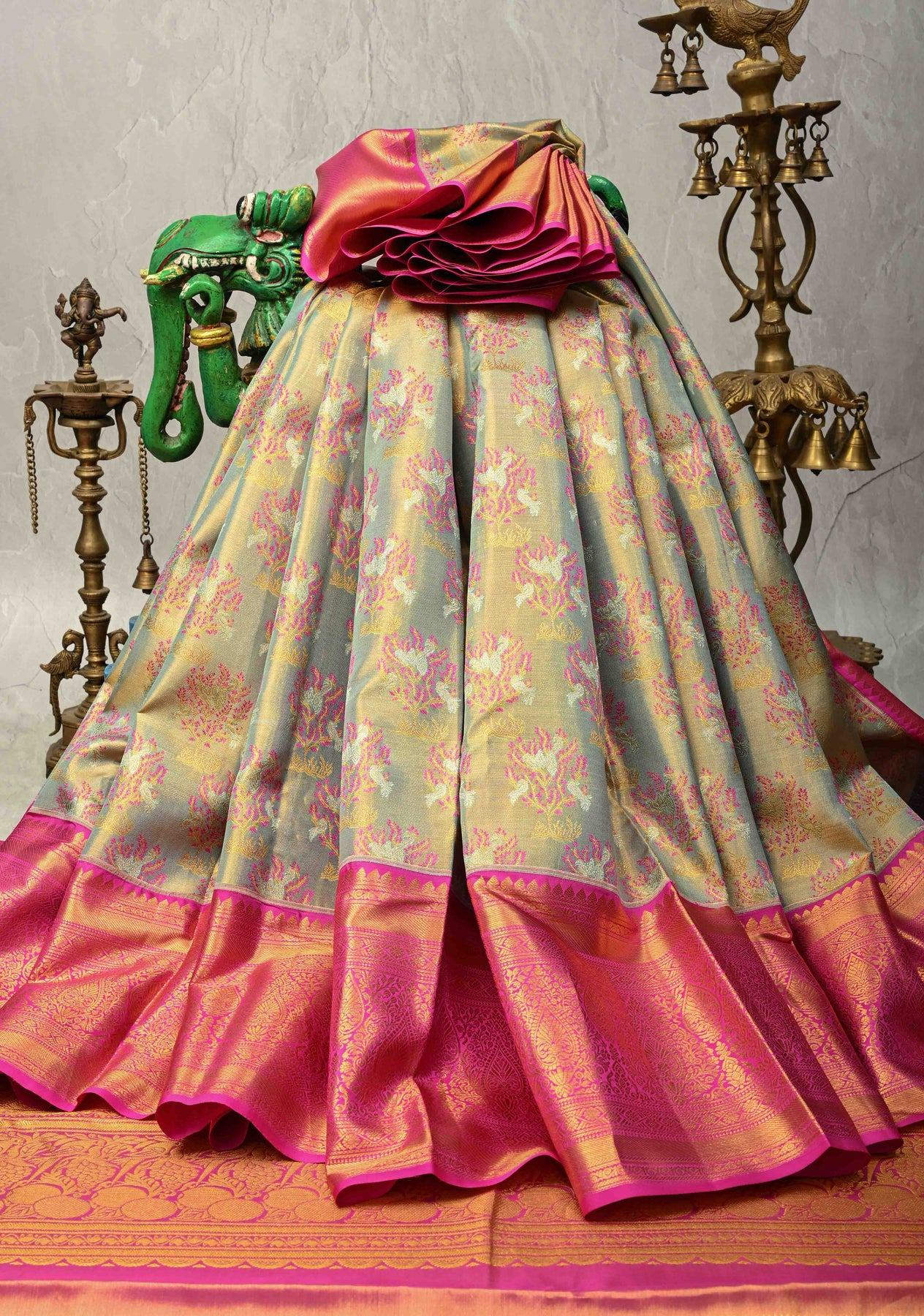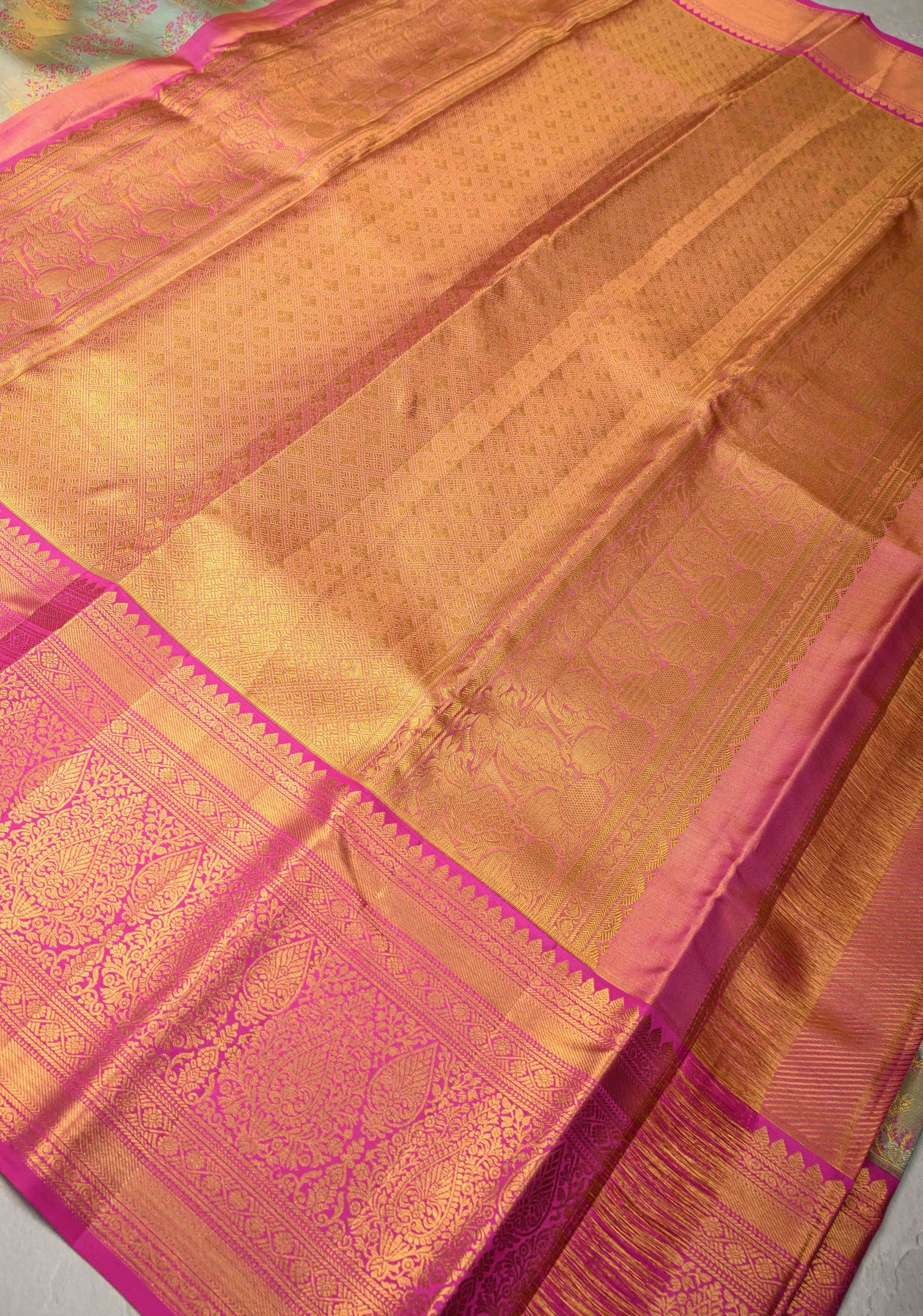 This exquisite Sage Green pure Kanjivaram tissue silk saree embodies timeless elegance and refined craftsmanship. The tissue silk base is beautifully adorned with intricate Meenakari floral brocade motifs, adding rich color and artistic depth to the serene sage green hue. The vibrant Meenakari detailing enhances the luxurious texture of the saree, while the bold contrast zari border lends a regal and striking finish. Complemented by a finely woven zari pallu, this saree is a perfect choice for weddings, festive celebrations, and special occasions that call for classic Kanjivaram grandeur.