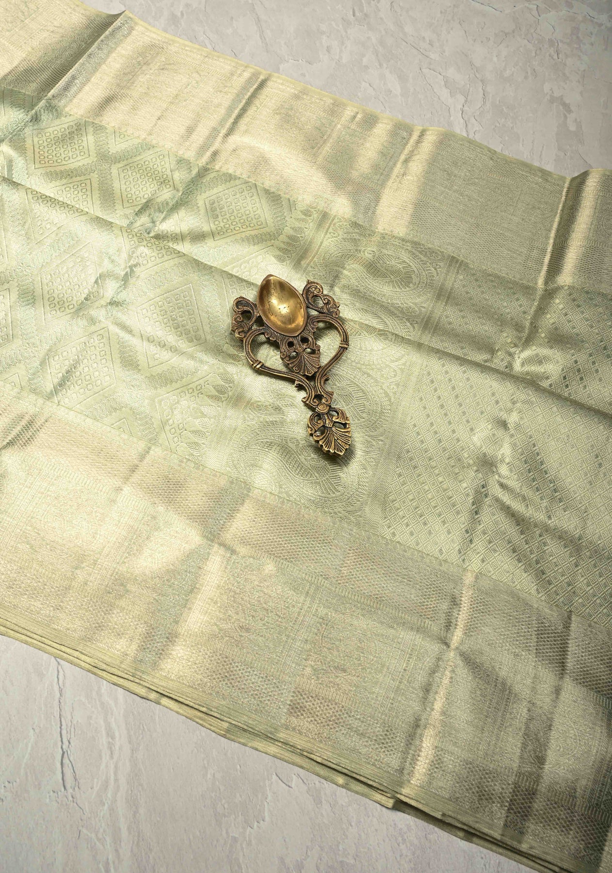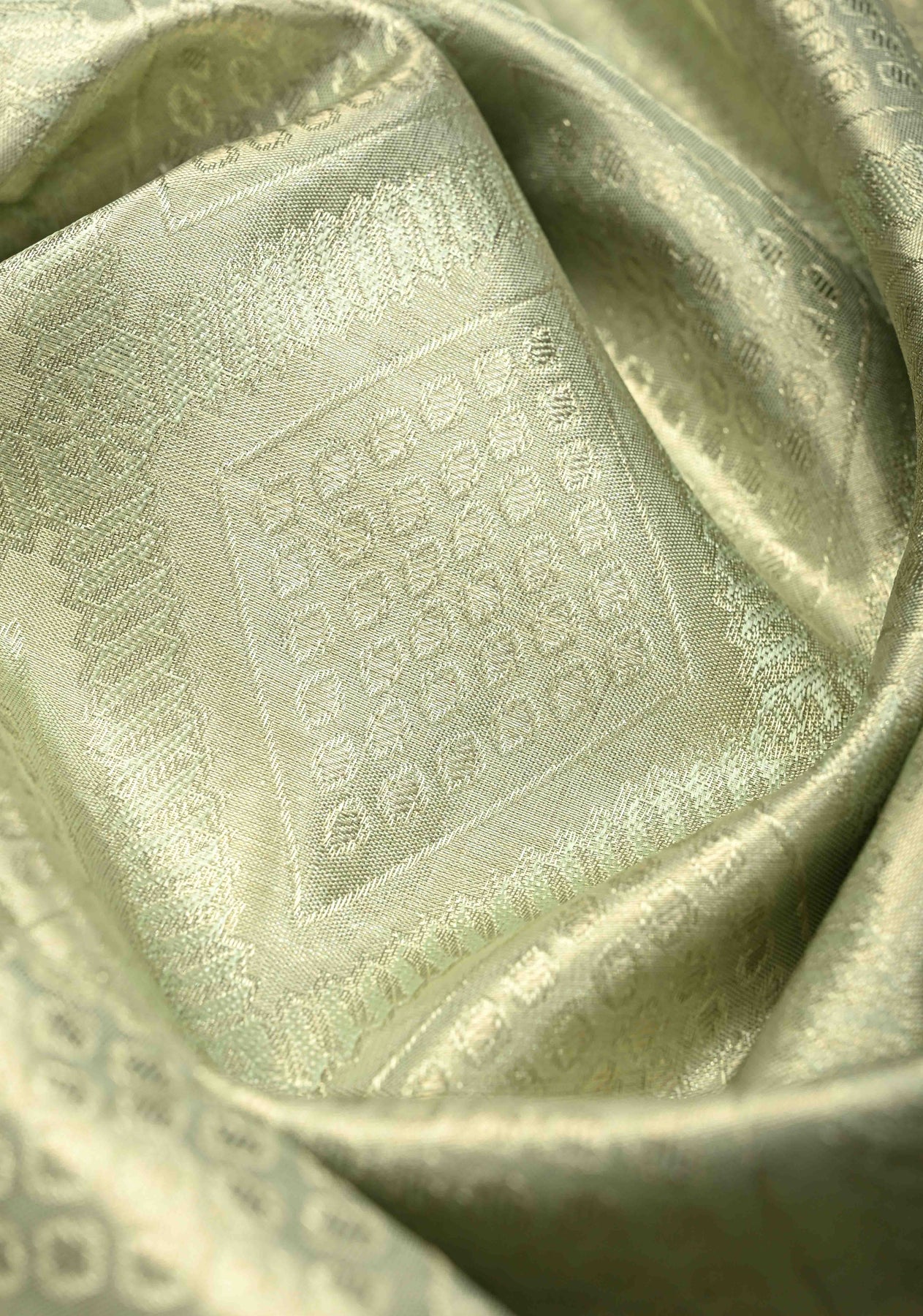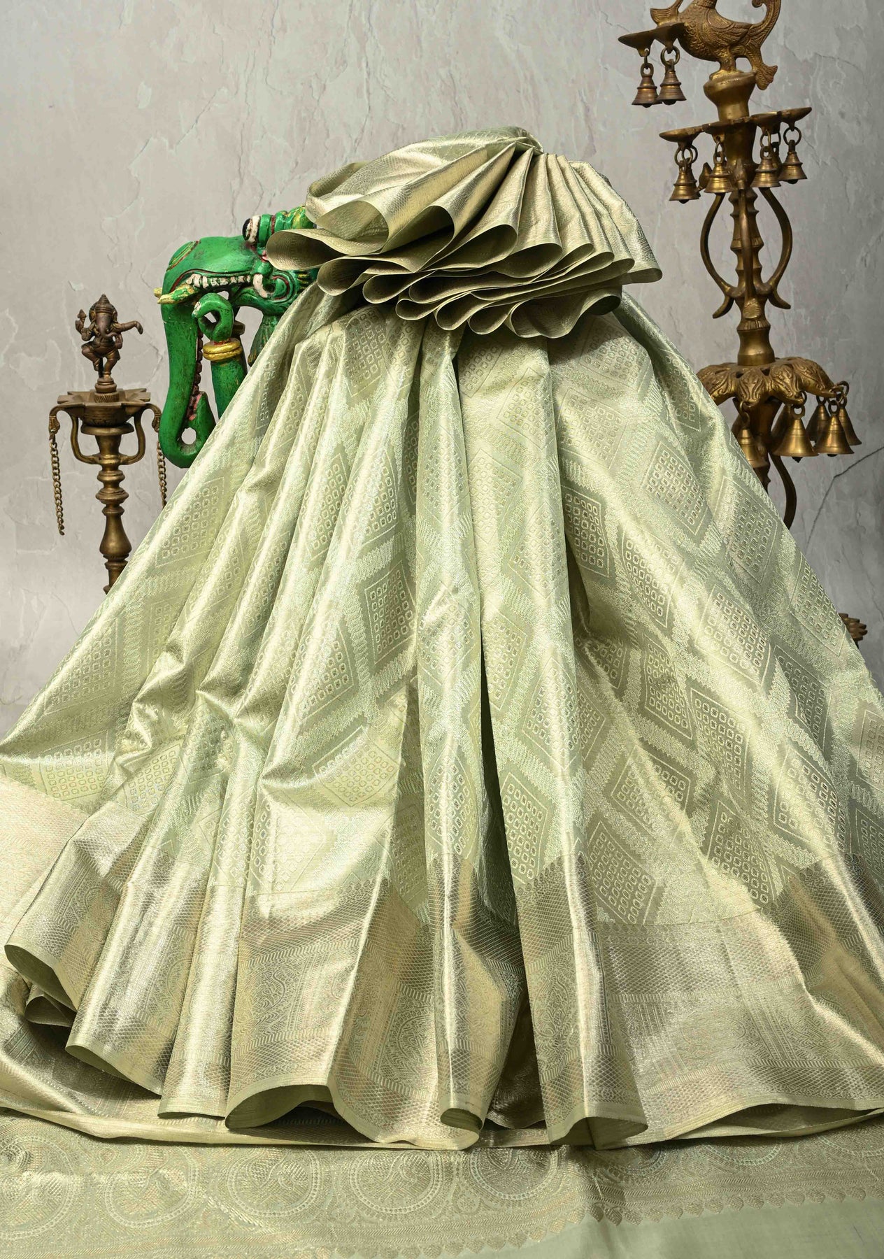 This elegant Sage Green pure Kanjivaram tissue silk saree is a refined expression of traditional craftsmanship and contemporary grace. The tissue silk body is adorned with an intricate Meenakari geometric brocade jaal, creating a striking balance of structure and artistry. Subtle yet vibrant Meenakari hues enhance the sage green base, while the finely woven zari border adds a touch of regal sophistication. Completed with a classic zari pallu, this saree is an ideal choice for weddings, festive occasions, and refined celebrations that celebrate timeless Kanjivaram heritage.