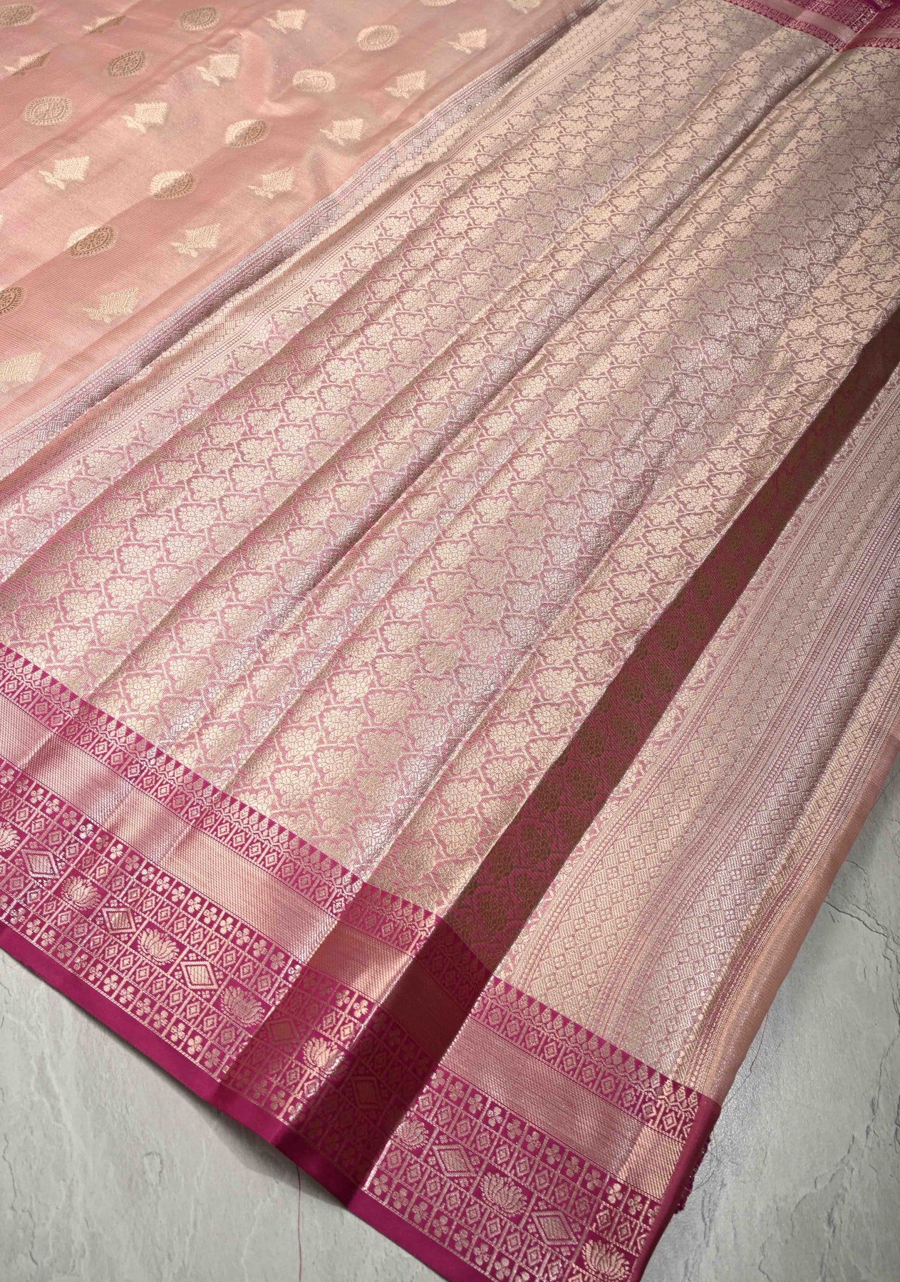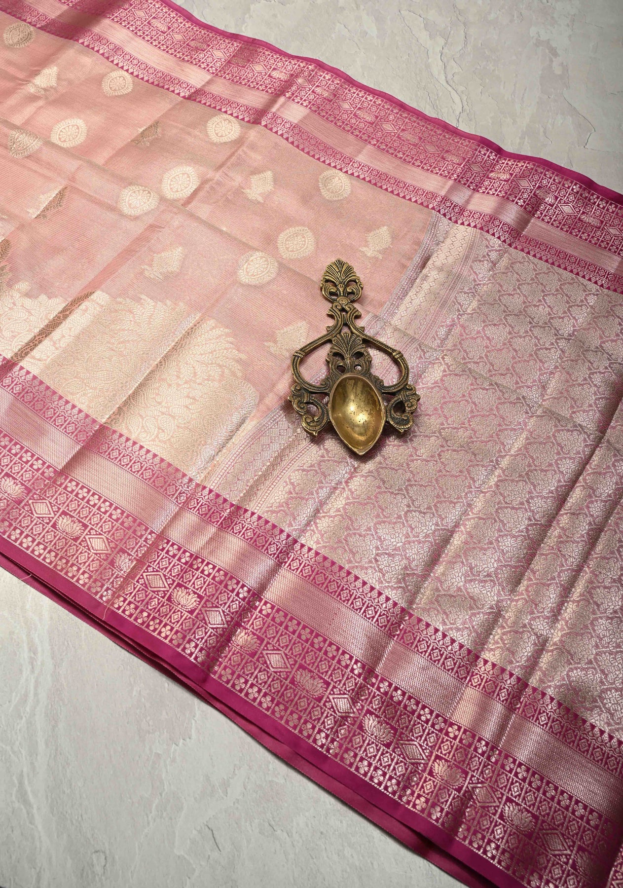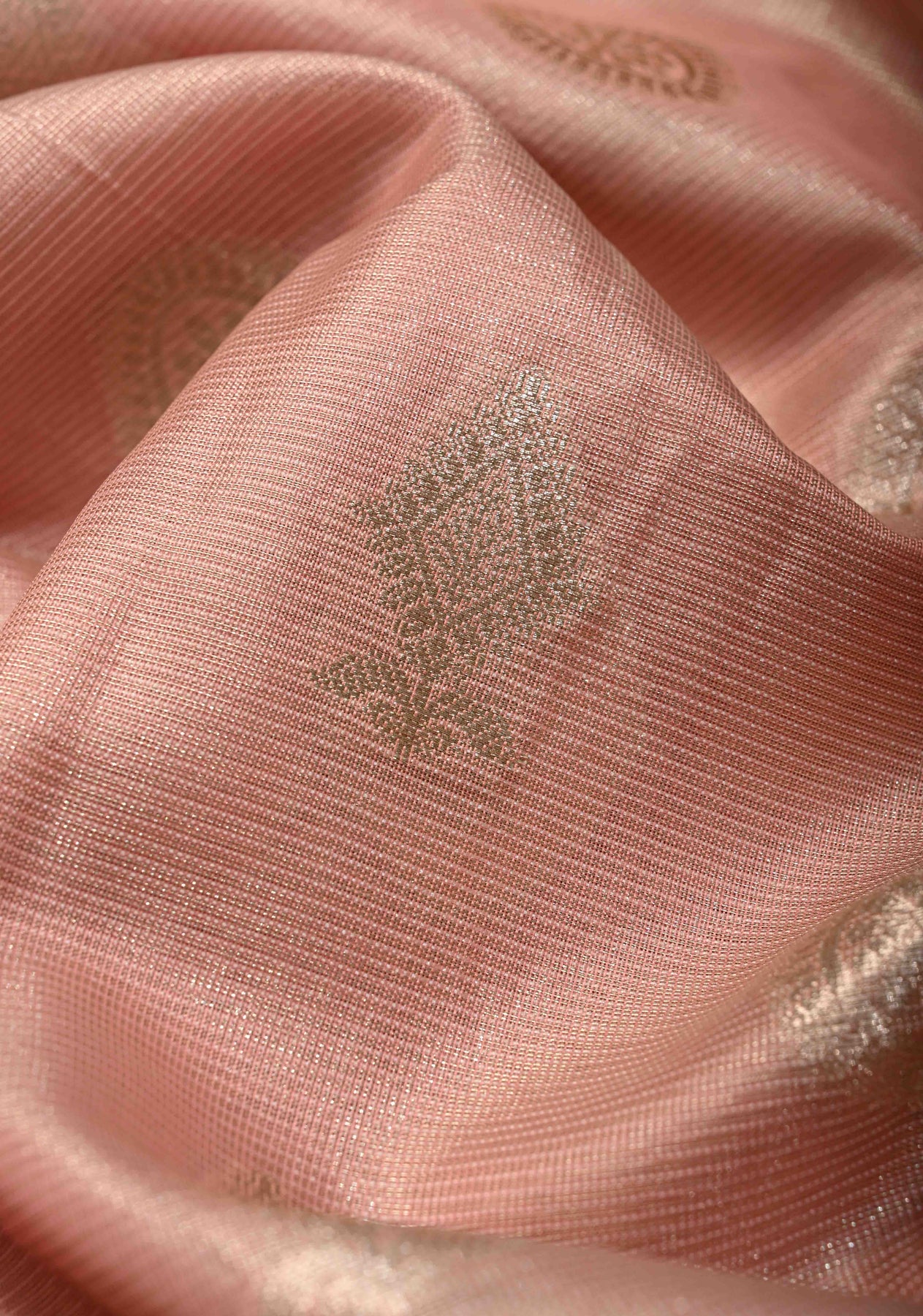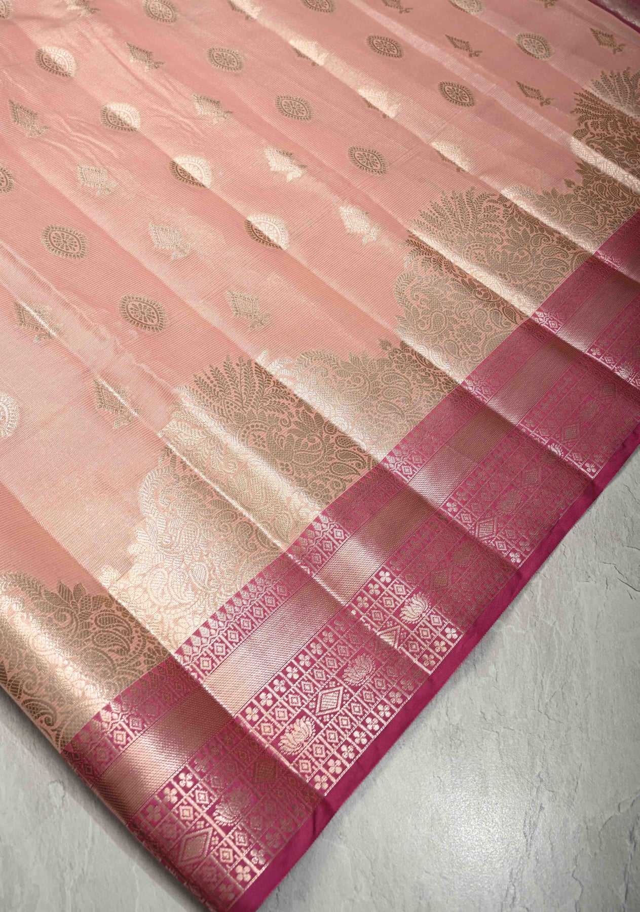 Salmon Pink Kanjivaram Tissue Semi Silk Saree with Zari Buttas and Contrast Zari Border