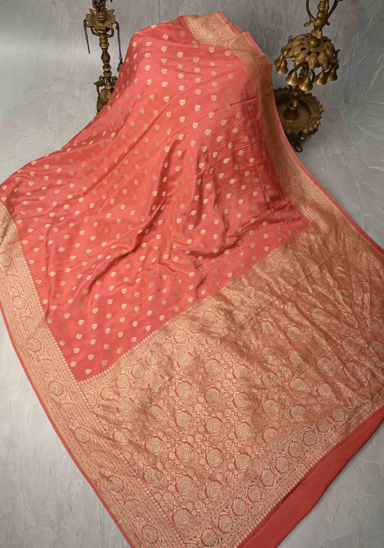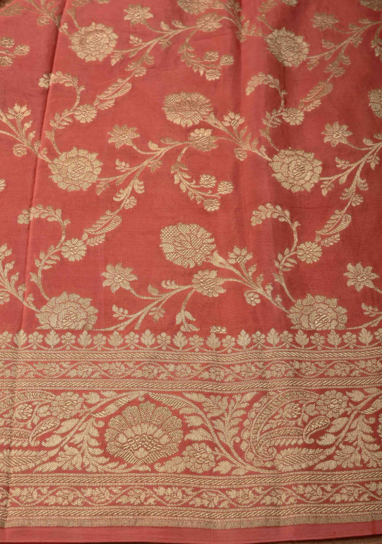The serene salmon pink hue adds a touch of warmth and sophistication, while the richly woven floral brocade zari border infuses the saree with regal charm. Perfect for both daytime festivities and evening gatherings, this saree is ideal for weddings, poojas, and graceful celebrations.