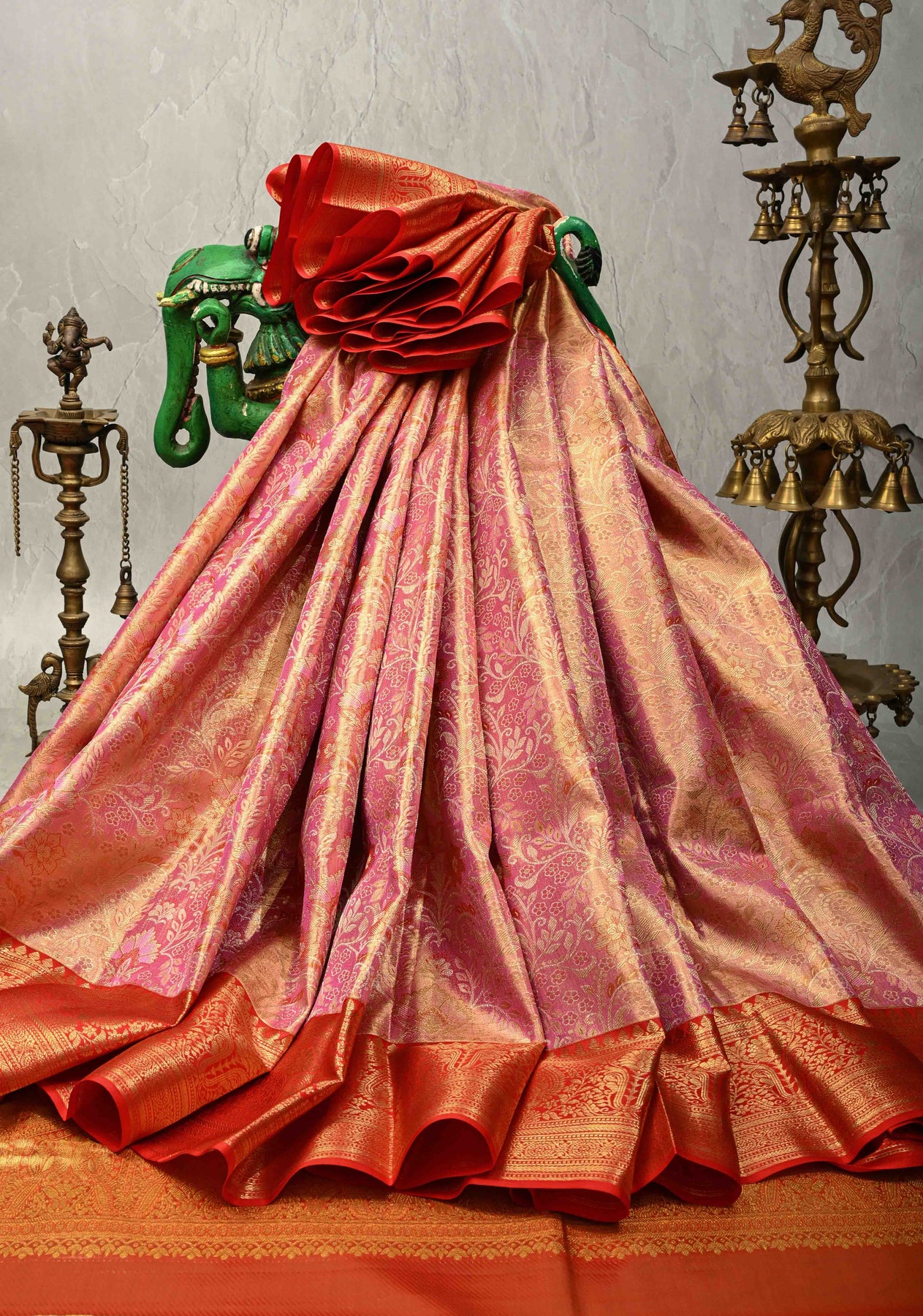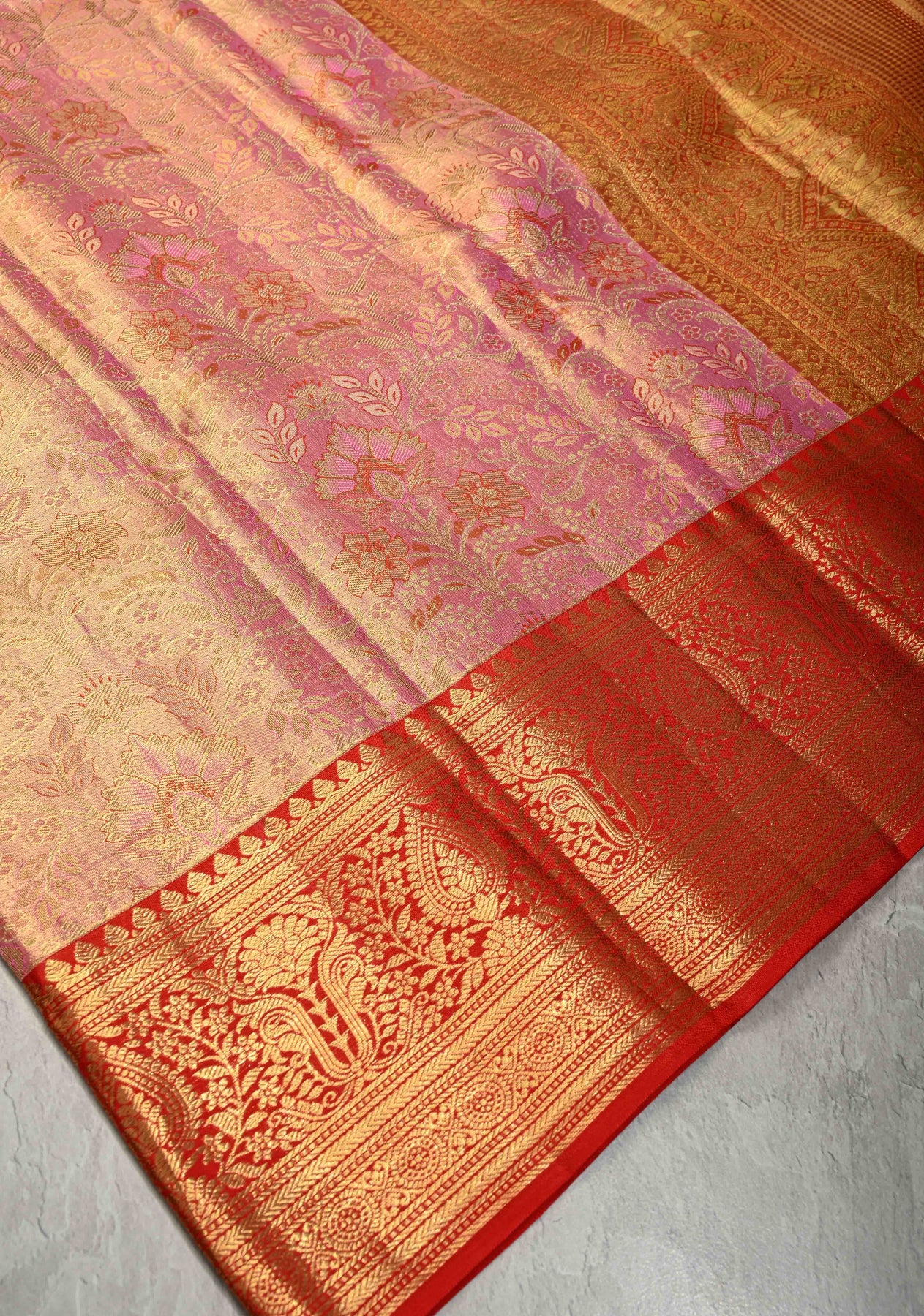 Salmon Pink Tissue Kanjivaram Pure Silk Saree with Meenakari Floral Brocade and Contrast Zari Border | SILK MARK CERTIFIED