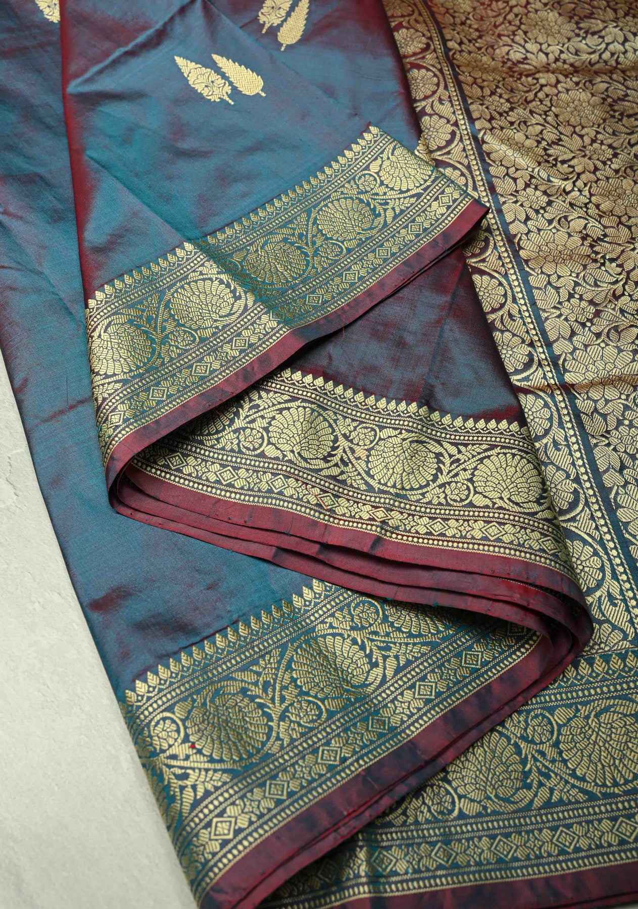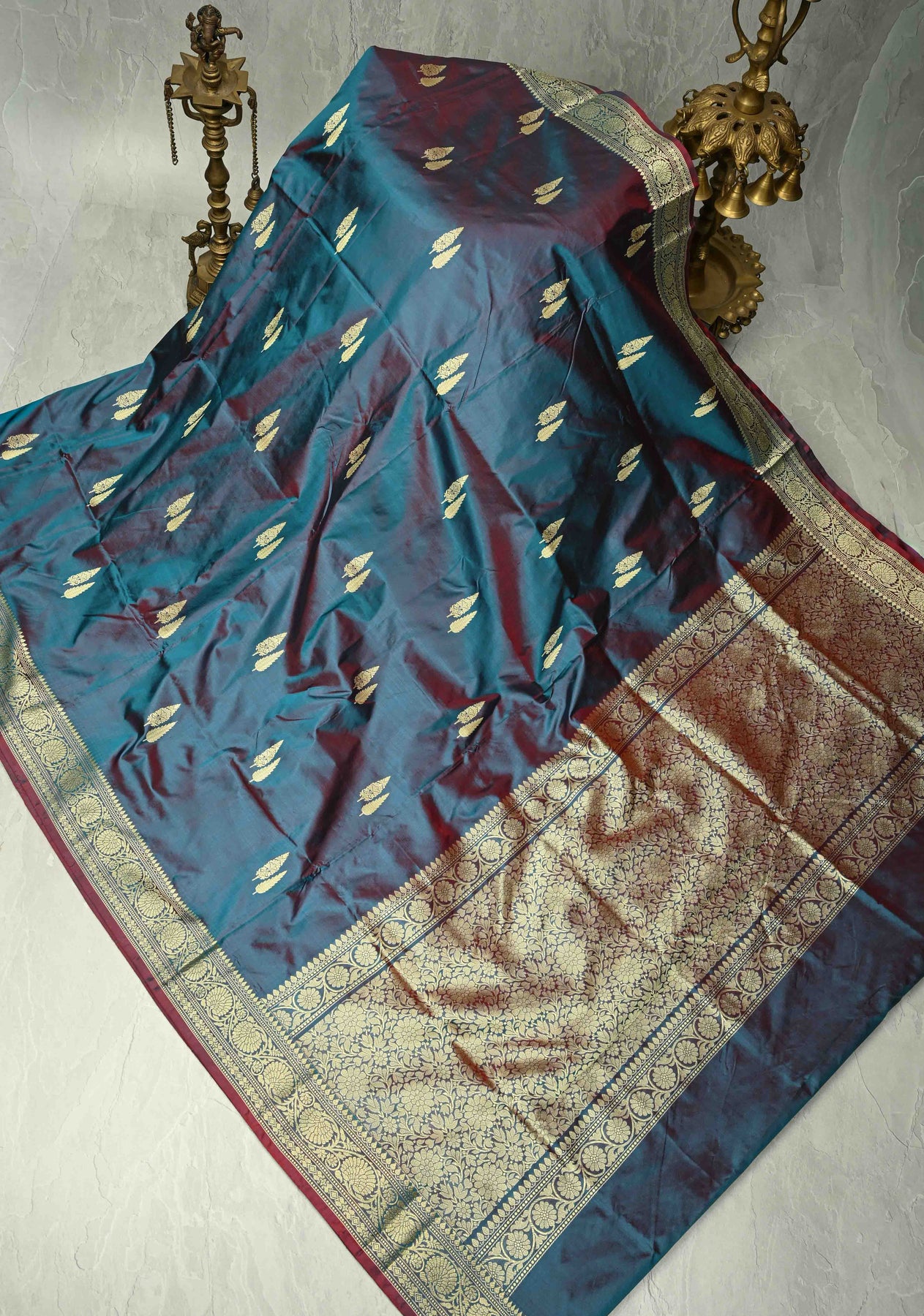 This Peacock Blue Dual-Tone Lightweight Banarasi Katan Silk Saree is a masterpiece of refined elegance and traditional craftsmanship. Woven from fine Katan silk, it features a mesmerizing dual-tone effect that shimmers beautifully with every movement. The saree is adorned with delicate Resham Buttas spread gracefully across the body, while the intricately woven Resham Border adds a touch of regal charm. Light in weight yet rich in appeal, this saree is perfect for festive celebrations, weddings, and special occasions, embodying the luxurious allure of Banarasi artistry.