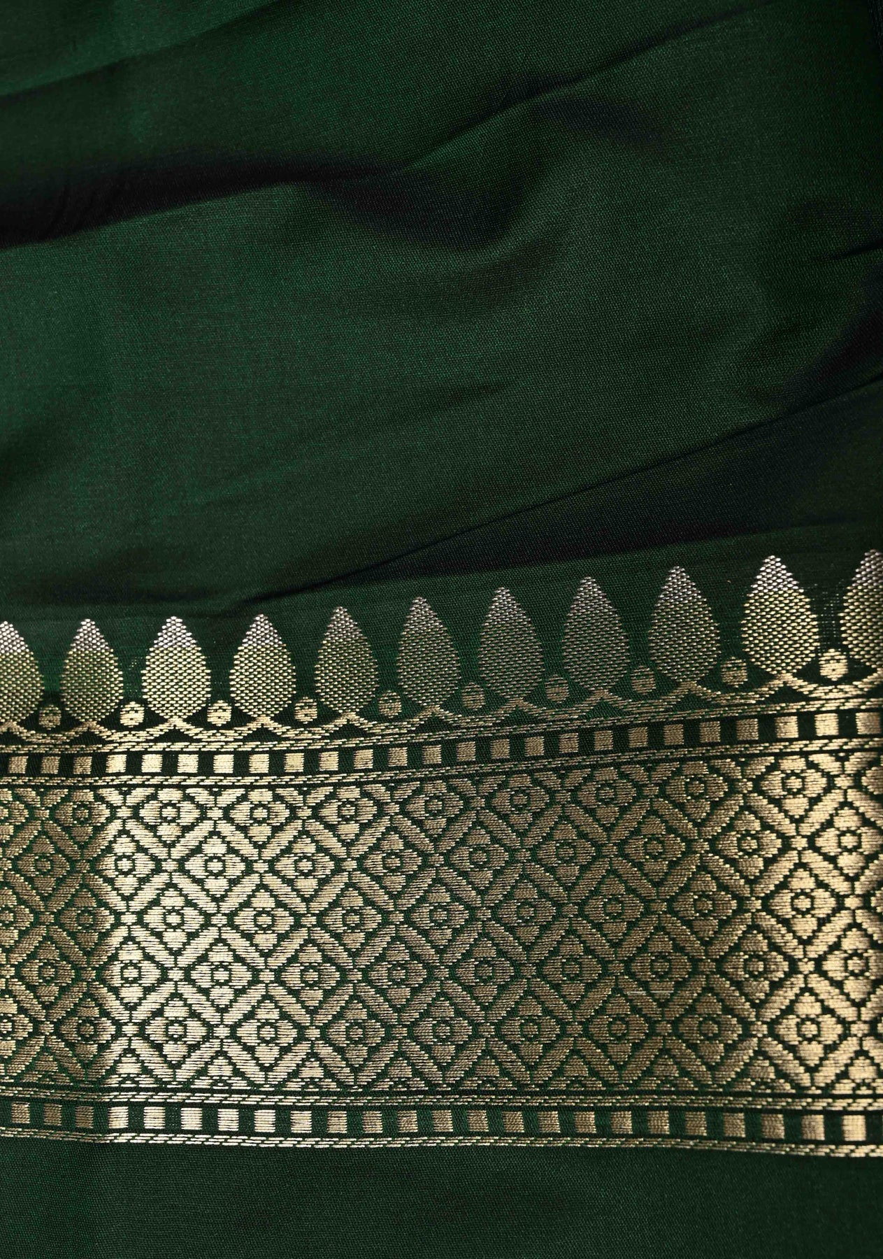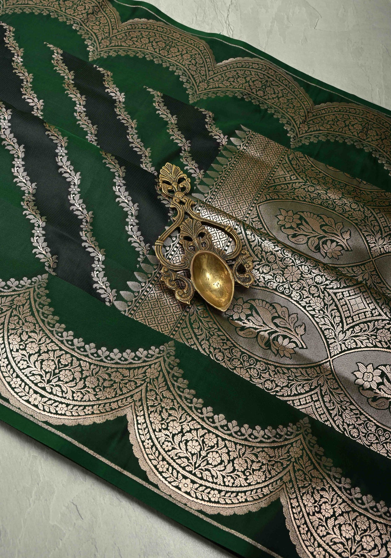 The harmonious blend of green tones creates a refreshing, regal look, while the Leheria-inspired floral pattern adds a unique artistic charm. Perfect for festive events, weddings, cultural celebrations, and grand occasions, this saree combines the heritage of Banarasi craftsmanship with a contemporary color palette.