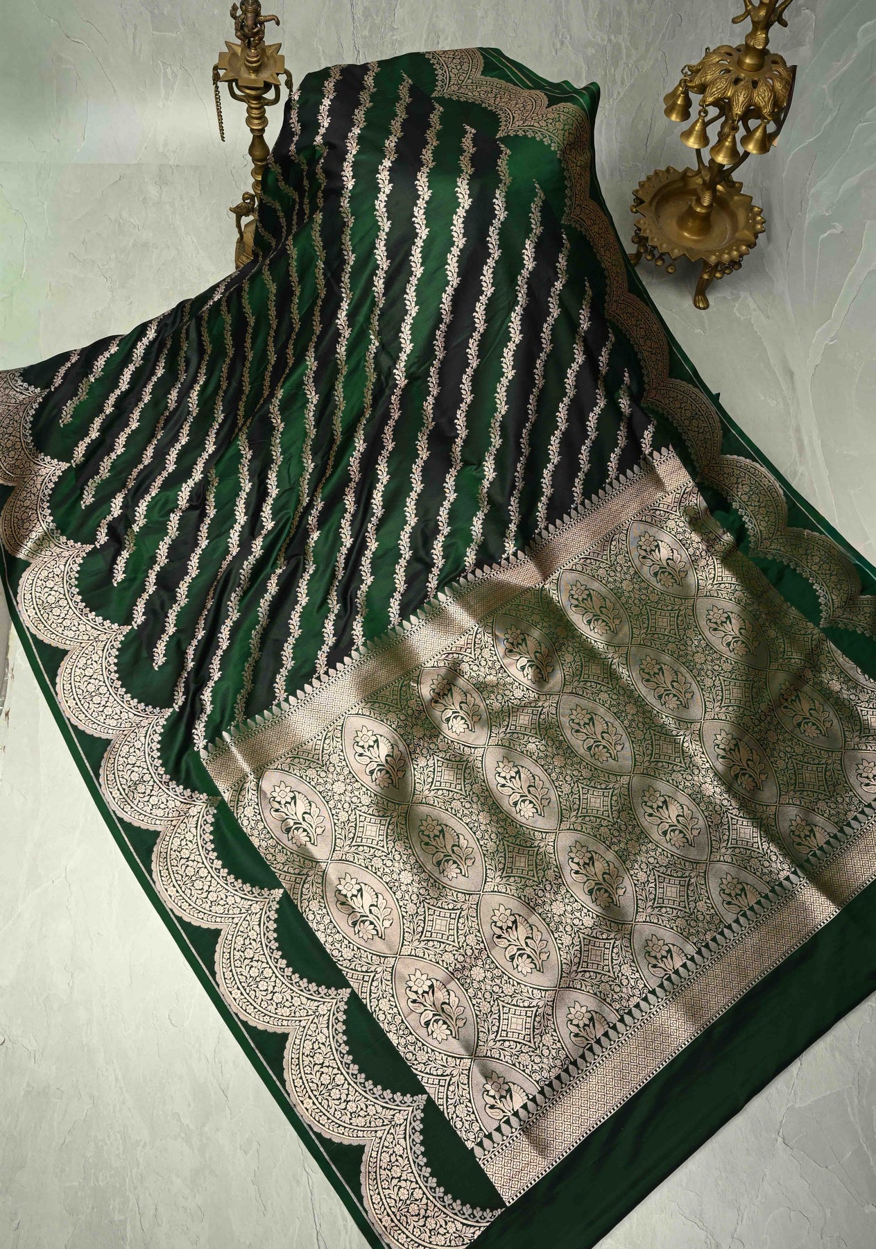 Step into refined elegance with this Shades of Green Banarasi Semi Mashru Silk Saree, adorned with an exquisite floral Leheria jaal and a rich zari border. Crafted from semi Mashru silk, the saree offers a smooth, lustrous drape that beautifully complements its intricate weaving details.