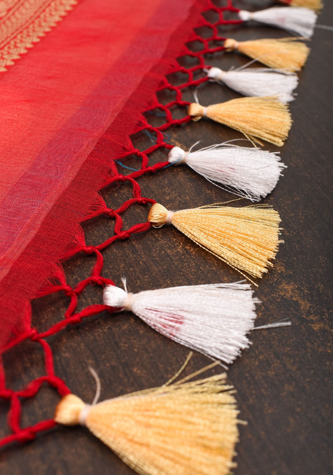 This saree is ready to wear with fall and pico done. Handmade silk tassels adorn the pallu and add more grace to it. An unstitched blouse fabric is included.