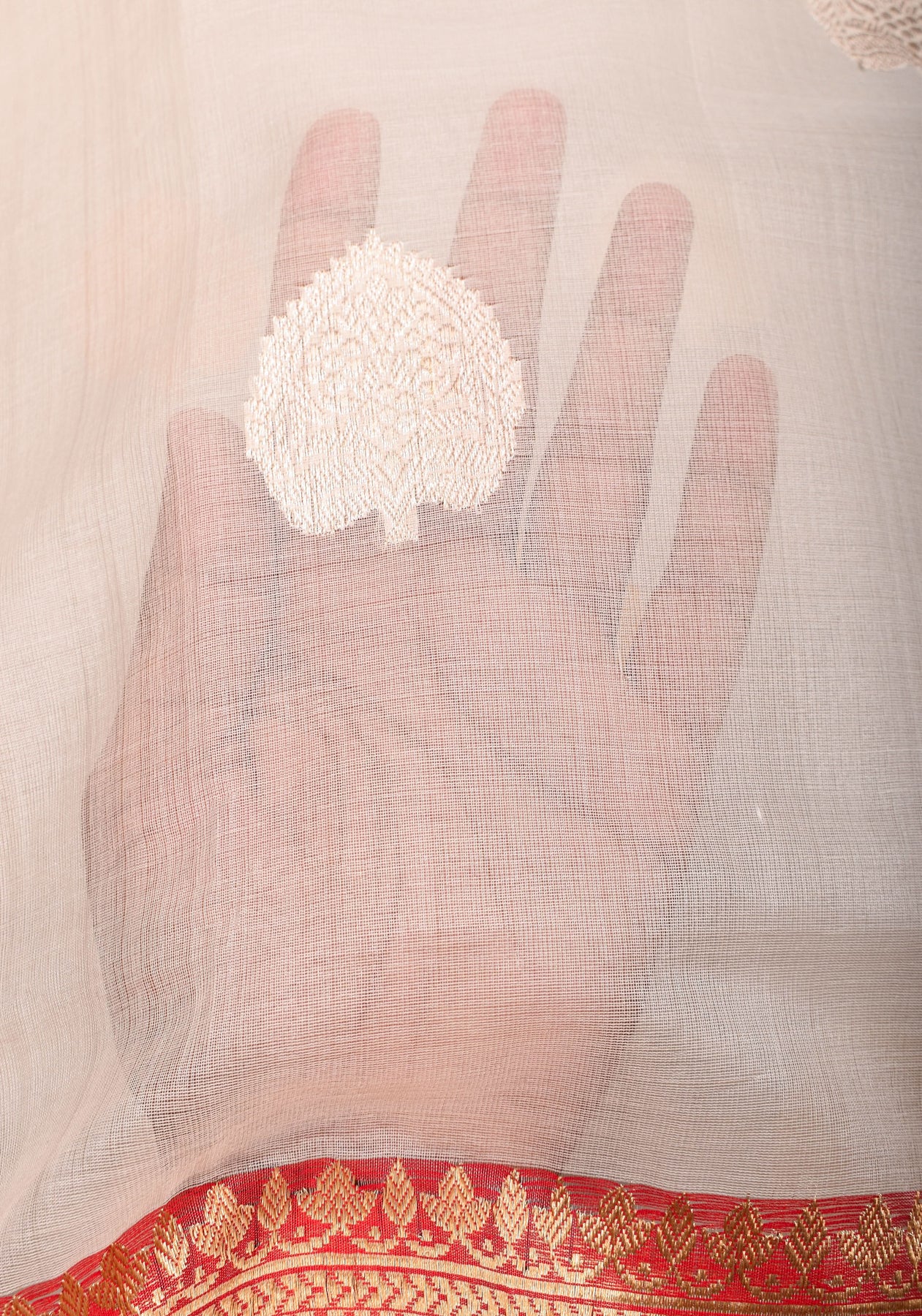 The zari weave bears an embossed look that stands out beautifully on the Ivory and red base.