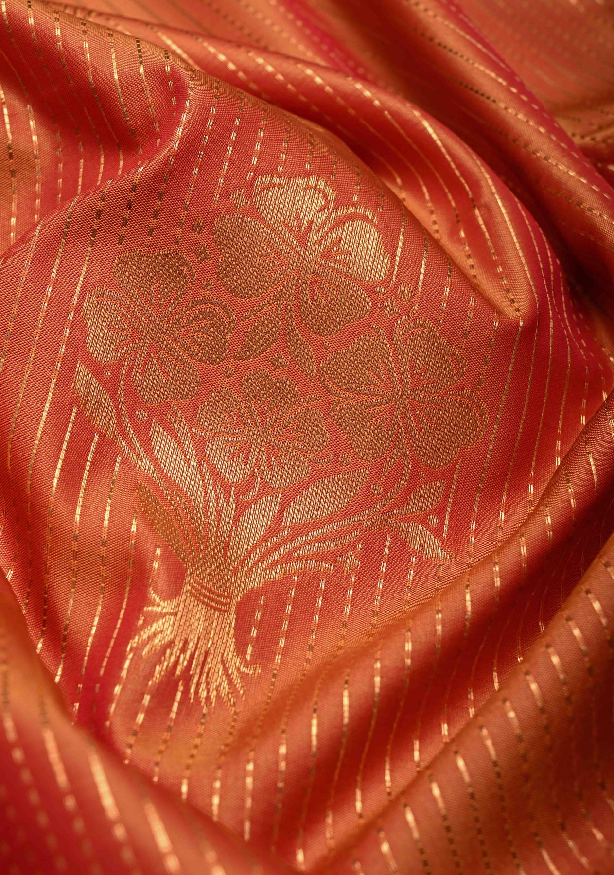 Radiate warmth and grandeur in this Sunset Orange Dual Tone Kanchi Semi Silk Saree, a striking blend of vibrant color and classic craftsmanship. The rich dual-tone body features a glowing sunset orange hue that shifts beautifully under light, adding depth and sophistication to every drape. Adorned with vertical stripes of zari buttas, the saree offers a unique, structured look that enhances its traditional appeal.