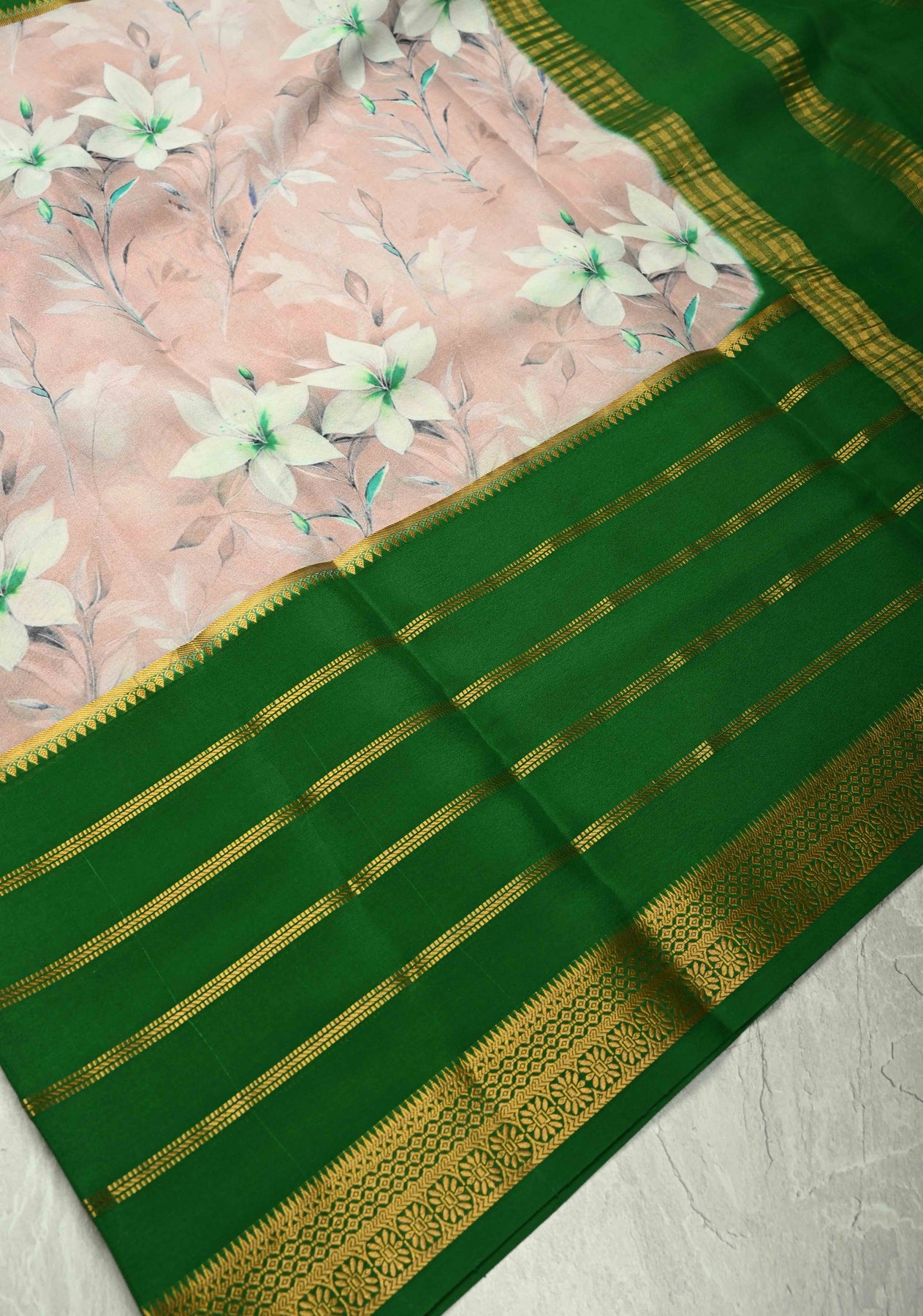 Pale Pink Mysore Silk Saree with Floral Digital Print and Contrast Zari Border |SILK MARK CERTIFIED