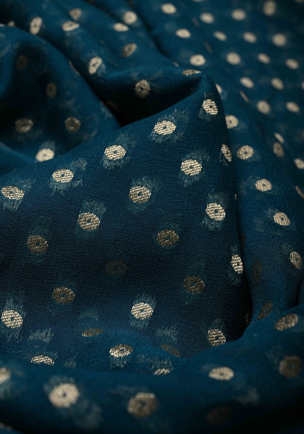 Chic, graceful, and timeless—this Teal Banarasi Georgette Silk Saree is a beautiful blend of playful design and classic elegance. Crafted from soft and lightweight georgette silk, the saree is adorned with shimmering polka dot brocade motifs that add a unique and eye-catching texture.