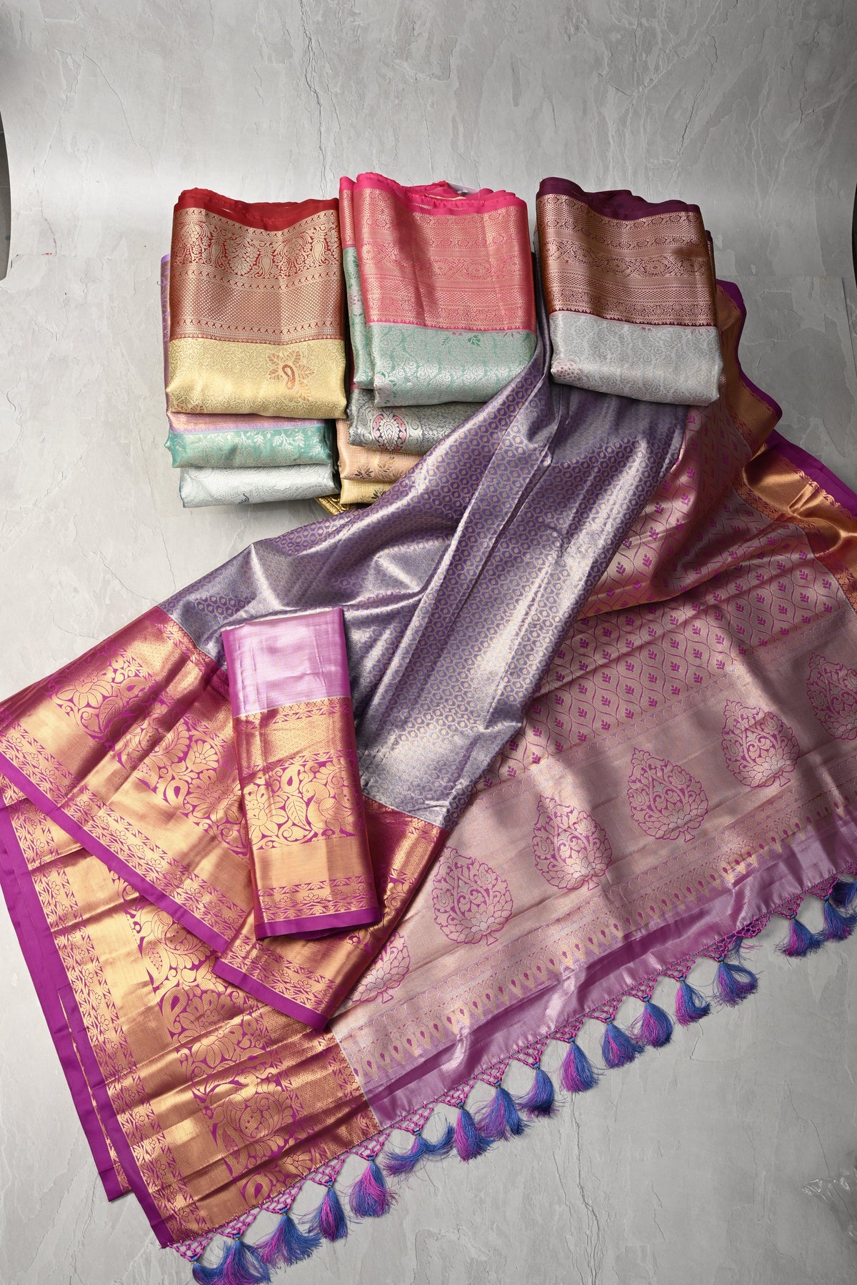 Celebrate the grandeur of tradition and versatility with this Assorted Bundle of 10 Kanjivaram Meenakari Tissue Semi Silk Sarees. Handpicked to offer a rich variety of color and craftsmanship, each saree in this set is a unique masterpiece—perfectly blending the timeless elegance of Kanjivaram weaving with the intricate artistry of Meenakari work.