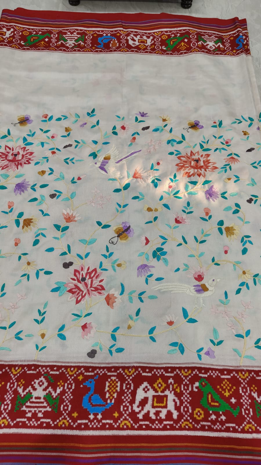 A breathtaking union of two legendary crafts, the Authentic Double Ikat Patan Patola Handwoven Silk Saree in White with Handmade Parsi Gara Embroidery is a rare masterpiece that celebrates the spirit of jugalbandi or fusion—a harmonious duet of heritage, technique, and timeless beauty.
