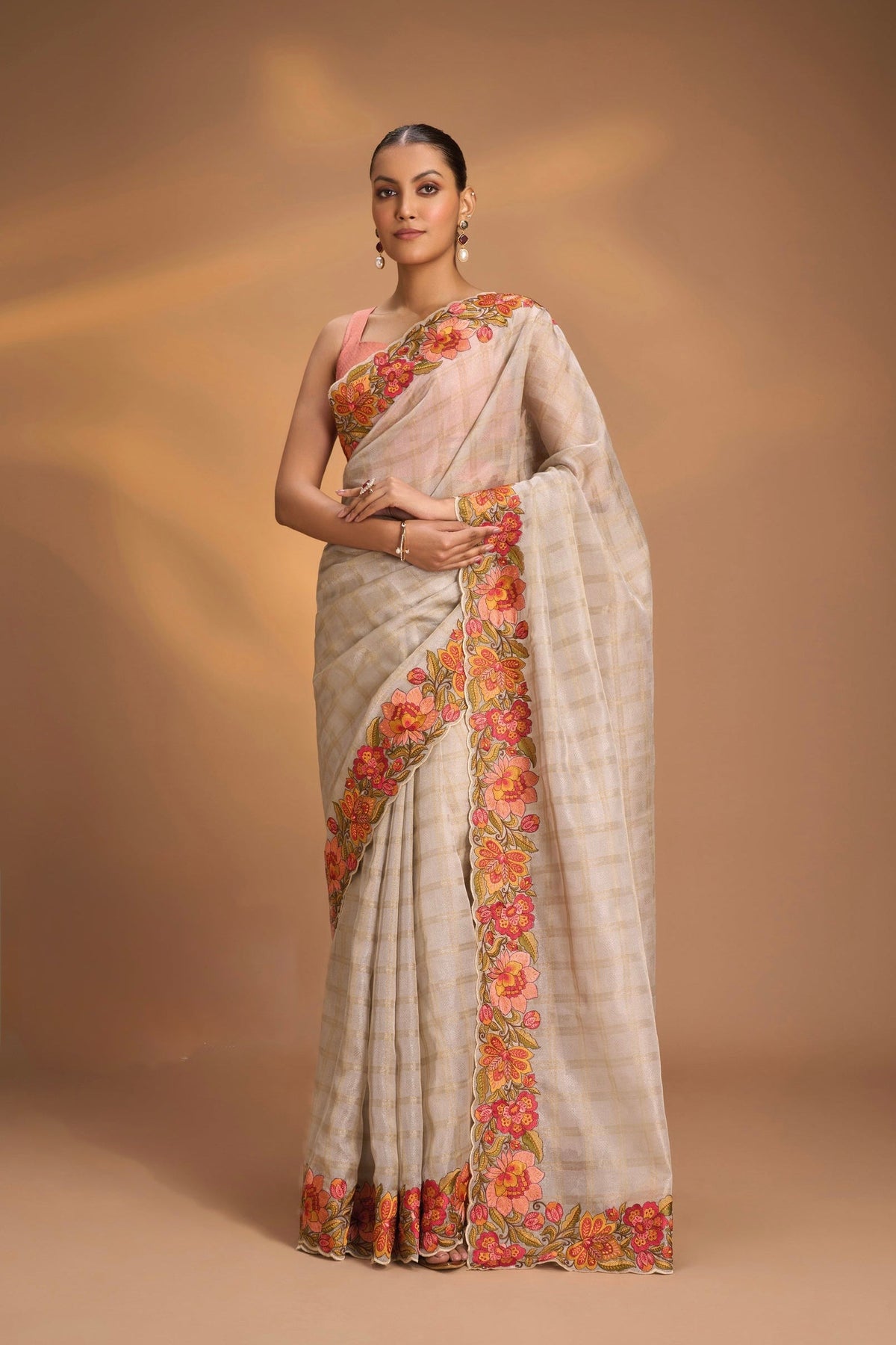 Gracefully framed by a compact chintz border in beautiful warm hues and adorned with intricate multicolor thread embroidery, the border adds vibrant texture and depth, perfectly balancing the subtle check base with rich artisanal details, creating a harmonious blend of warmth and elegance.
