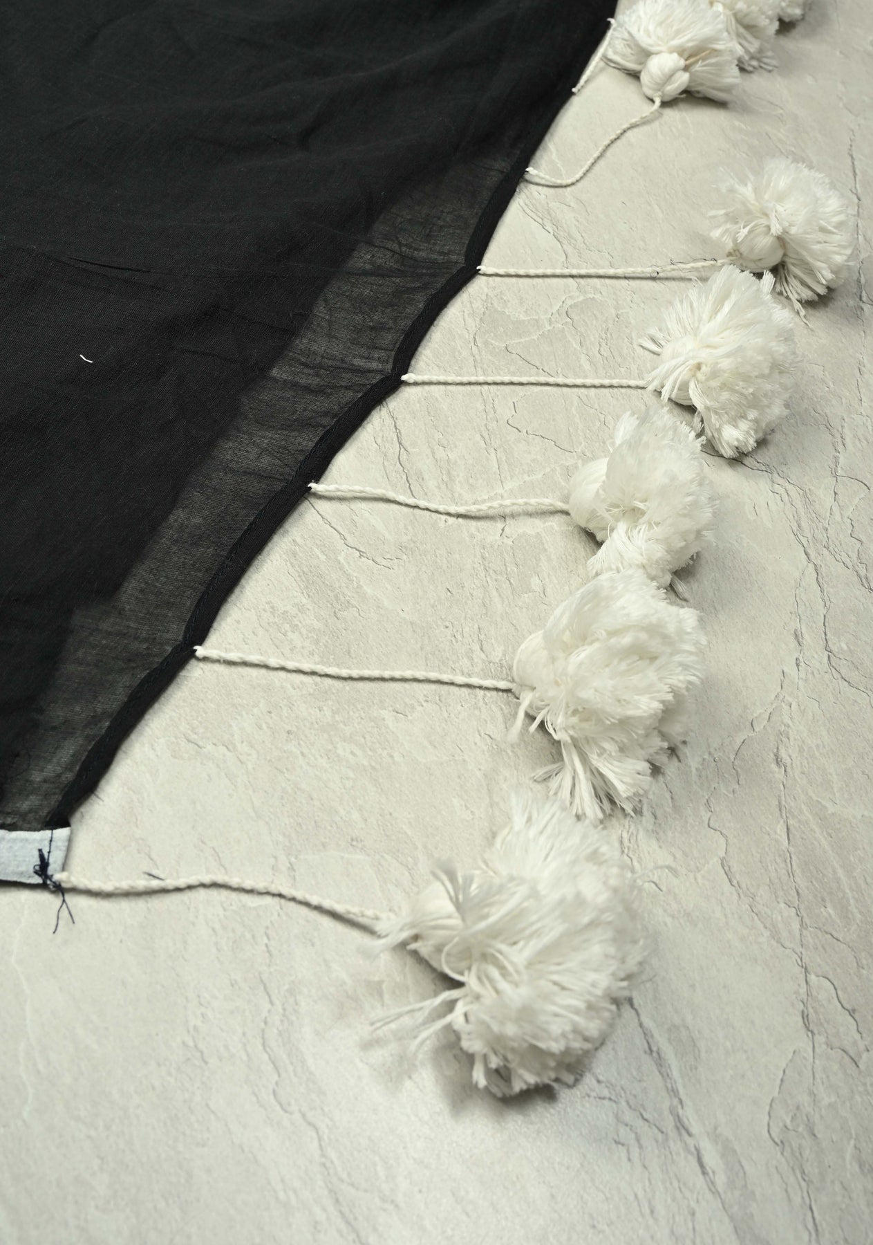 Embrace timeless elegance with this Black Mulmul Cotton Saree featuring White Long Tassels. Crafted from ultra-soft mulmul cotton, this saree offers an airy, lightweight drape that keeps you effortlessly comfortable all day. The bold contrast of black fabric with white tassels adds a contemporary twist to a traditional classic, creating a look that’s both minimalistic and chic.