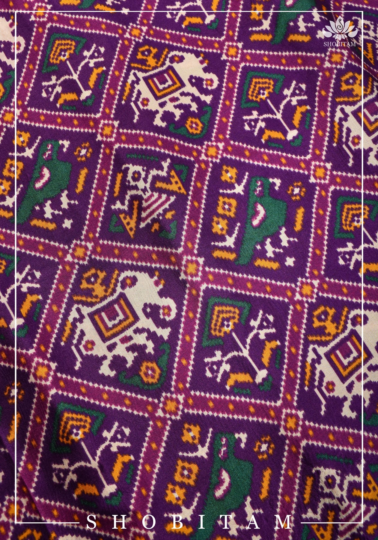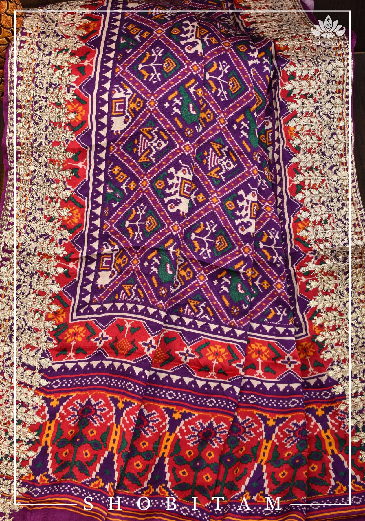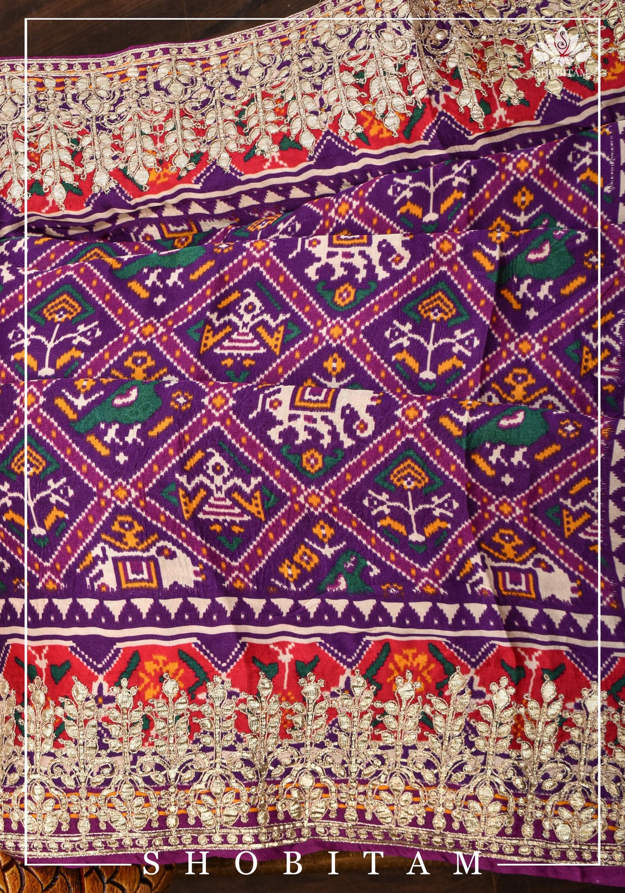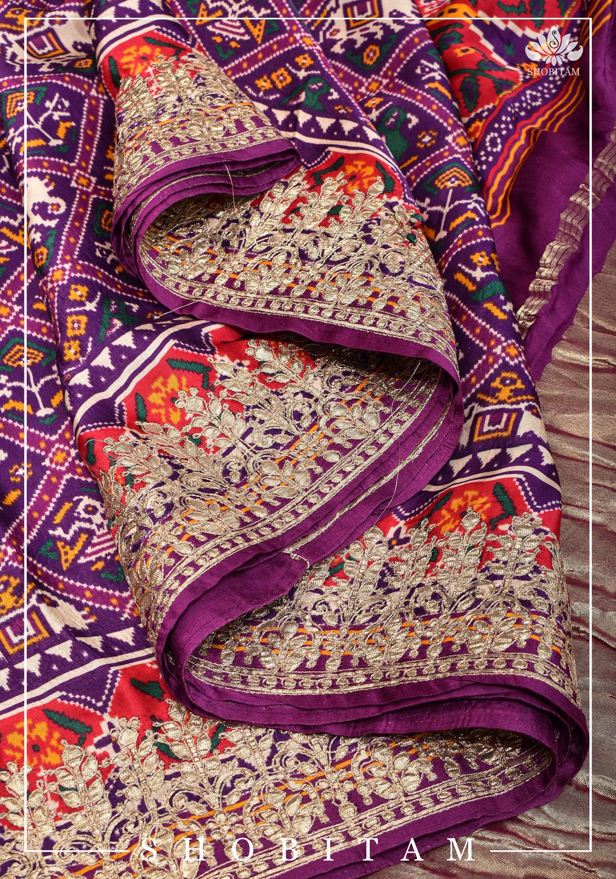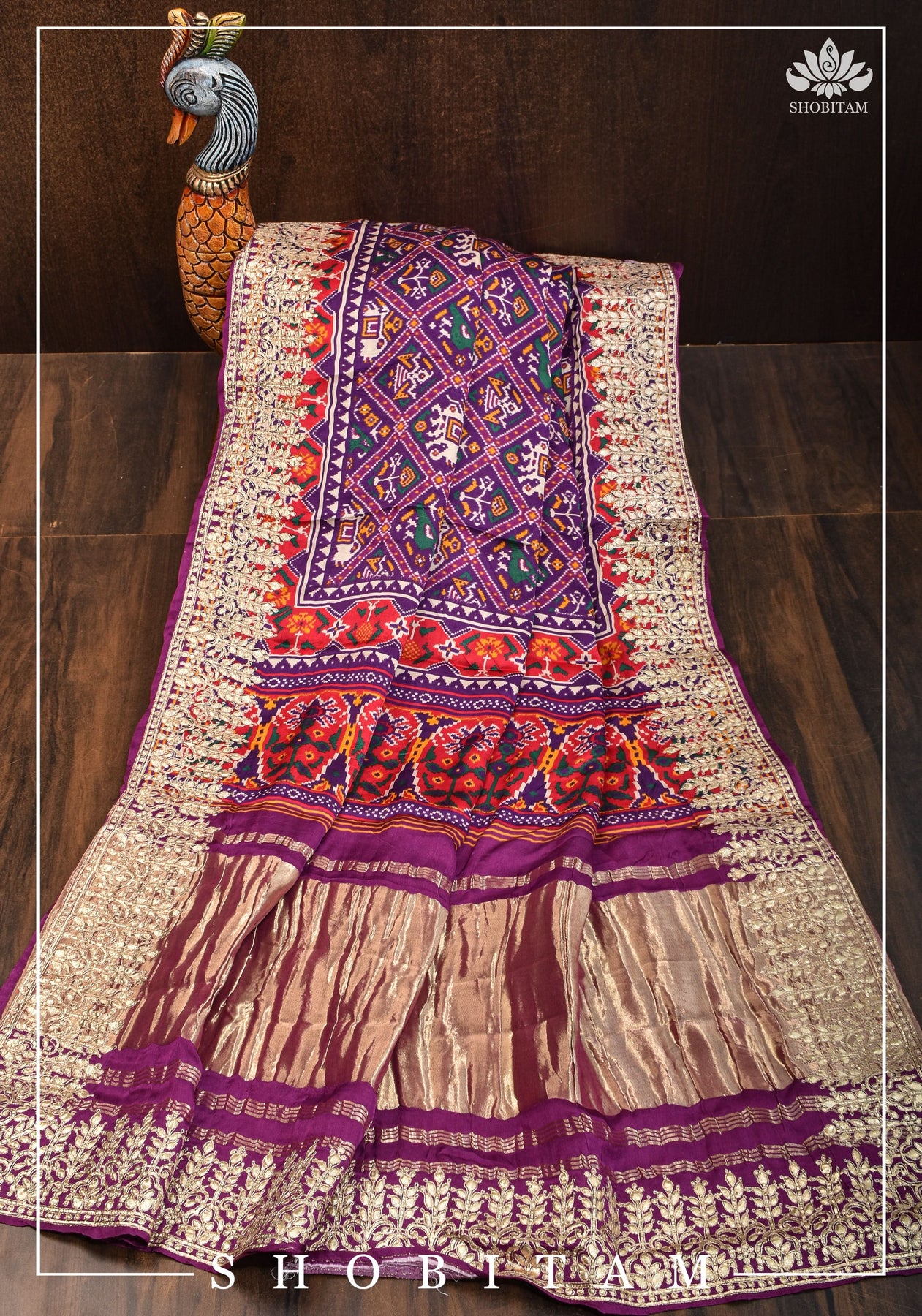 Gotta Patti technique from Rajasthan is the way to go for fancy clothes! Think metallic trims stitched in unique patterns to add a pop of shimmer. Originally fit for royalty, this celebrated technique has stood the test of time and is still in high demand. The crushed zari pallu only adds to the charm! Check out this vibrant digital print Purple tone Gajji Silk Saree with its gotta patti border that makes it a standout piece!