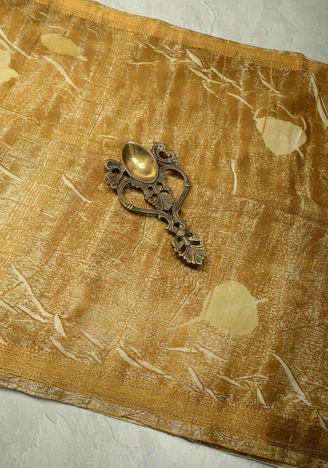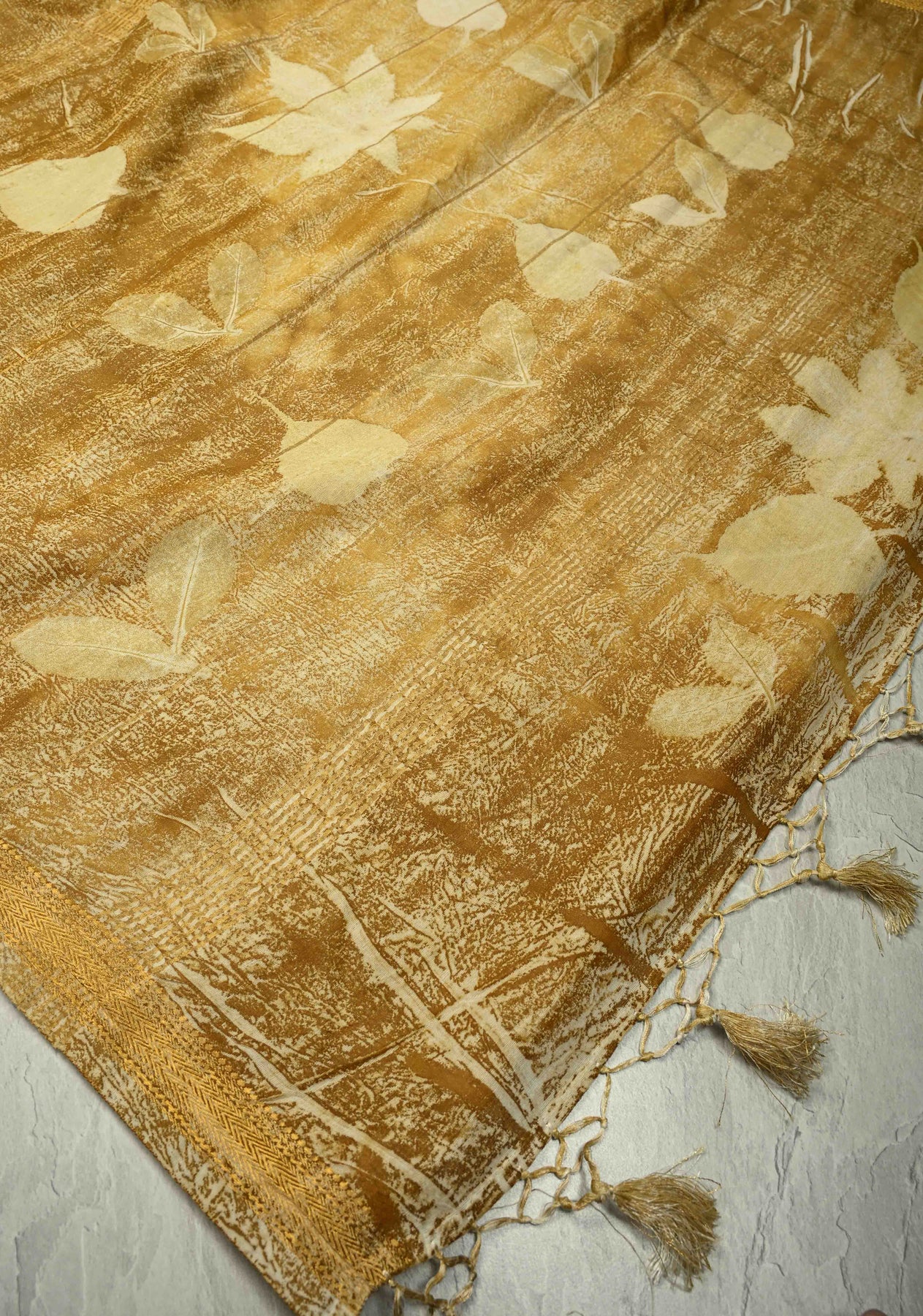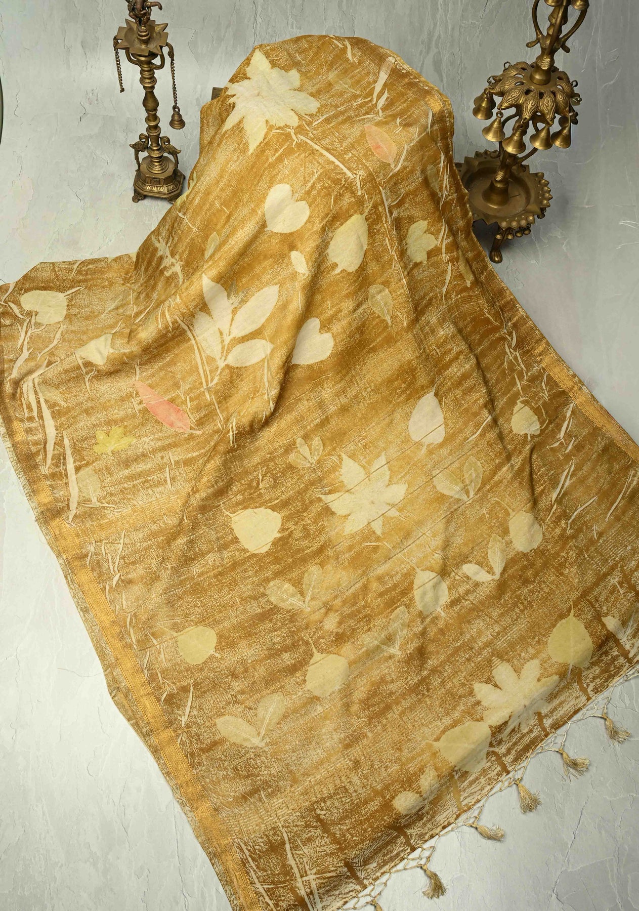 Golden Yellow Leaf Eco print on Chanderi  Silk Saree with Minimal Zari Border