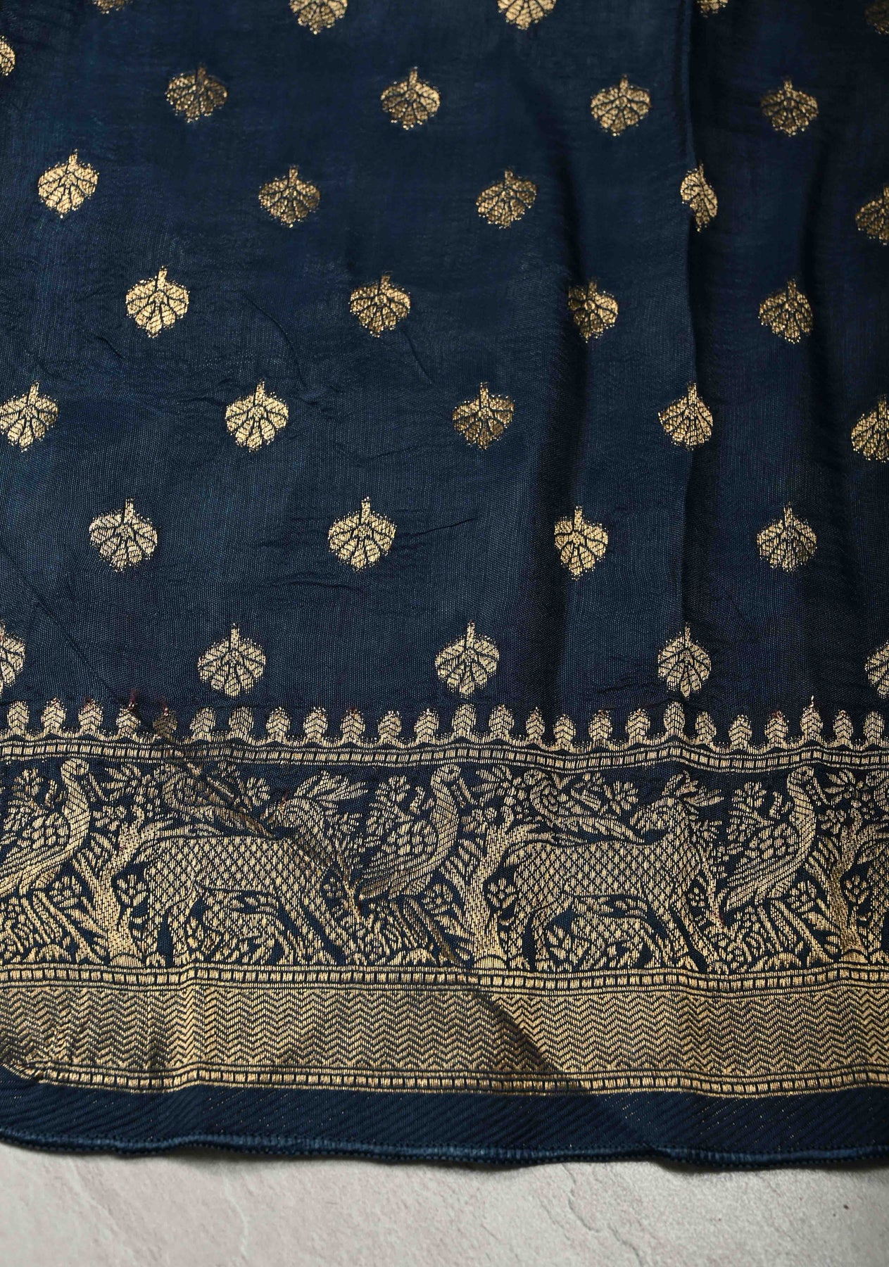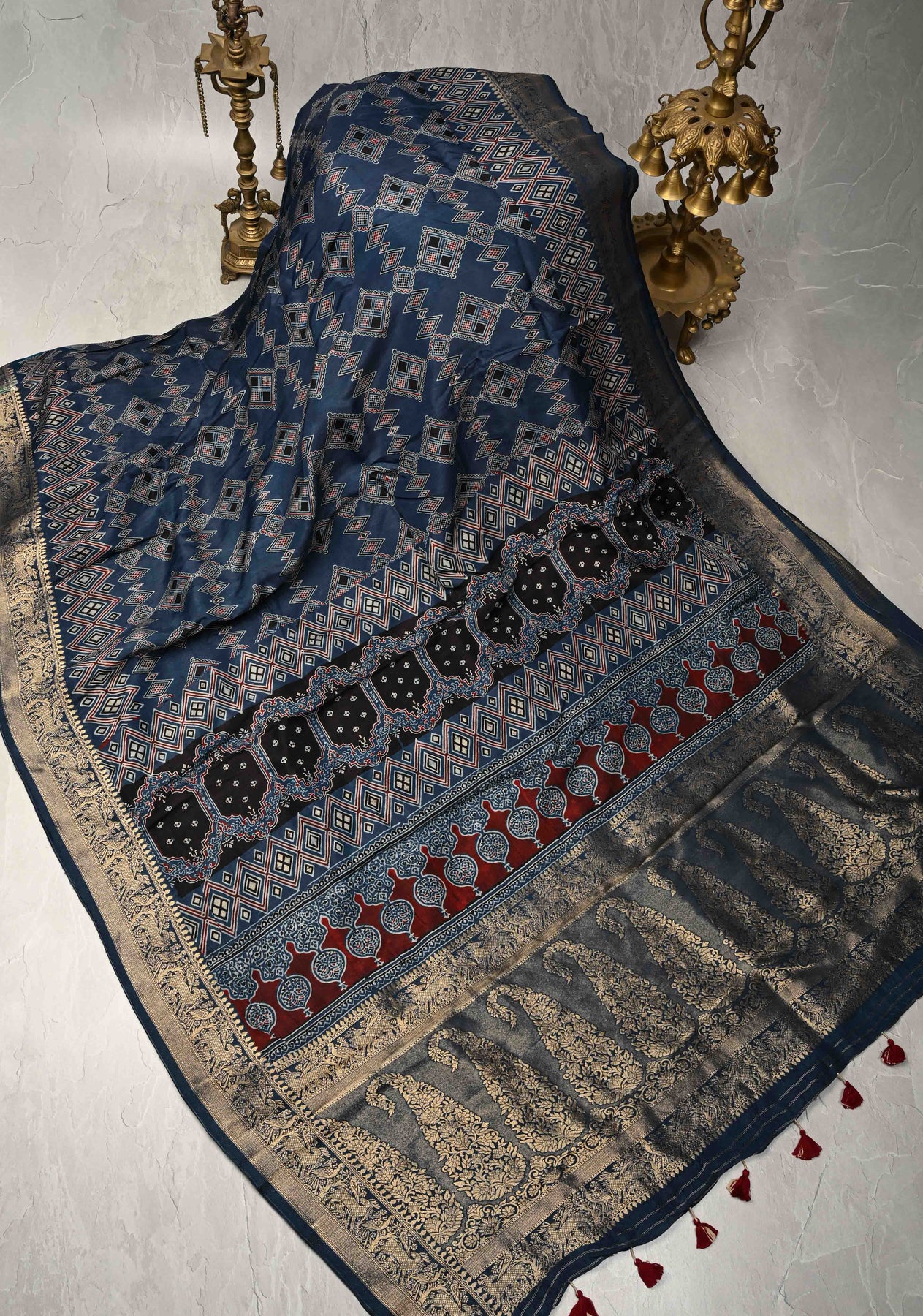 Indigo Ajrakh Hand Block Print on Dola Silk Saree with Fancy Zari Border
