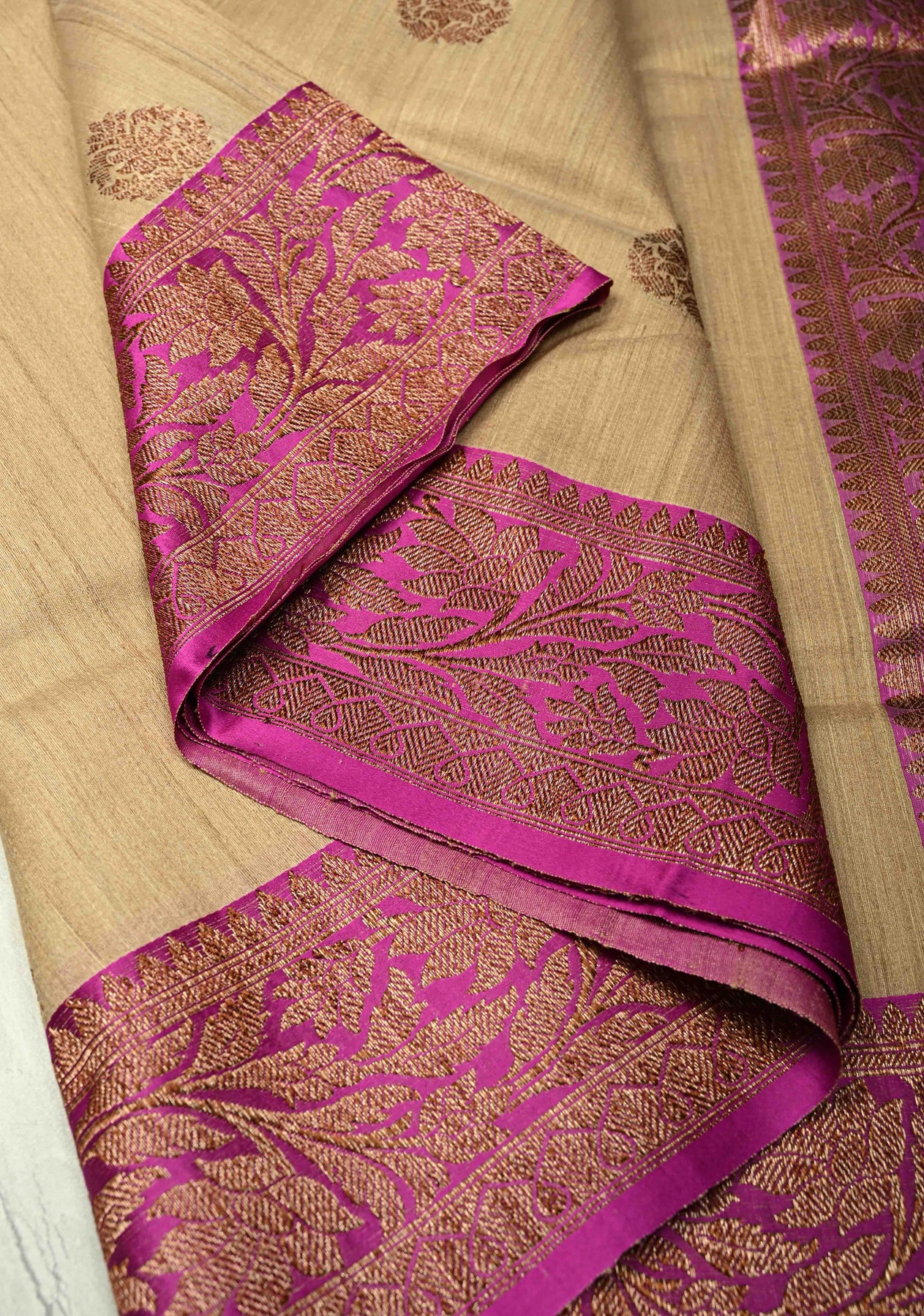 This elegant Kora Color Banarasi Tussar Silk Saree is a beautiful blend of tradition and subtle sophistication. Crafted from premium Tussar silk, it features a soft kora shade that exudes understated grace. The saree is adorned with delicate antique zari buttas that shimmer lightly across the body, while a striking magenta zari border adds a vibrant contrast and highlights the rich craftsmanship. Perfect for weddings, festive occasions, and elegant gatherings, this saree combines classic Banarasi artistry with modern refinement.