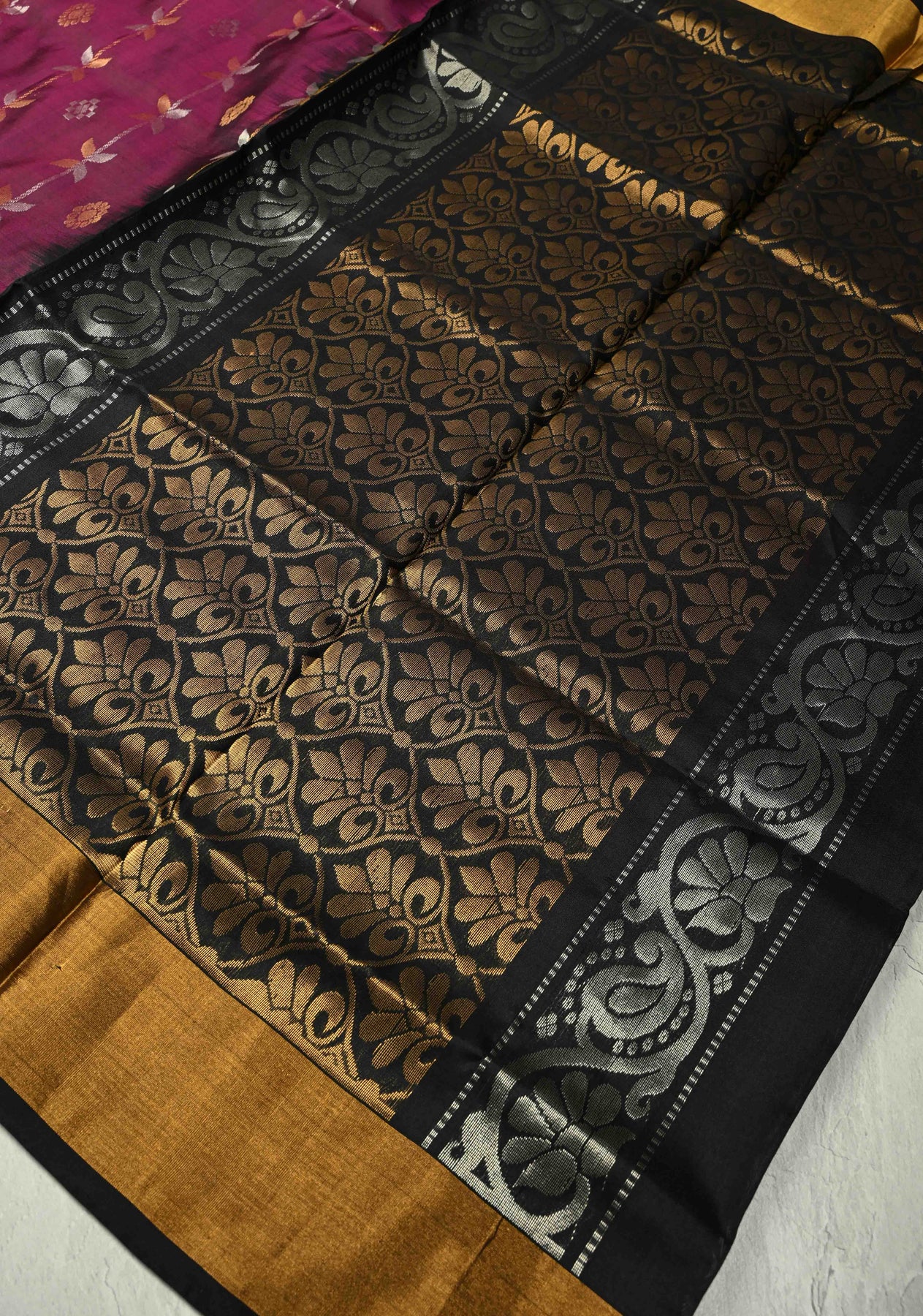 This Magenta Uppada Handloom Silk Saree is a captivating blend of traditional artistry and modern elegance. Handwoven from Uppada silk, it features intricate Sona Rupa buttas and stripe patterns that shimmer beautifully across the magenta base. The elegant black panel adds depth and contrast, while the lustrous tissue zari border enhances the saree’s regal appeal. Perfect for weddings, festive occasions, and grand celebrations, this saree showcases the exquisite craftsmanship and timeless allure of Uppada weaving.