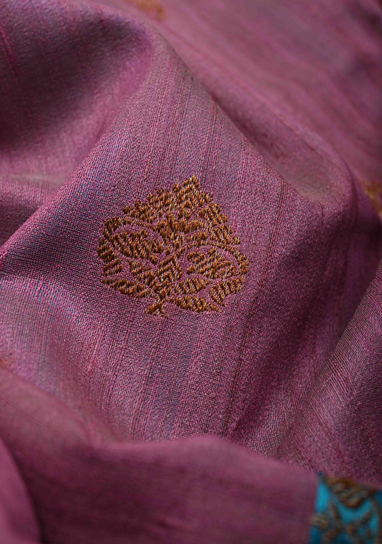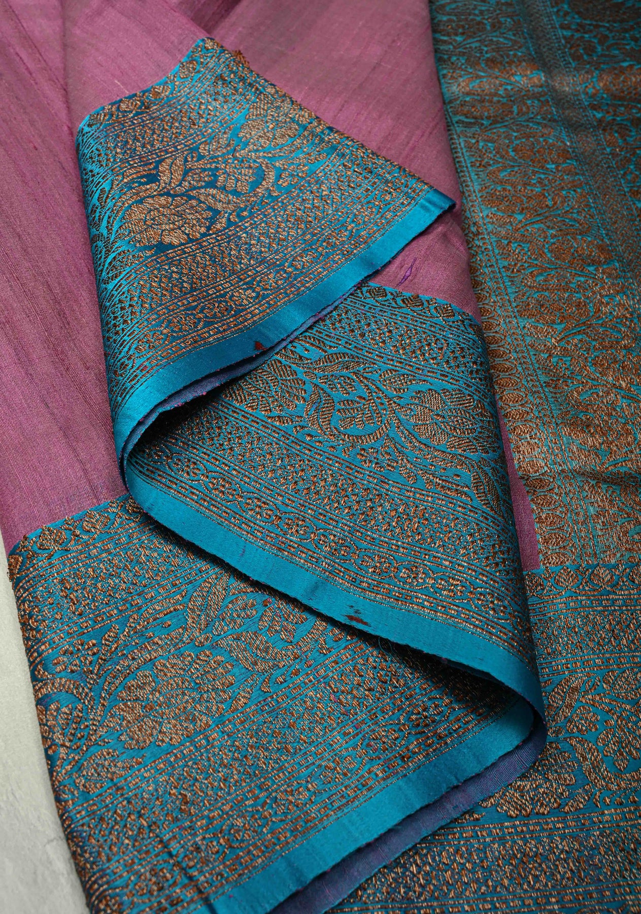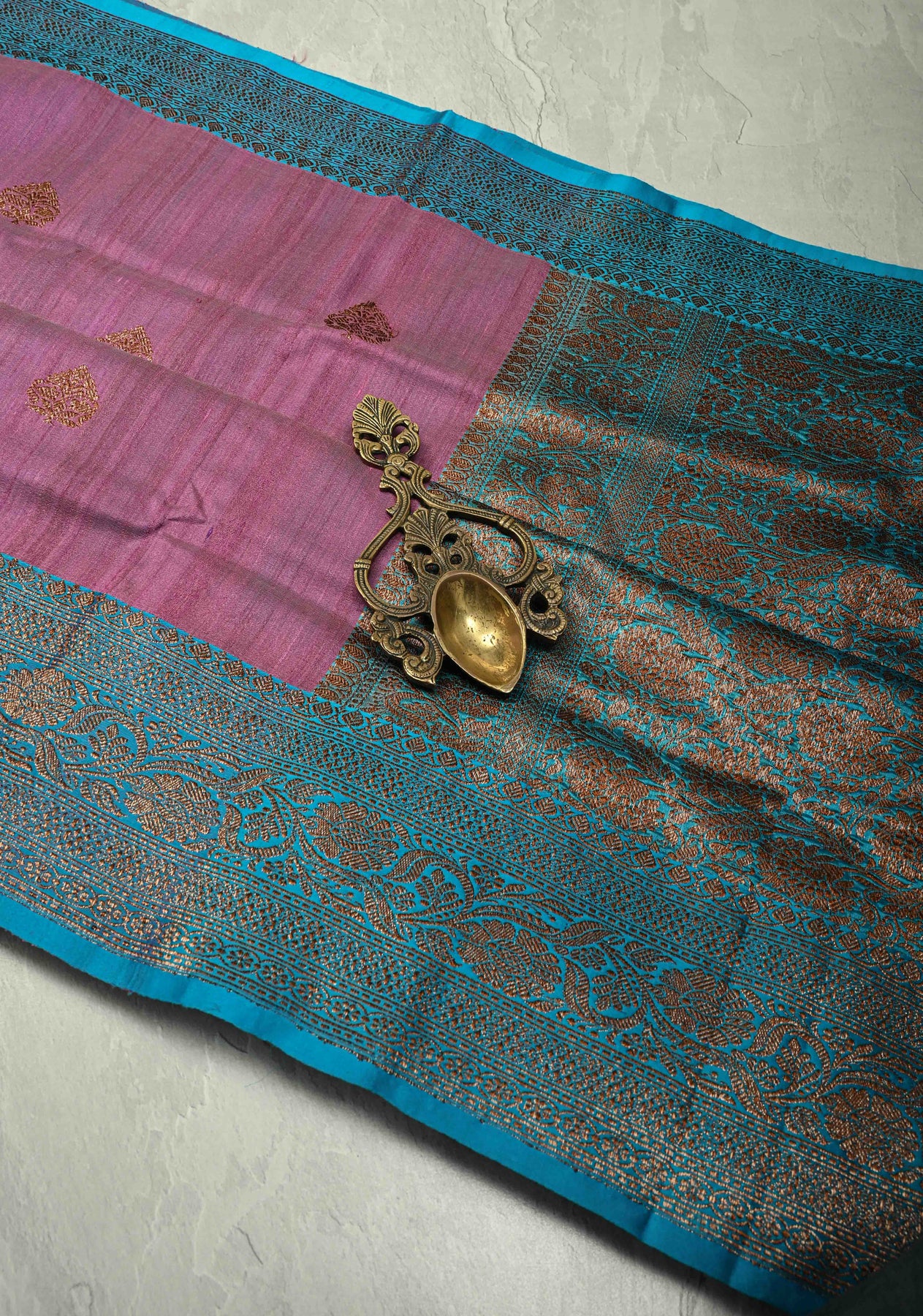 Exude timeless charm with this Mauve Banarasi Tussar Silk Saree, featuring intricate antique zari buttas delicately woven across the body. Crafted from Tussar silk, the saree offers a graceful drape with a natural sheen. The contrast zari border adds a striking finish, making it perfect for weddings, festive occasions, and traditional celebrations.