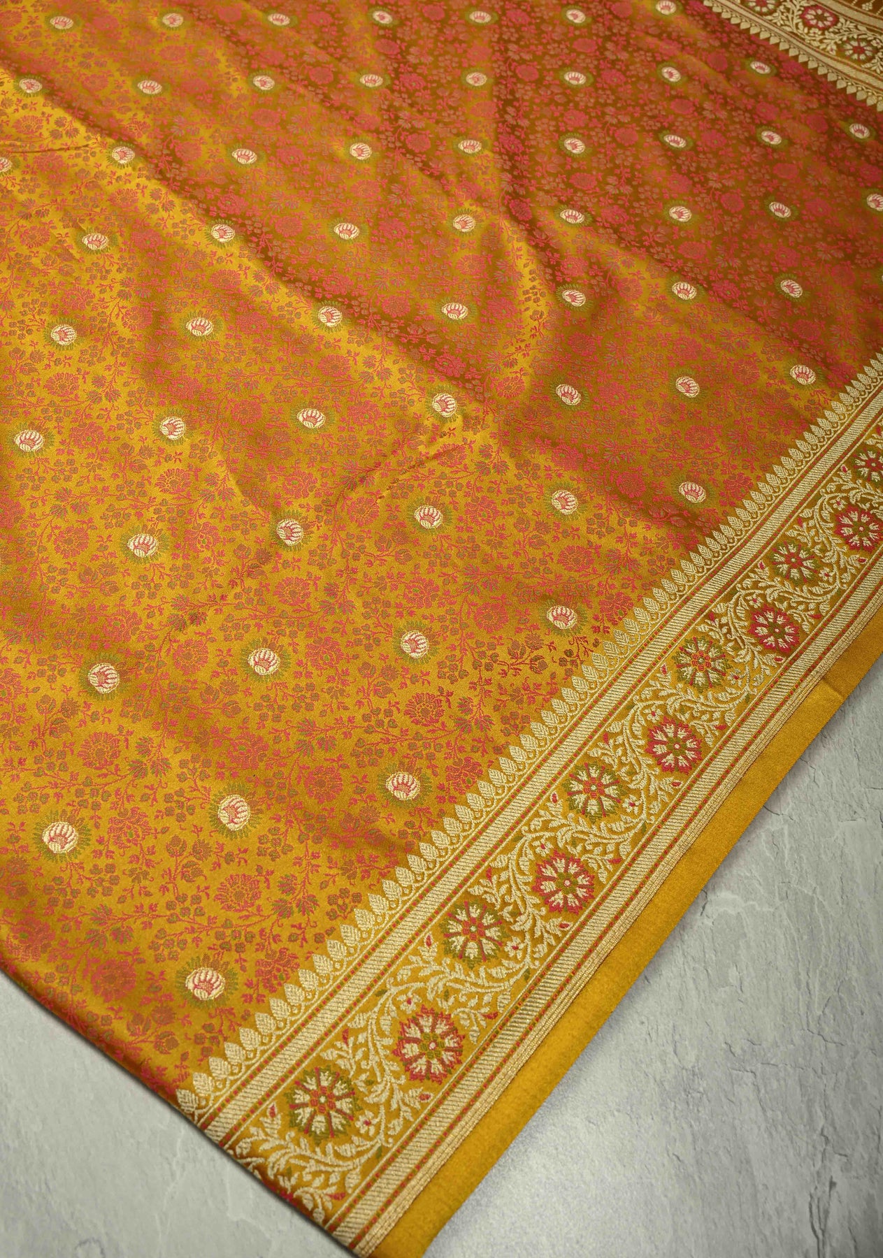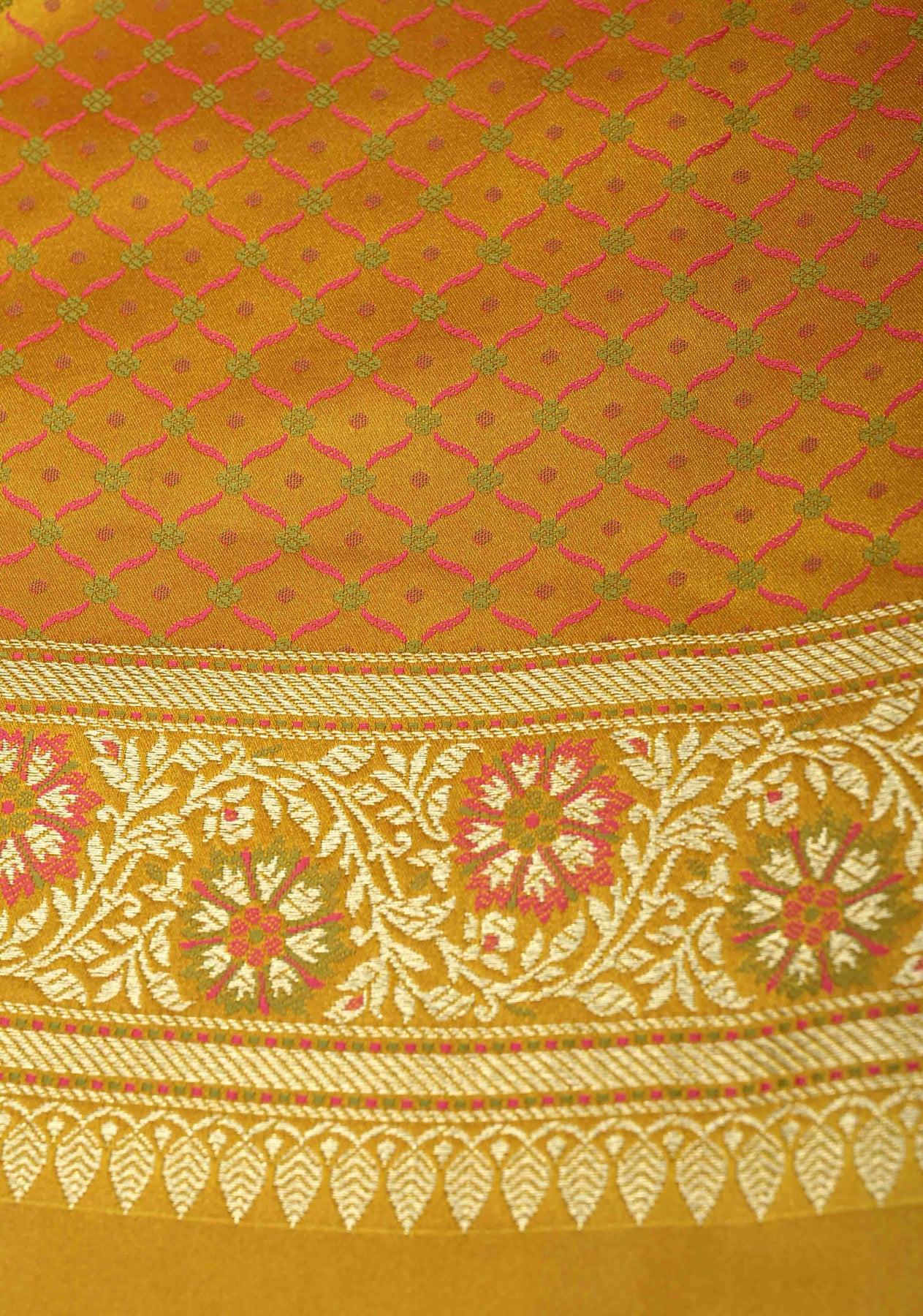 Radiate elegance in this Mustard Yellow Semi Tanchoi Banarasi Satin Silk Saree, featuring exquisite Meenakari floral brocade jaal throughout the body. The zari border adds a regal touch, enhancing the saree’s traditional charm. Crafted from semi-satin silk, it drapes gracefully, making it perfect for weddings, festive occasions, and cultural celebrations.