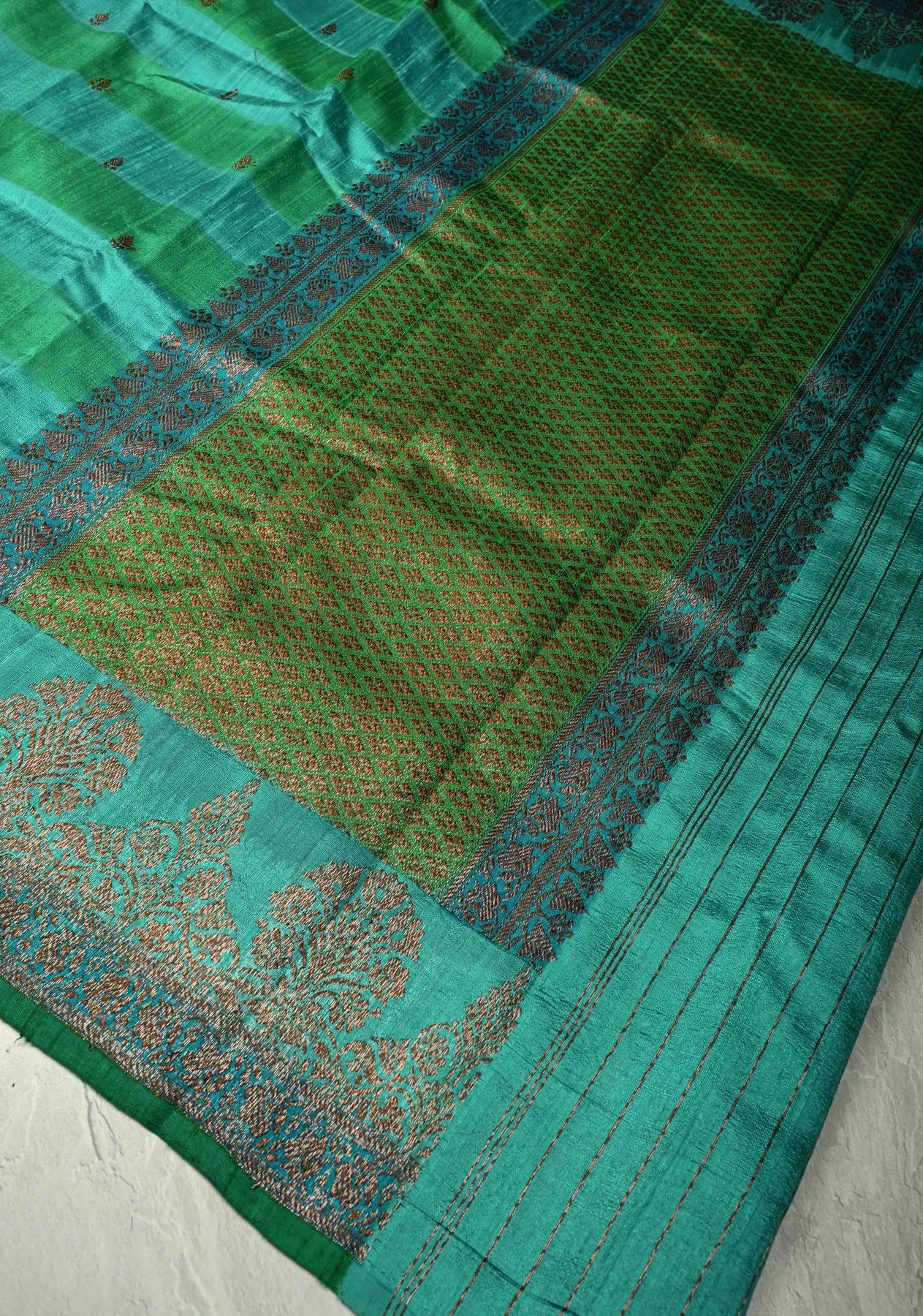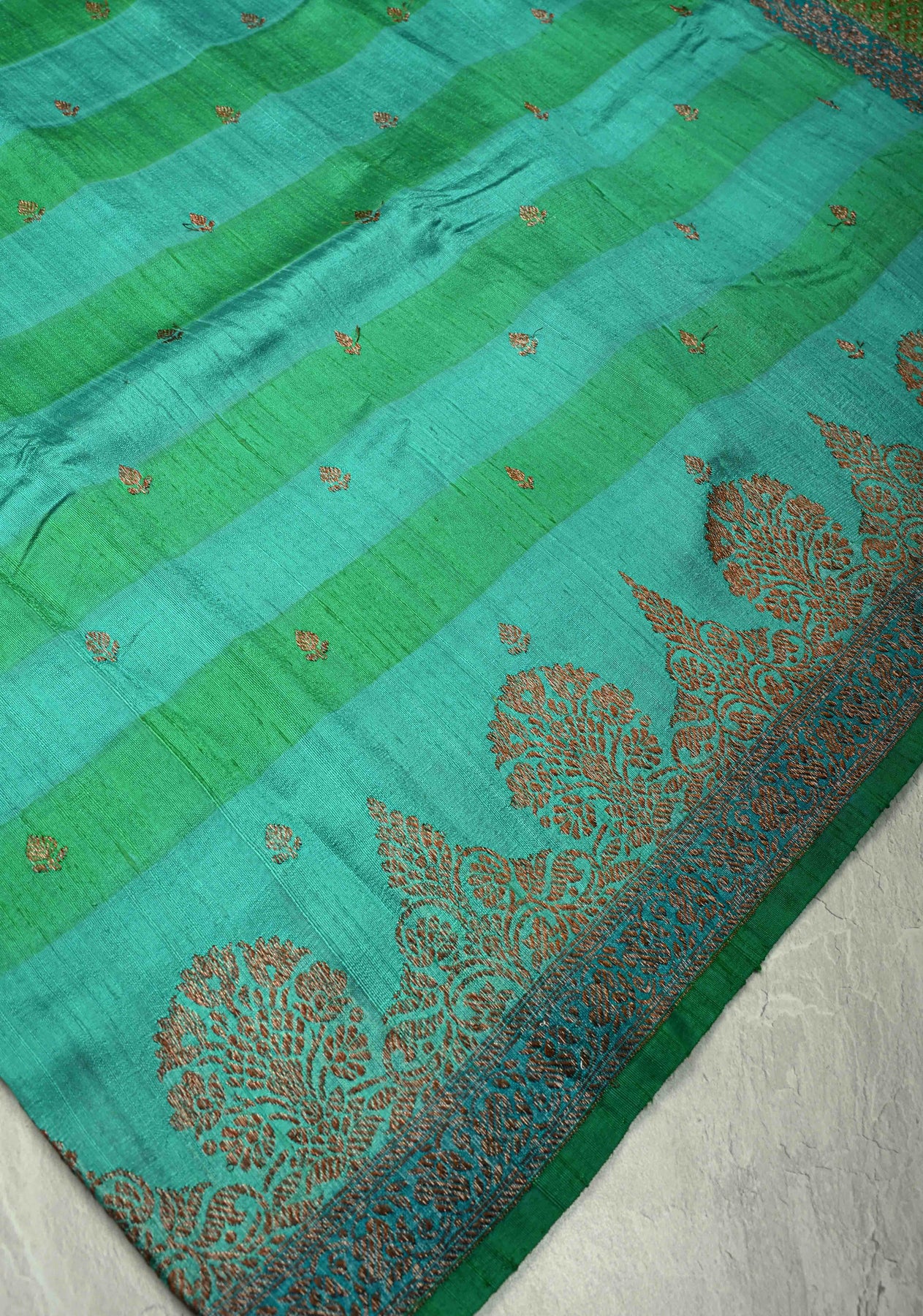 Green-Blue Horizontal Stripes on Banarasi Raw Silk Hand Brush Dye Saree with Antique Zari Buttis and Zari Border | SILK MARK CERTIFIED