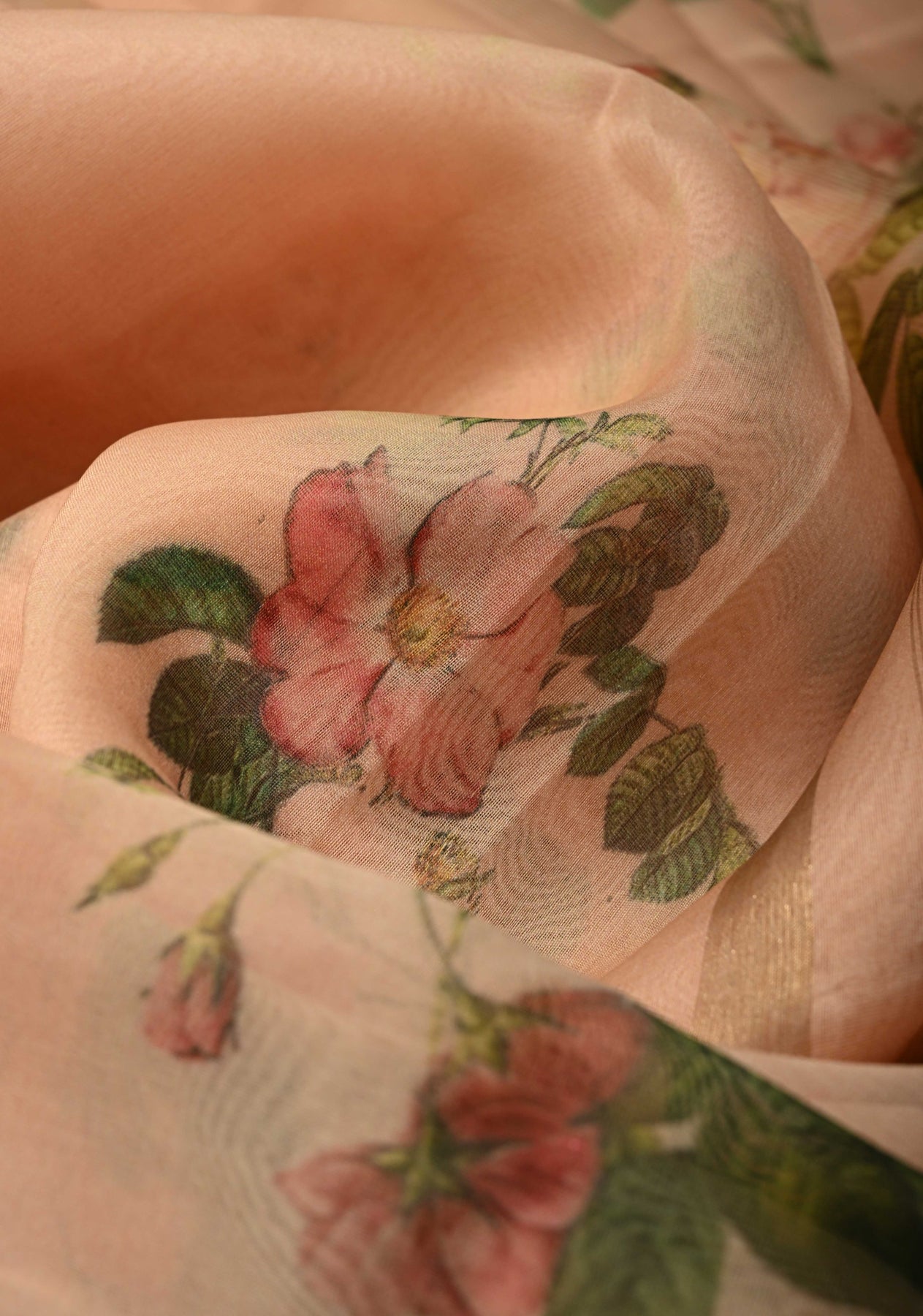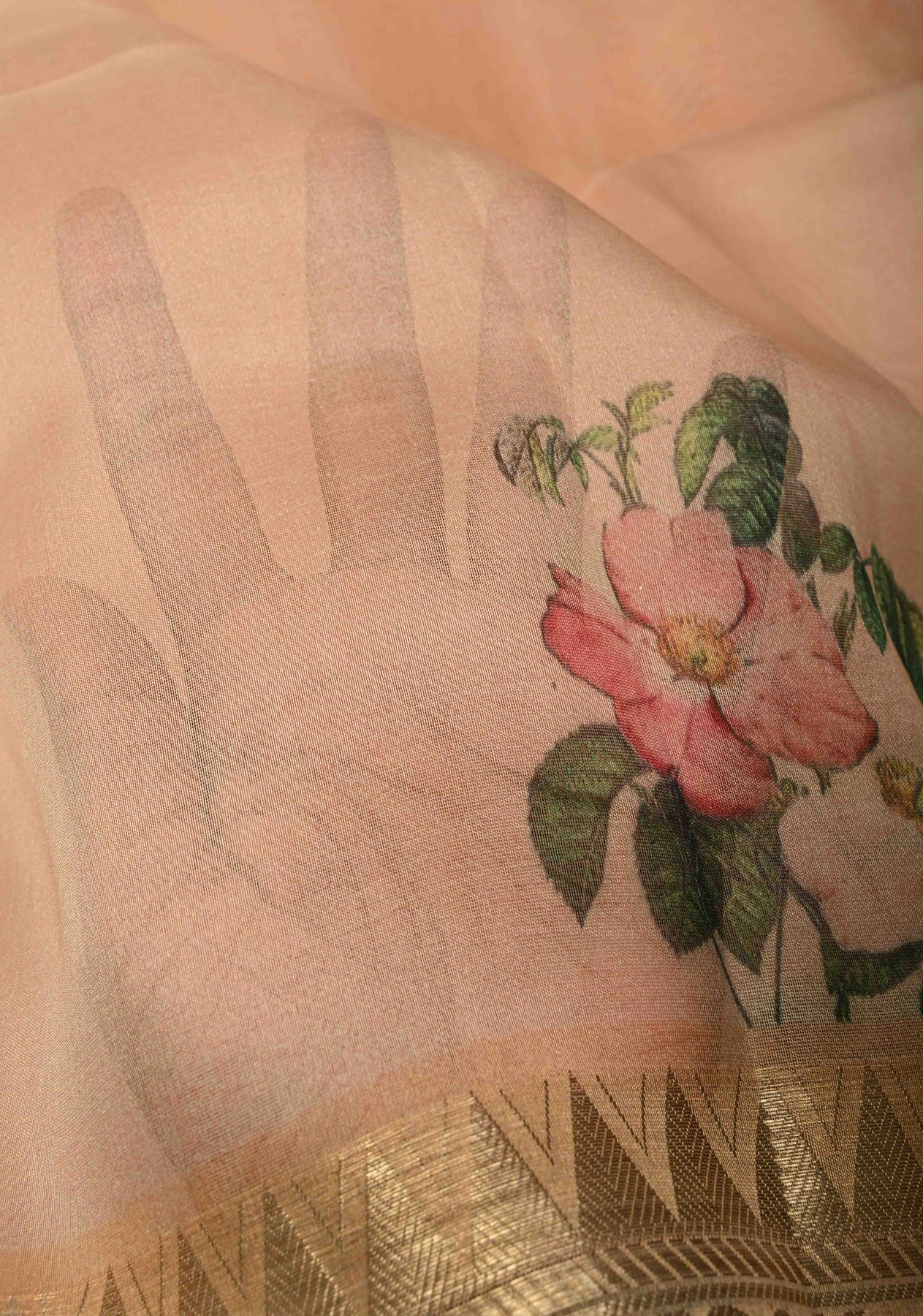 This Peach Pure Organza Silk Saree is a graceful blend of contemporary charm and traditional silk elegance. Crafted from lightweight organza silk, it features a delicate floral digital print that enhances the soft peach base with vibrant, intricate patterns. Accented by a subtle zari border, the saree gains a refined, sophisticated finish. Perfect for weddings, festive occasions, and elegant gatherings, it drapes beautifully and adds a fresh, stylish touch to any celebration.