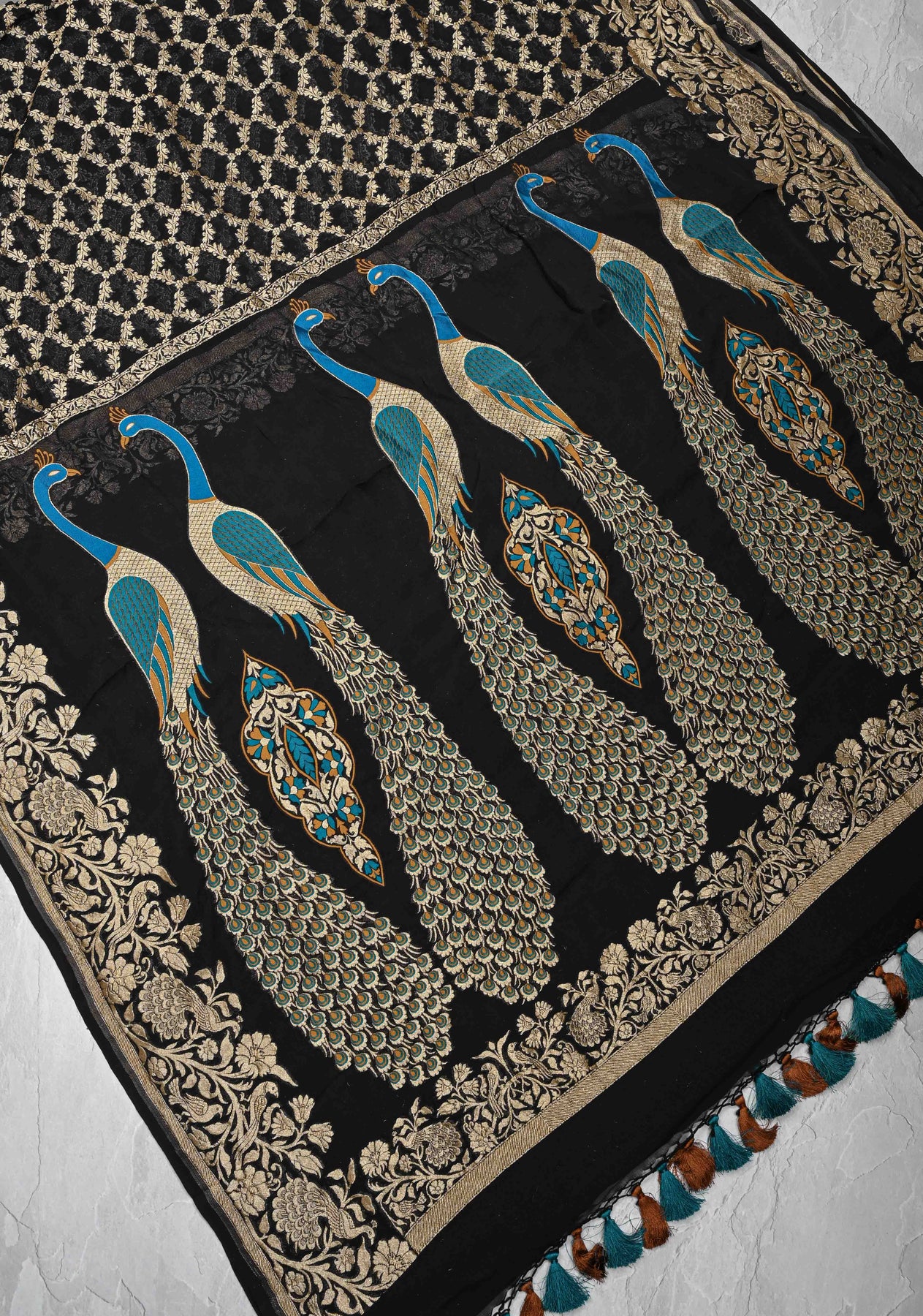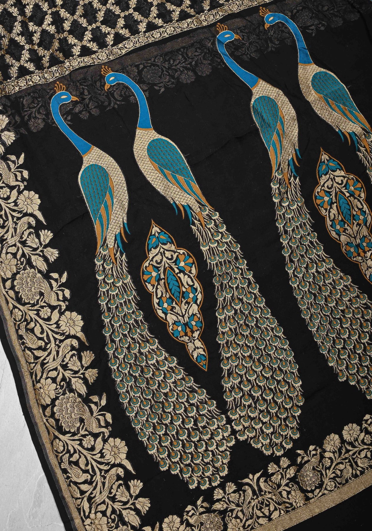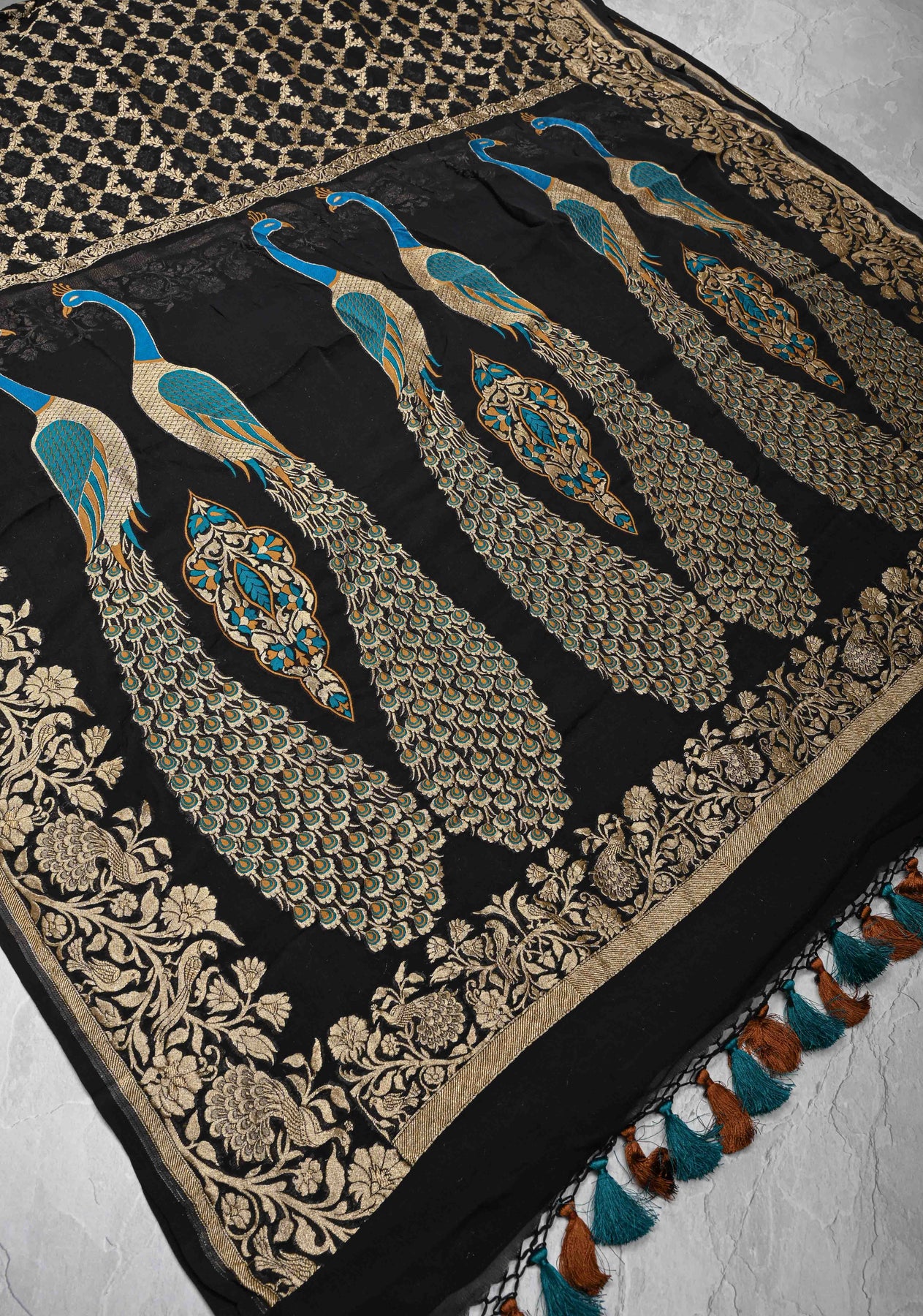 A Black Banarasi Georgette Silk Saree with Zari Jaal and a Resplendent Peacock Meenakari Pallu is a masterpiece of traditional Indian craftsmanship. The saree features a lustrous black georgette silk base adorned with intricate zari jaal work, showcasing delicate floral patterns that exude elegance. The highlight is the pallu, where vibrant peacock motifs are brought to life using the meenakari technique, adding a burst of color and a touch of regal charm. This saree is an ideal choice for festivals, and grand celebrations, seamlessly blending timeless beauty with cultural grandeur