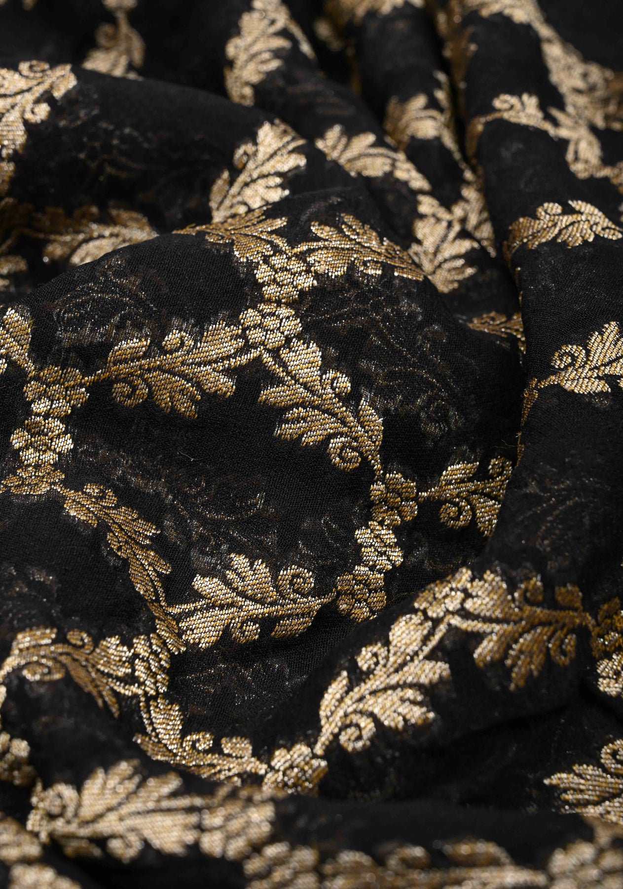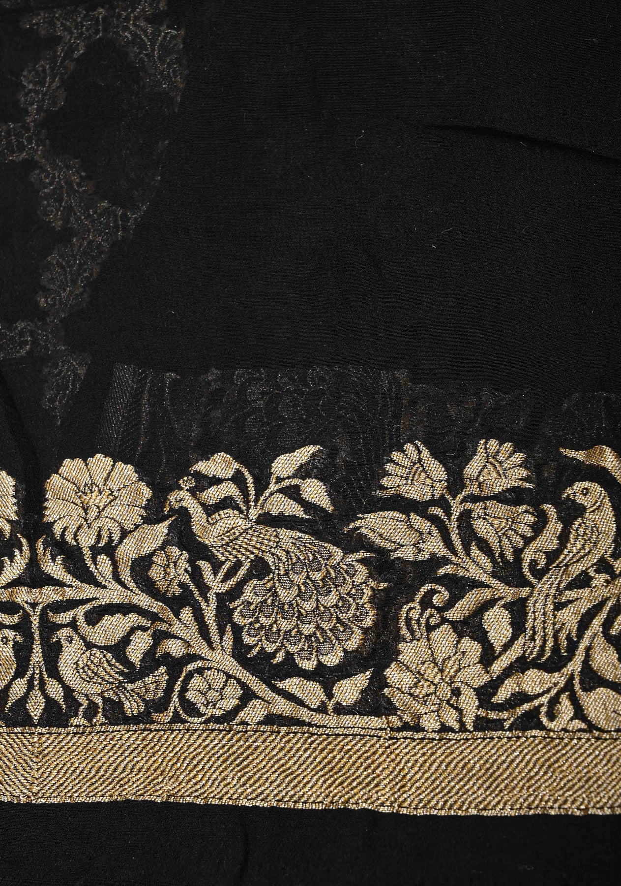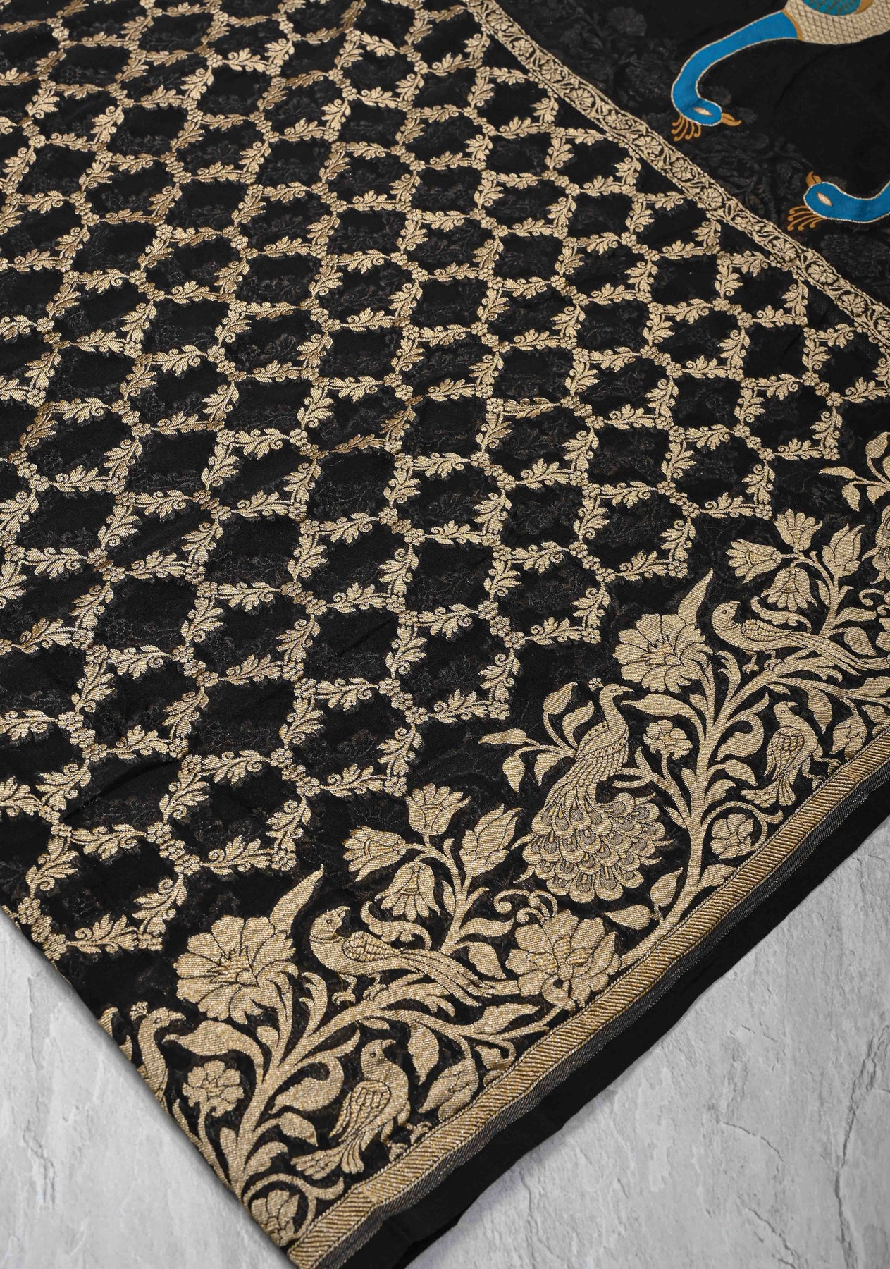 A Black Banarasi Georgette Silk Saree with Zari Jaal and a Resplendent Peacock Meenakari Pallu is a masterpiece of traditional Indian craftsmanship. The saree features a lustrous black georgette silk base adorned with intricate zari jaal work, showcasing delicate floral patterns that exude elegance. The highlight is the pallu, where vibrant peacock motifs are brought to life using the meenakari technique, adding a burst of color and a touch of regal charm. This saree is an ideal choice for festivals, and grand celebrations, seamlessly blending timeless beauty with cultural grandeur