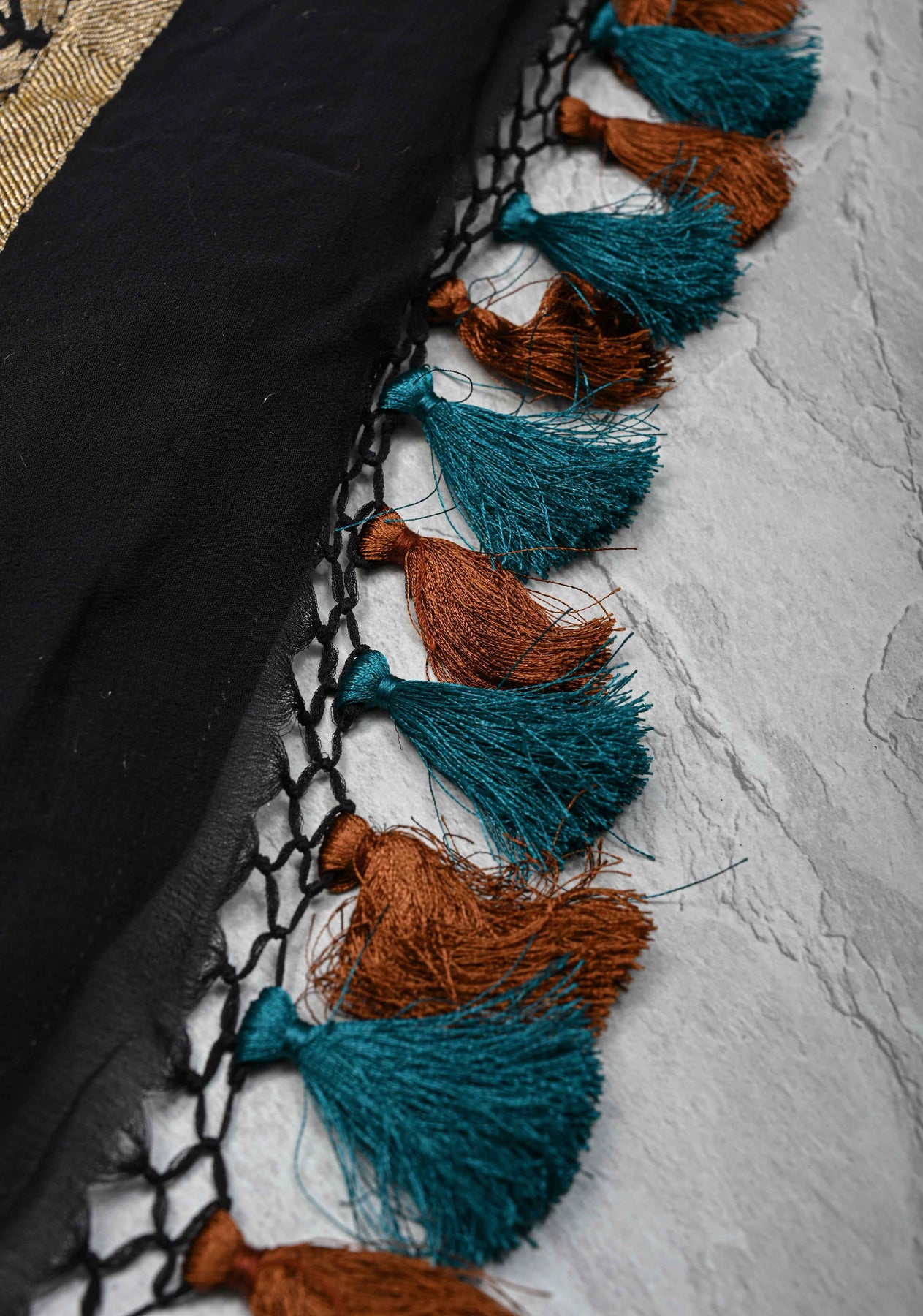 This saree is ready to wear with fall and pico done. Handmade silk tassels adorn the pallu and add more grace to it. An unstitched blouse fabric is included.