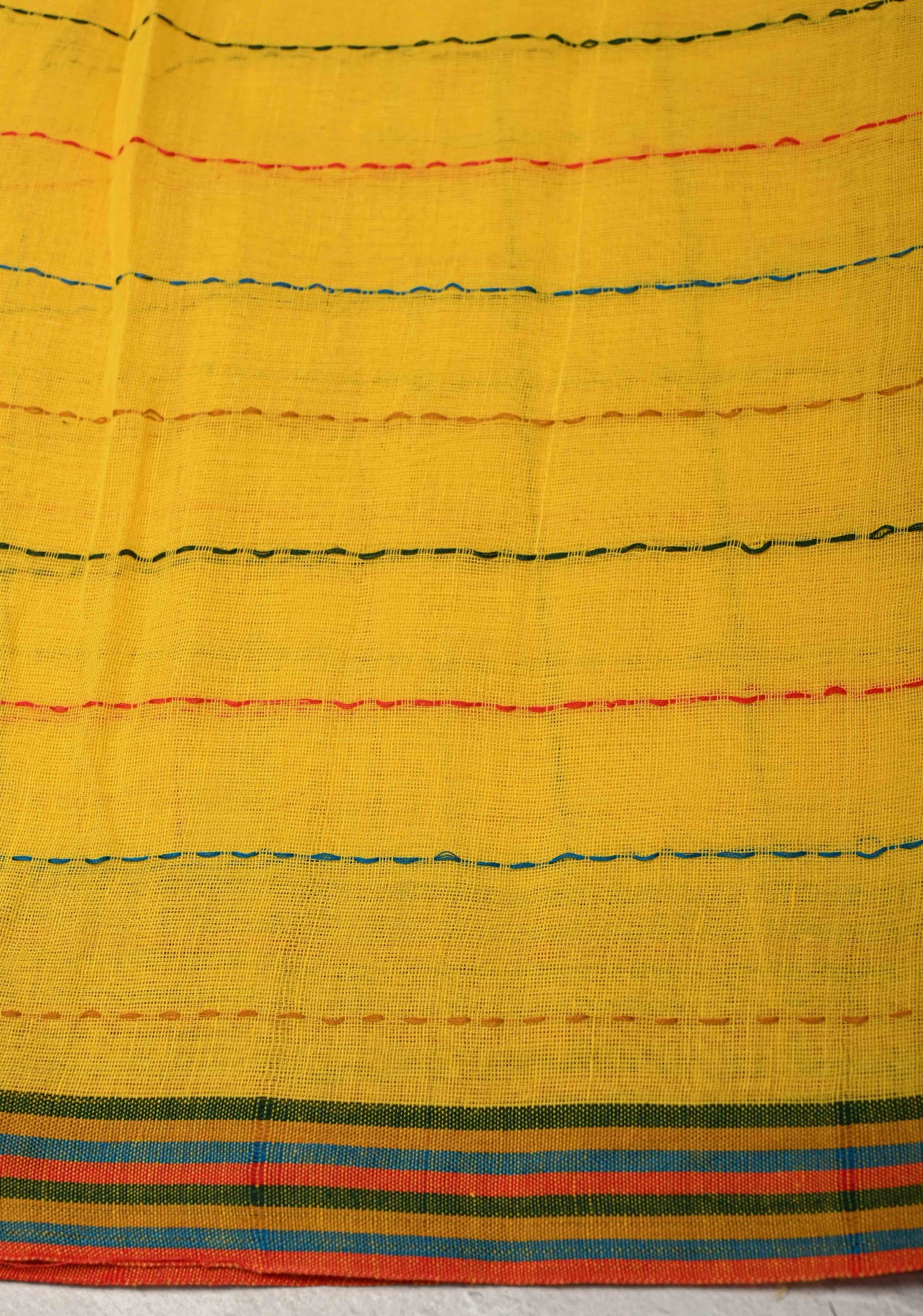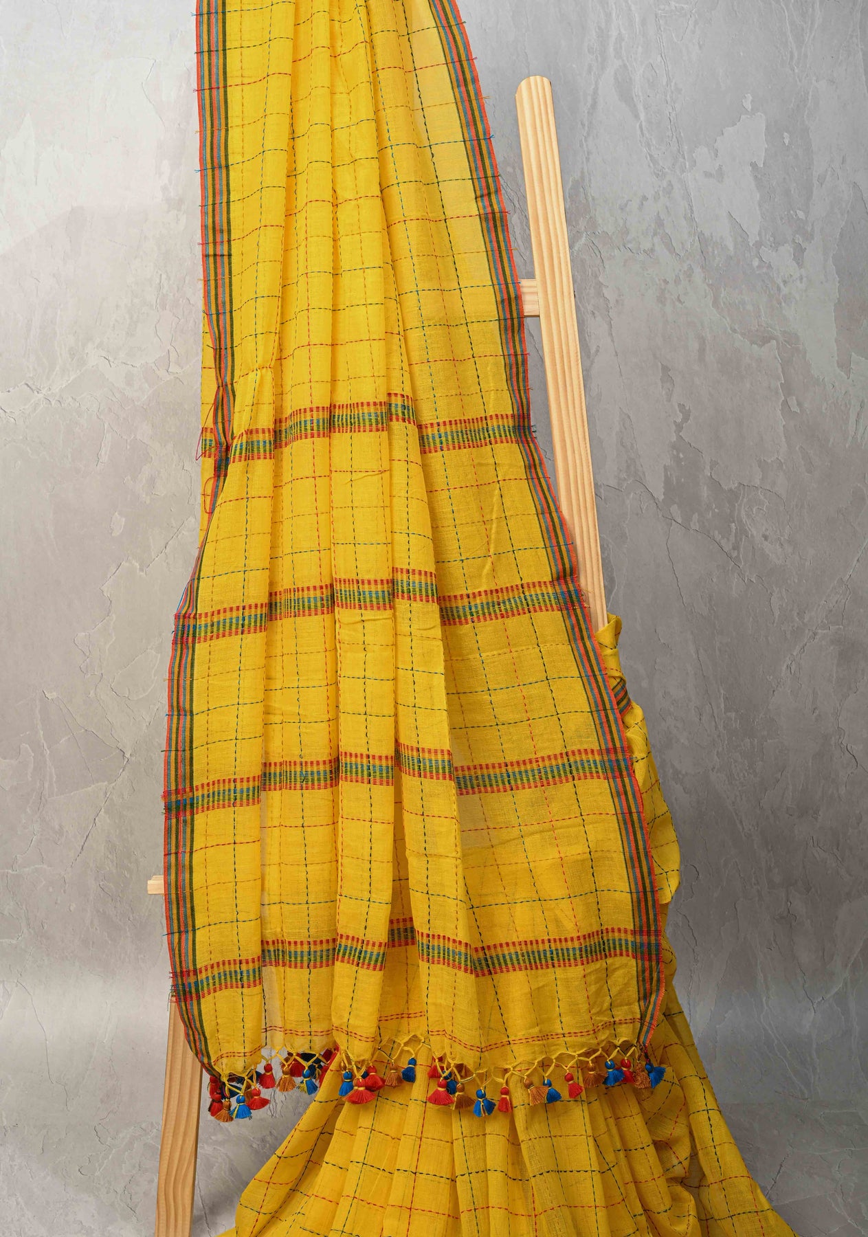 Brighten your day with this cheerful Yellow Bengal Cotton Saree, adorned with delicate running stitch embroidery that adds handcrafted charm. The vibrant yellow hue exudes freshness, while the playful multicolored tassels along the pallu offer a contemporary twist. Woven from soft, breathable Bengal cotton, this saree is lightweight and perfect for casual outings, workwear, or cultural gatherings. A blend of simplicity, comfort, and artisanal elegance.