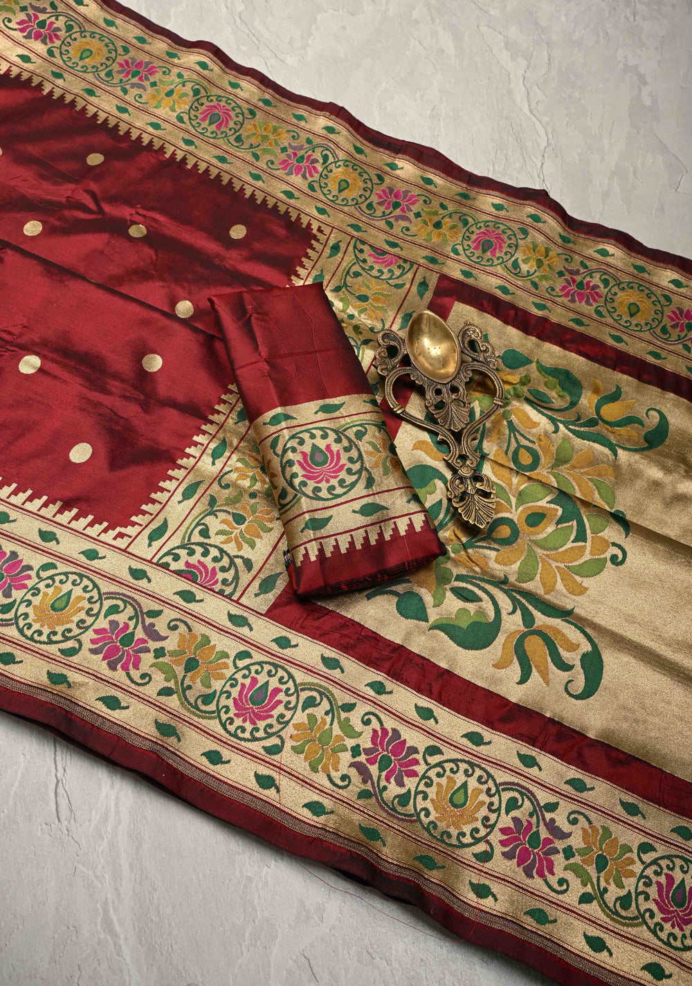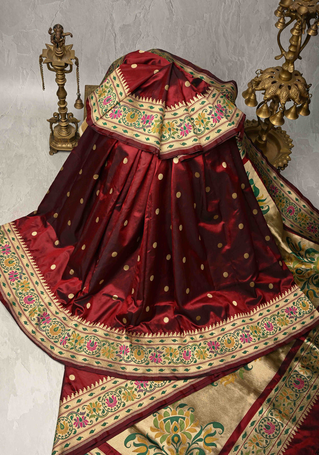 Deep Maroon Pure Banarasi Katan Silk Saree with Coin Buttas and Paithani Style Borders-Pallu | SILK MARK CERTIFIED
