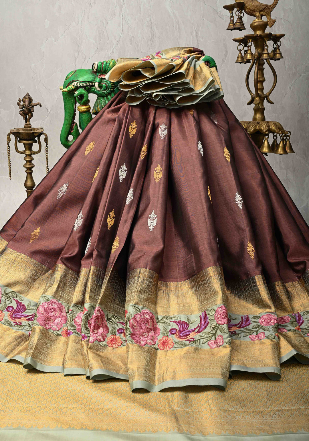 Dusty Brown Pure Banarasi Silk Saree with Floral Meenakari Buttas and Ornate Zari Border | SILK MARK CERTIFIED