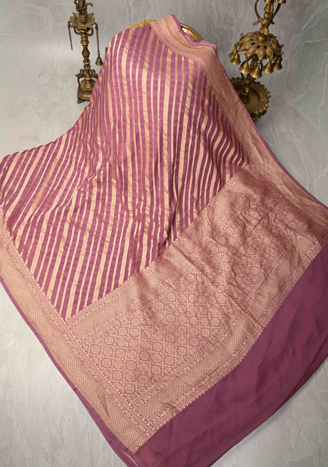 Mauve Banarasi Georgette Silk Saree with Diagonal Stipes and Zari Border | SILK MARK CERTIFIED